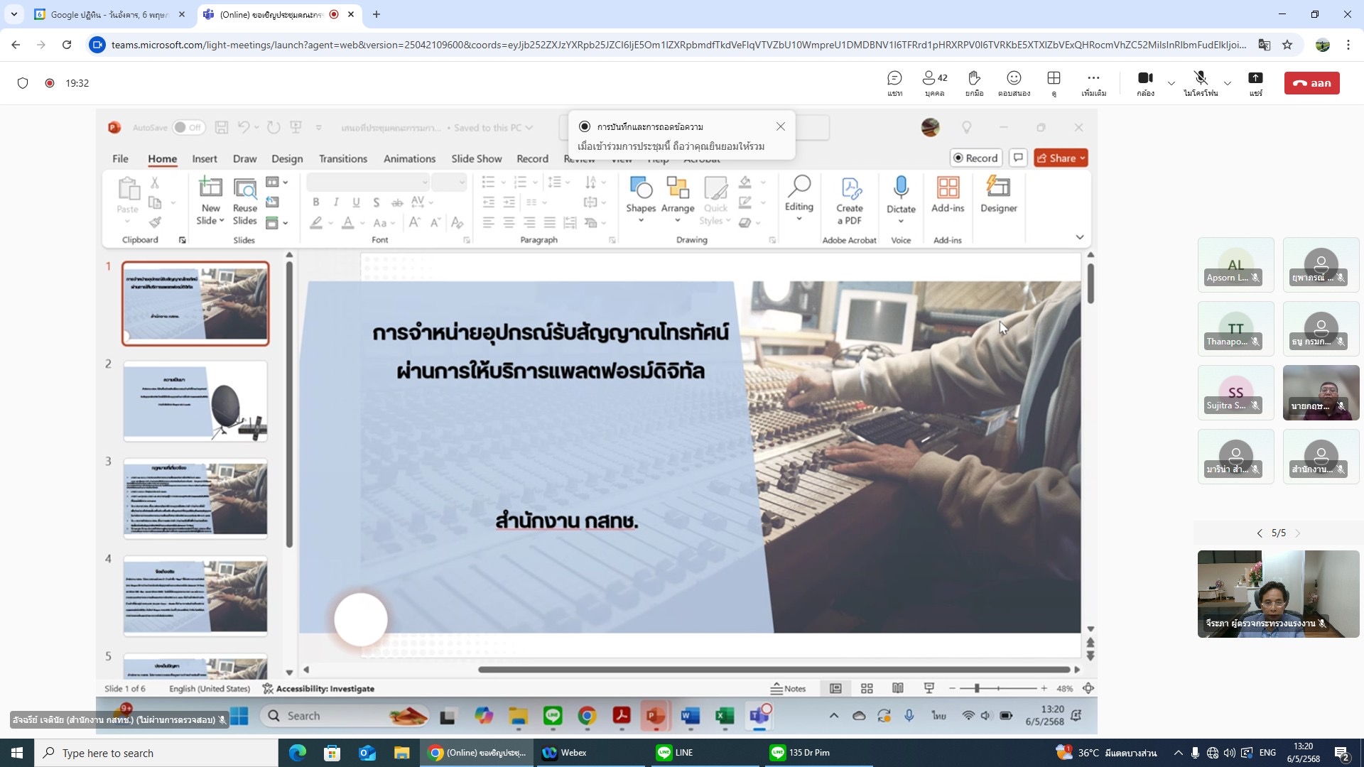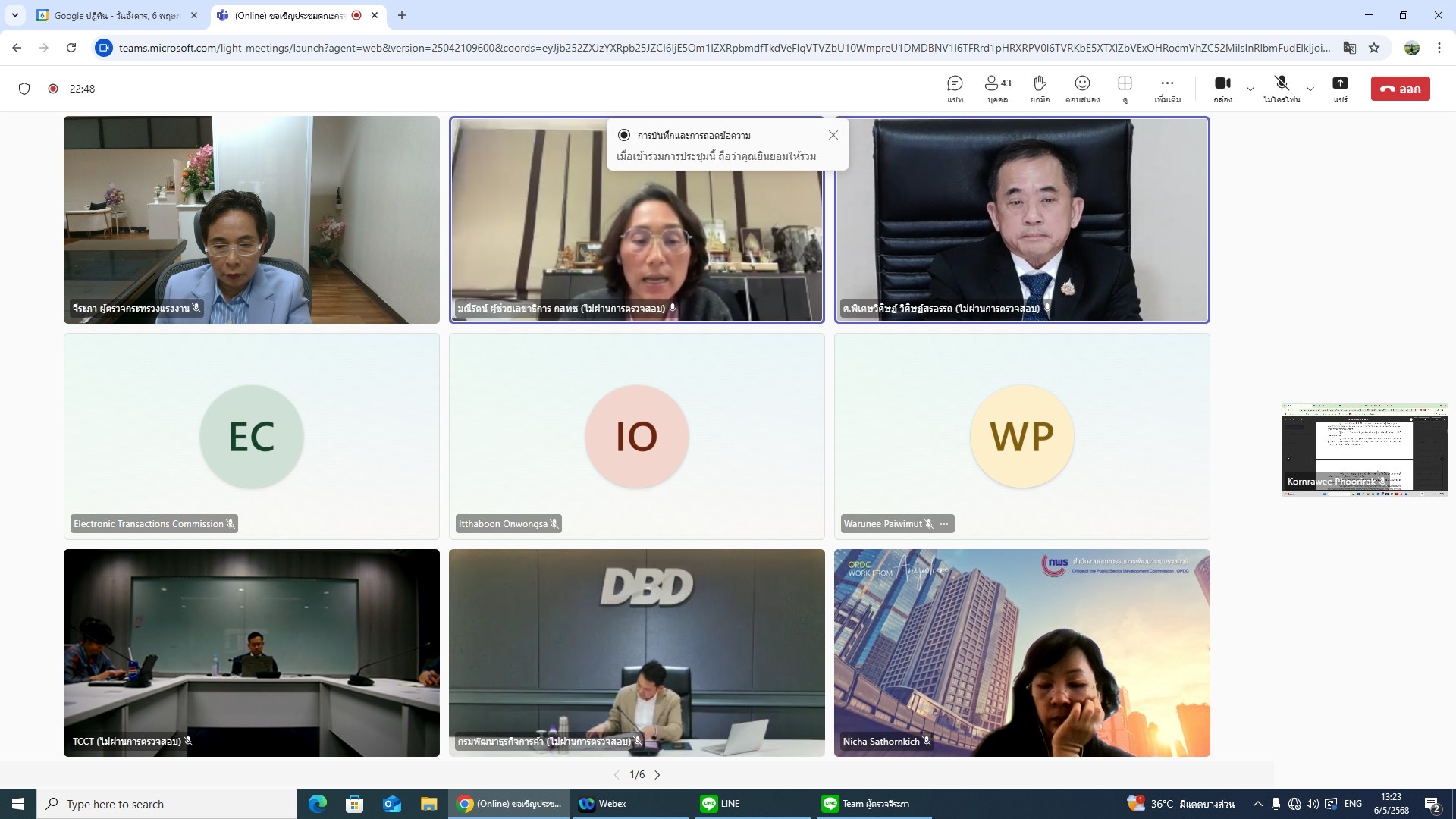 วันที่ 6 พฤษภาคม 2568 เวลา 13.00 น. นายบุญสงค์ ทัพชัยยุทธ์ ปลัดกระทรวงแรงงาน มอบหมายให้ นางสาวจีระภา บุญรัตน์ ผู้ตรวจราชการกระทรวงแรงงาน เข้าร่วมประชุมคณะกรรมการร่วมระหว่างหน่วยงานของรัฐ ครั้งที่ 1/2568 ผ่านสื่ออิเล็กทรอนิกส์ (e-Meeting) ด้วยระบบ MS Teams Meeting โดยมี ศาสตราจารย์พิเศษวิศิษฏ์ วิศิษฏ์สรอรรถ ปลัดกระทรวงดิจิทัลเพื่อเศรษฐกิจและสังคม เป็นประธานการประชุม ณ ห้องปฏิบัติราชการผู้ตรวจราชการกระทรวงแรงงาน ชั้น 8 อาคารกระทรวงแรงงาน