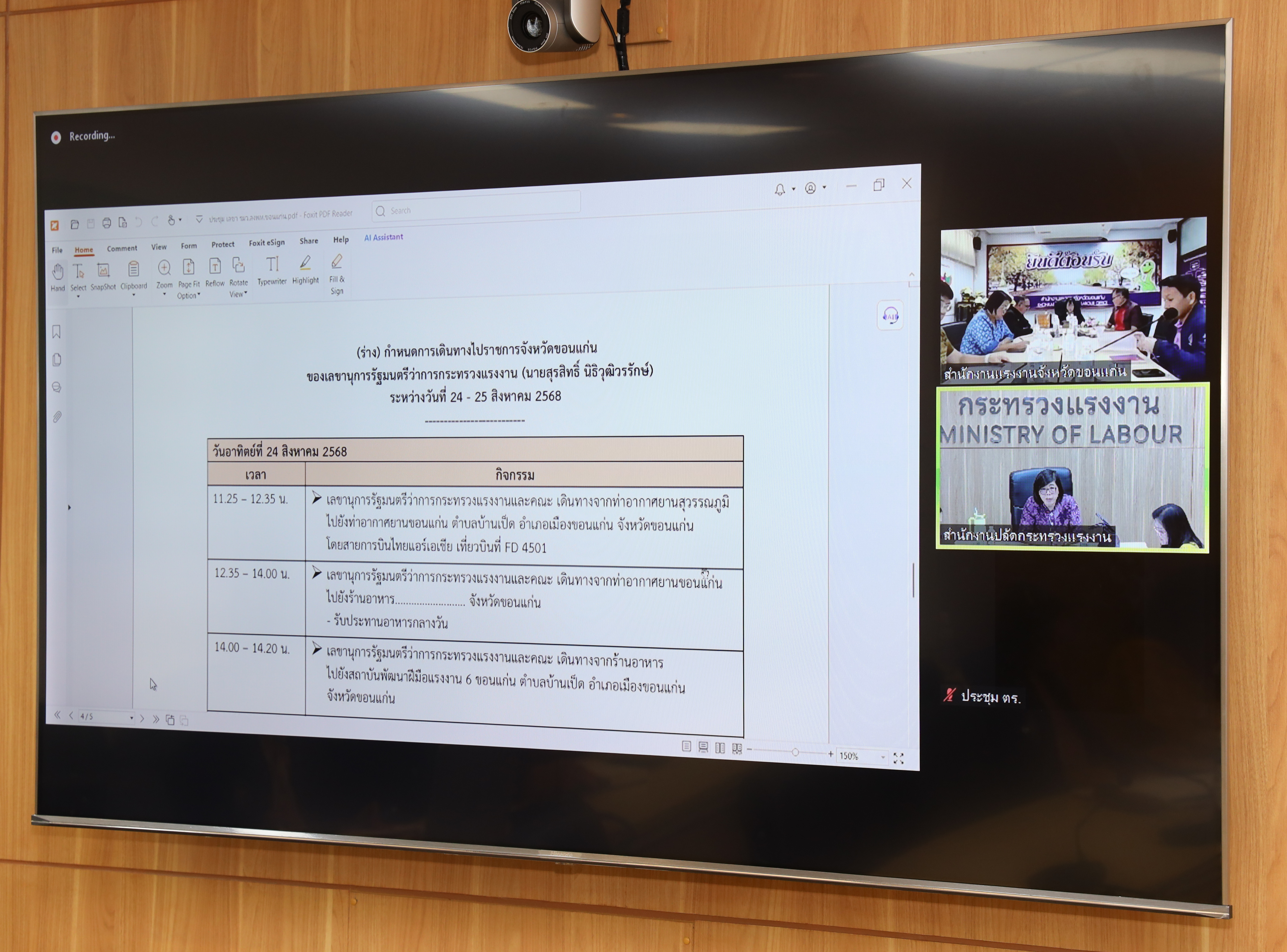 สำหรับการประชุมในครั้งนี้ ที่ประชุมได้พิจารณา (ร่าง) กำหนดการเดินทางไปราชการจังหวัดขอนแก่นของเลขานุการรัฐมนตรีว่าการกระทรวงแรงงาน ระหว่างวันที่ 24 – 25 สิงหาคม 2568 และการมอบหมายหน่วยงานที่เกี่ยวข้อง เพื่อเตรียมการด้านข้อมูลและการอำนวยความสะดวกในการเดินทางไปราชการของเลขานุการรัฐมนตรีว่าการกระทรวงแรงงาน ณ จังหวัดขอนแก่น