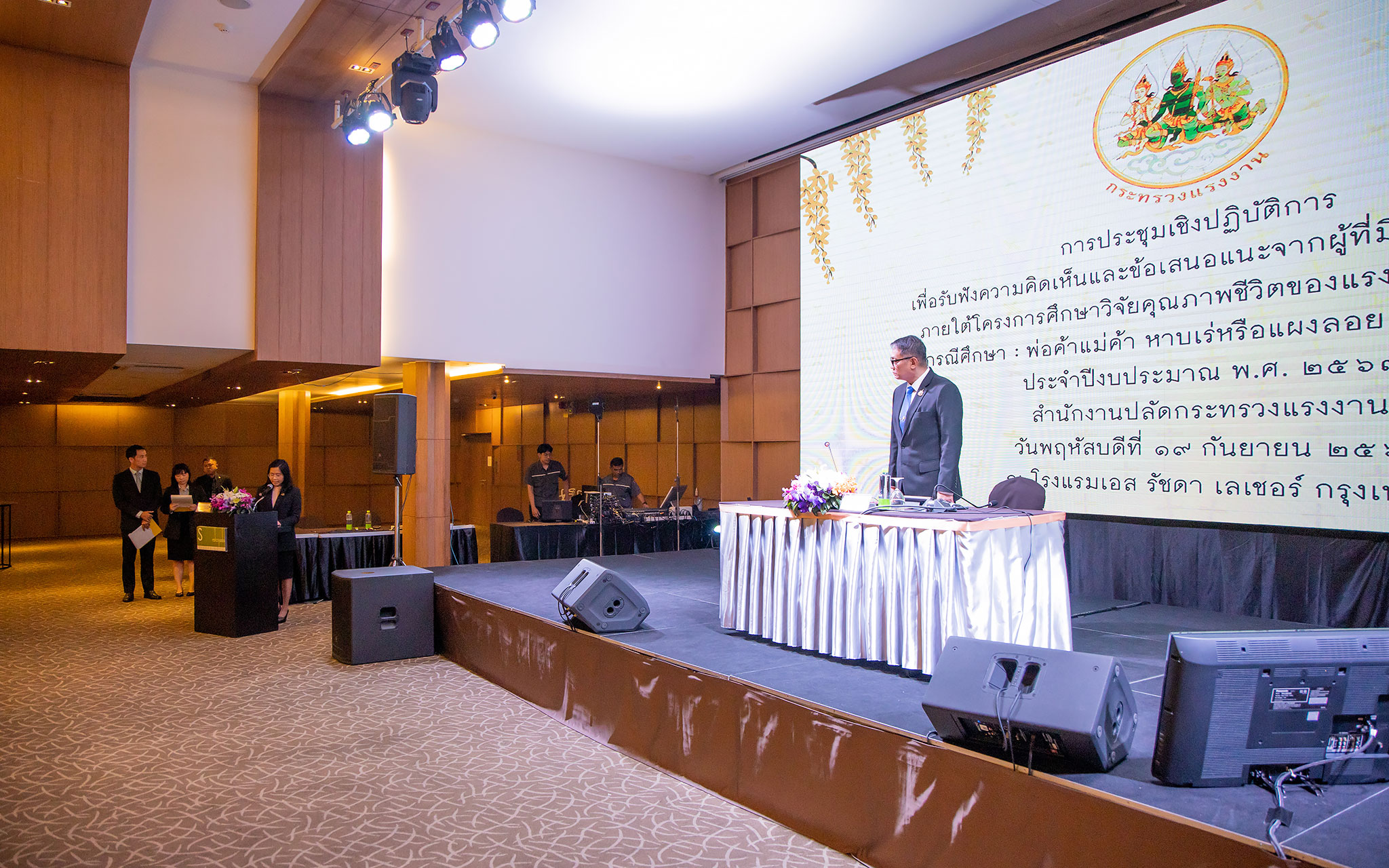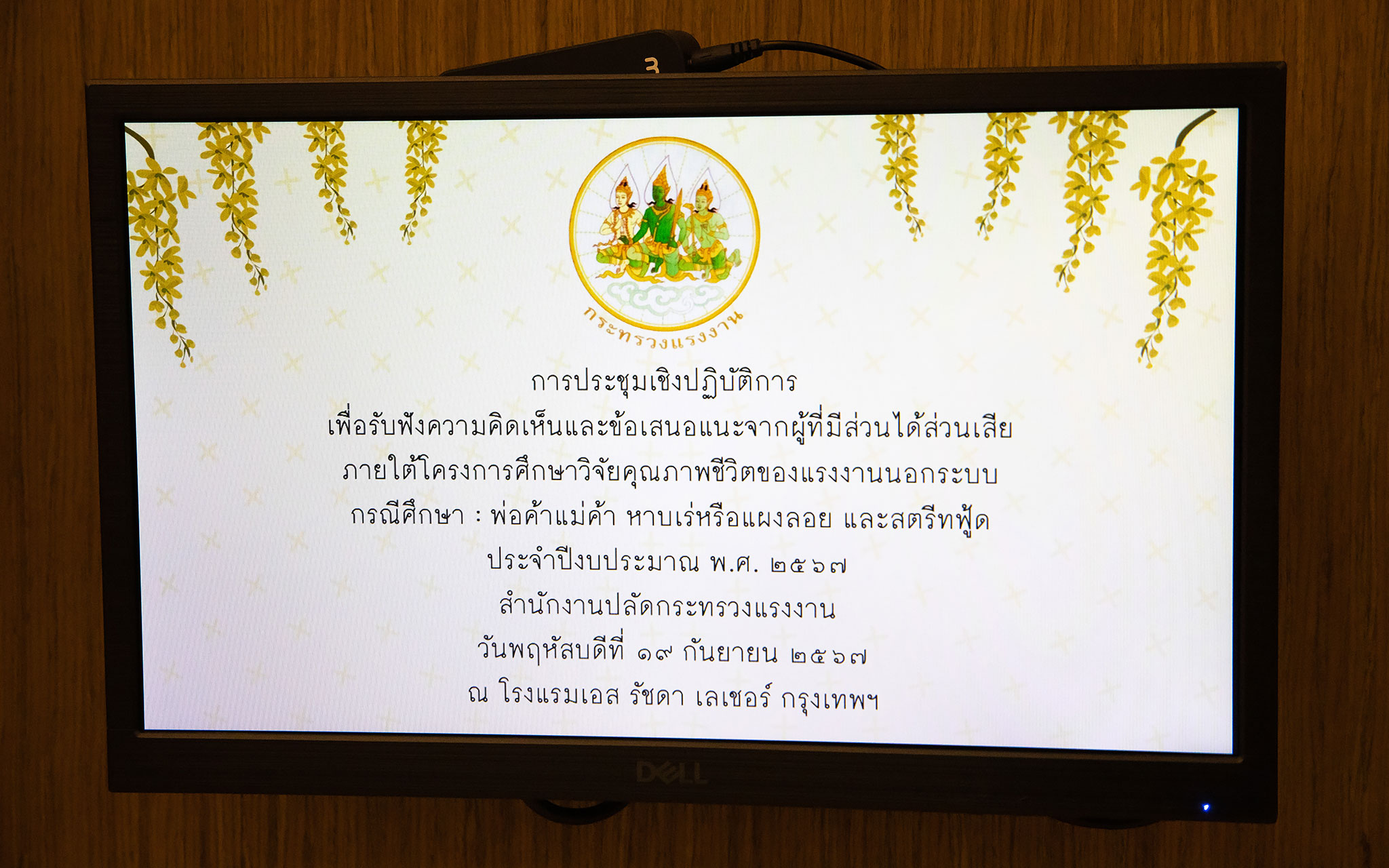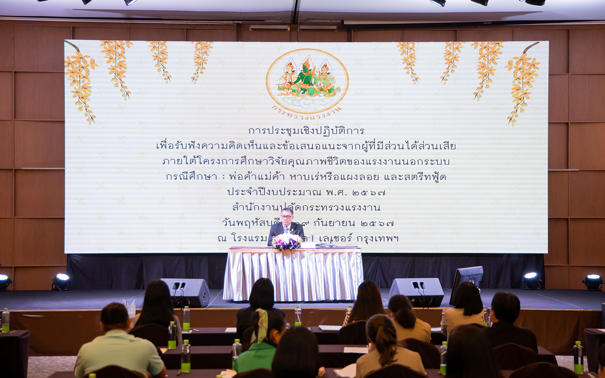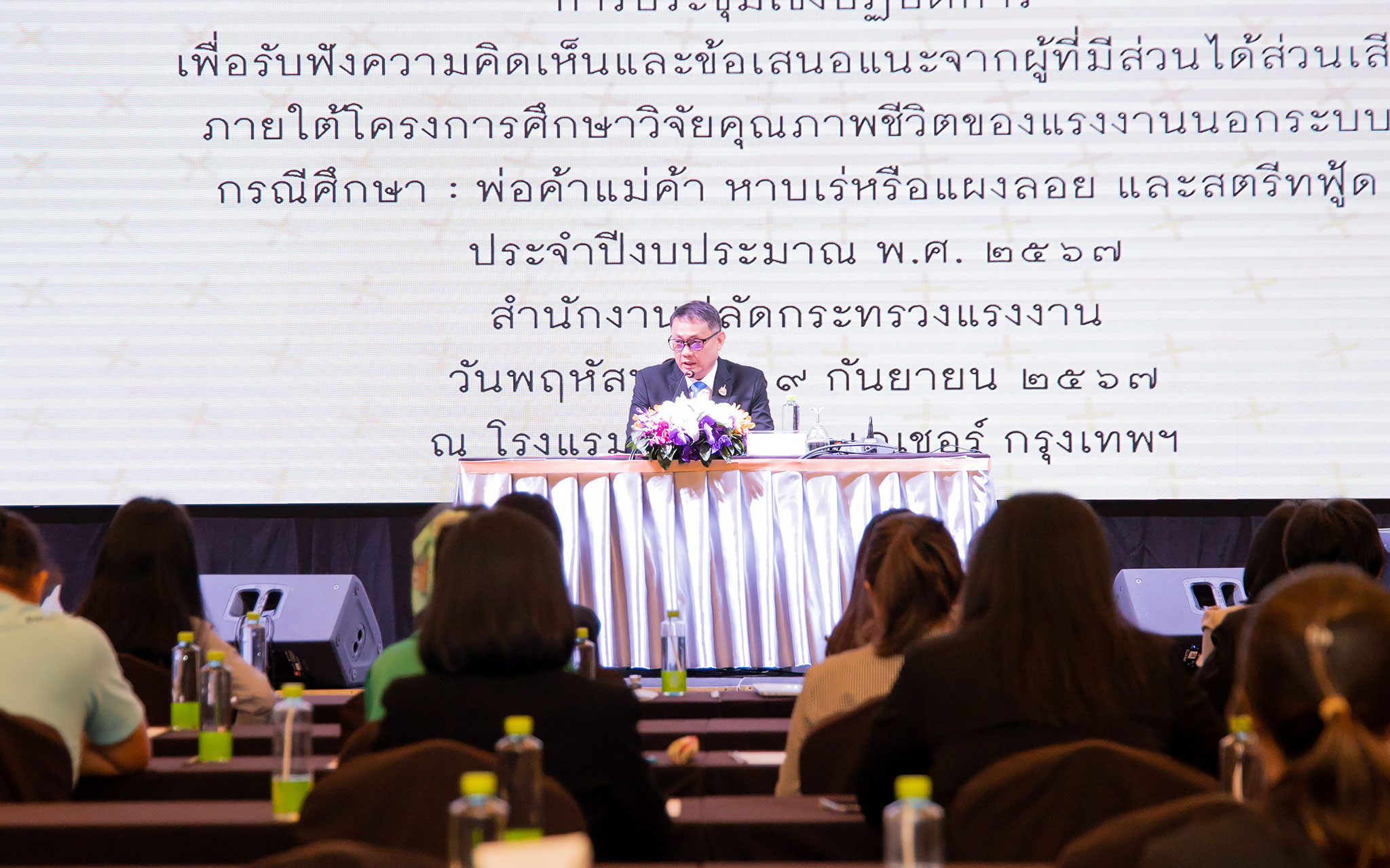 วันที่ 19 กันยายน 2567 เวลา 10.30 น. นายไพโรจน์ โชติกเสถียร ปลัดกระทรวงแรงงาน มอบหมายให้ เรือเอก สาโรจน์ คมคาย รองปลัดกระทรวงแรงงาน เป็นประธานพิธีเปิดประชุมเชิงปฏิบัติการเพื่อรับฟังความคิดเห็นและข้อเสนอแนะจากผู้ที่มีส่วนได้ส่วนเสีย ภายใต้โครงการศึกษาวิจัยคุณภาพชีวิตของแรงงานนอกระบบกรณีศึกษา : พ่อค้าแม่ค้า หาบเร่หรือแผงลอย และสตรีทฟู้ด ประจำปีงบประมาณ พ.ศ.2567 โดยมี นางสาวสุกัญญา ถมยา ผู้อำนวยการกองเศรษฐกิจการแรงงาน กล่าวรายงานวัตถุประสงค์การจัดงาน เครือข่ายแรงงานนอกระบบ ผู้แทนกลุ่มอาชีพพ่อค้าแม่ค้า หาบเร่ แผงลอย สตรีทฟู๊ด นักวิชาการ ผู้แทนหน่วยงานภาครัฐ ภาคเอกชน และหน่วยงานที่เกี่ยวข้อง ร่วมให้การต้อนรับ ณ ห้องแกรนด์บอลรูม ชั้น 2 โรงแรมเอส รัชดา เลเชอร์ ถนนรัชดาภิเษก เขตดินแดง กรุงเทพมหานคร