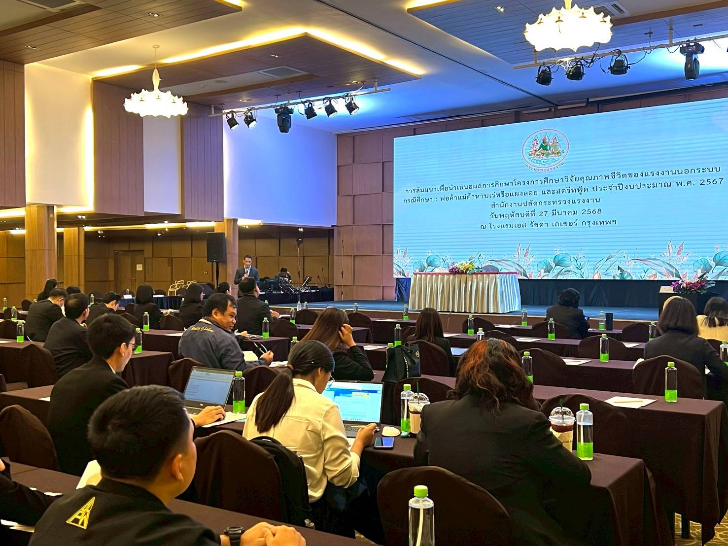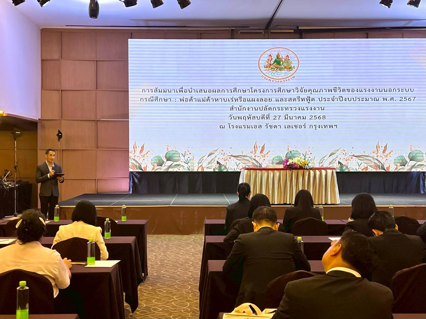 วันที่ 27 มีนาคม 2568 เวลา 09.30 น. นายบุญสงค์ ทัพชัยยุทธ์ ปลัดกระทรวงแรงงาน มอบหมายให้ นายณัฐวุฒิ ภัทรประยูร จัดหางานจังหวัดร้อยเอ็ด รักษาการในตำแหน่งที่ปรึกษาวิชาการแรงงาน เป็นประธานเปิดการสัมมนาเพื่อนำเสนอผลการศึกษาโครงการศึกษาวิจัยคุณภาพชีวิตของแรงงานนอกระบบ กรณีศึกษา : พ่อค้าแม่ค้าหาบเร่หรือแผงลอย และสตรีทฟู้ด ประจำปีงบประมาณ พ.ศ. 2567 ณ ห้องแกรนด์บอลรูม ชั้น 2 โรงแรมเอส รัชดา เลเชอร์ กรุงเทพฯ