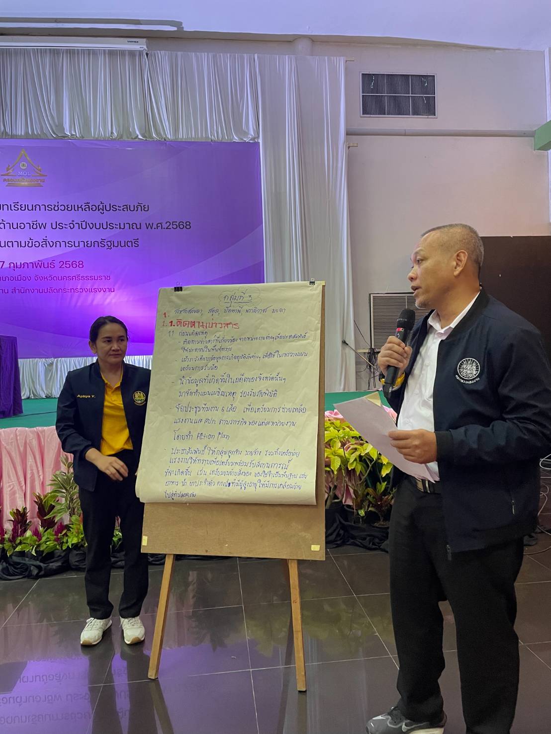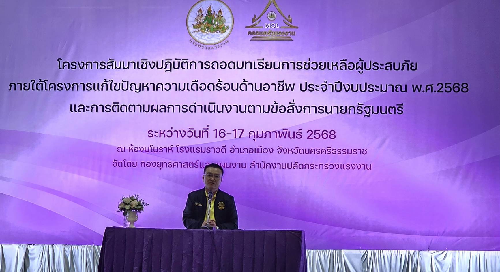 วันที่ 17 กุมภาพันธ์ 2568 เวลา 14.00 น. นายบุญสงค์ ทัพชัยยุทธ์ ปลัดกระทรวงแรงงาน มอบหมายให้ นายสันติ นันตสุวรรณ ผู้ตรวจราชการกระทรวงแรงงาน รักษาราชการแทน รองปลัดกระทรวงแรงงาน เป็นประธานปิดโครงการสัมมนาเชิงปฏิบัติการเพื่อถอดบทเรียนการช่วยเหลือผู้ประสบอุทกภัย ภายใต้โครงการแก้ไขปัญหาความเดือดร้อนด้านอาชีพ ประจำปีงบประมาณ พ.ศ.2568 และการติดตามผลการดำเนินงานตามข้อสั่งการนายกรัฐมนตรี โดยมีหัวหน้าส่วนราชการหน่วยงานสังกัดกระทรวงแรงงาน 14 จังหวัดภาคใต้ เข้าร่วม ณ โรงแรมราวดี อำเภอเมืองนครศรีธรรมราช จังหวัดนครศรีธรรมราช โอกาสนี้ รักษาราชการแทน รองปลัดกระทรวงแรงงาน ได้รับฟังการระดมสมองและปิดการประชุม โดยได้ให้ข้อเสนอแนะกับหัวหน้าส่วนราชการสังกัดกระทรวงแรงงาน 14 จังหวัดภาคใต้ในการร่วมกันจัดทำแผนป้องกันภัยพิบัติประจำปีของแต่ละหน่วยงานให้แล้วเสร็จภายใน 60 วัน เพื่อใช้เป็นแนวทางในการแก้ไขปัญหากรณีเกิดเหตุภัยพิบัติต่างๆ ในพื้นที่ได้ทันด้วยเวลาอันรวดเร็ว โดยใช้แนวทางการแก้ไขปัญหาอุทกภัยในจังหวัดเชียงราย และจังหวัดนครศรีธรรมราชเป็นแบบ ซึ่งเป็นไปตามนโยบายของรัฐมนตรีว่าการกระทรวงแรงง