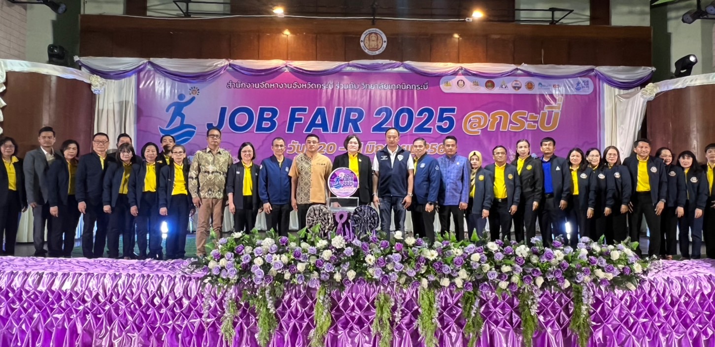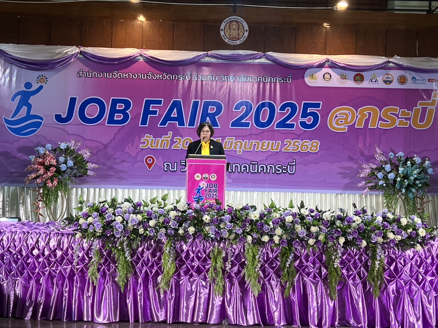 วันที่ 20 มิถุนายน 2568 เวลา 11.00 น. นายบุญสงค์ ทัพชัยยุทธ์ ปลัดกระทรวงแรงงาน มอบหมายให้ นางสาวบุณยวีร์ ไขว้พันธุ์ หัวหน้าผู้ตรวจราชการกระทรวงแรงงาน เป็นประธานเปิดงาน Job Fair 2025@กระบี่ ประจำปีงบประมาณ พ.ศ.2568 โดยมีนายยุทธนา บัวจุน ผู้ตรวจราชการกรมการจัดหางาน กล่าวรายงาน นายปรีชา สอิ้งทอง นายอำเภอเมืองกระบี่ นายวันชัย พันเรือง ผู้อำนวยการวิทยาลัยเทคนิคกระบี่ กล่าวต้อนรับ ณ วิทยาลัยเทคนิคกระบี่ ตำบลปากน้ำ อำเภอเมืองกระบี่ จังหวัดกระบี่