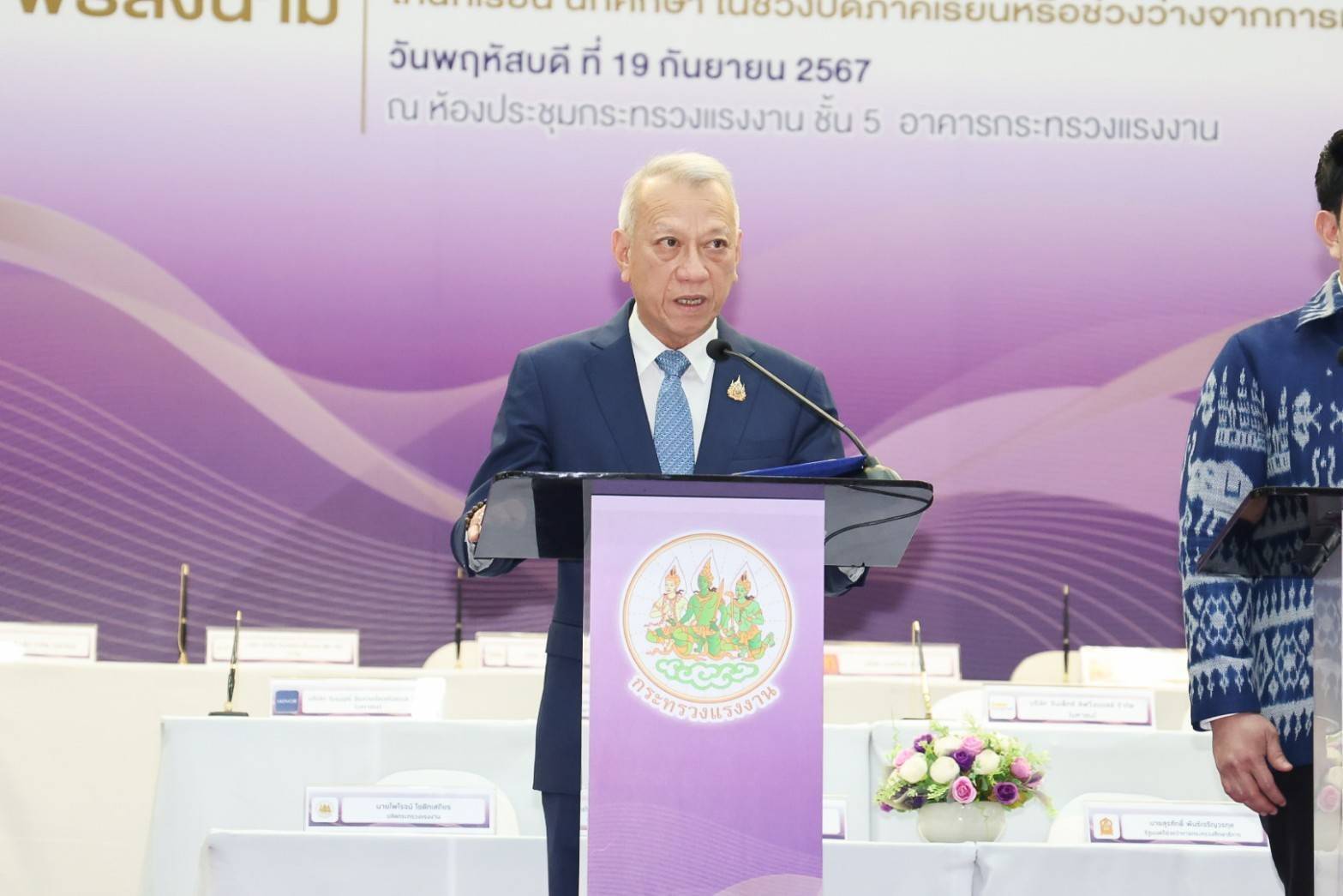 วันที่ 19 กันยายน 2567 นายไพโรจน์ โชติกเสถียร ปลัดกระทรวงแรงงาน ร่วมเป็นเกียรติ ในพิธีลงนามบันทึกความเข้าใจว่าด้วยความร่วมมือด้านการส่งเสริมการมีงานทำให้นักเรียน นักศึกษา ช่วงปิดภาคเรียน โดยมีนายพิพัฒน์ รัชกิจประการ รัฐมนตรีว่าการกระทรวงแรงงาน และนายสุรศักดิ์ พันธ์เจริญวรกุล รัฐมนตรีช่วยว่าการกระทรวงศึกษาธิการ เป็นประธานในพิธีลงนามฯ นายสมชาย มรกตศรีวรรณ อธิบดีกรมการจัดหางาน กล่าวรายงาน ผู้บริหารจากหน่วยงานในสังกัดกระทรวงแรงงาน ผู้แทนจากกระทรวงศึกษาธิการ และผู้แทนจากสถานประกอบ 22 แห่ง ร่วมลงนาม ผู้บริหารระดับสูงกระทรวงแรงงาน ร่วมเป็นเกียรติในงานด้วย ณ ห้องประชุม ชั้น 5 กระทรวงแรงงาน