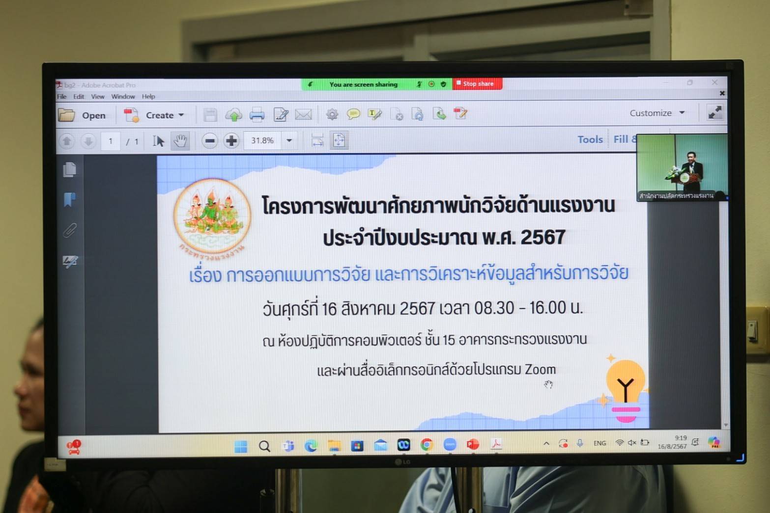 วันที่ 16 สิงหาคม 2567 เวลา 08.45 น.นายไพโรจน์ โชติกเสถียร ปลัดกระทรวงแรงงาน เป็นประธานเปิดโครงการพัฒนาศักยภาพนักวิจัยด้านแรงงาน ประจำปีงบประมาณ พ.ศ.2567 เรื่อง การออกแบบการวิจัย และการวิเคราะห์ข้อมูลสำหรับการวิจัย โดยมี นางสาวกรจิรัฏฐ์ พงจันทร์ศธร ผู้ช่วยปลัดกระทรวงแรงงาน ร่วมเป็นเกียรติในพิธีเปิดด้วย ณ ห้องปฏิบัติการคอมพิวเตอร์ ชั้น 15 อาคารกระทรวงแรงงาน และผ่านสื่ออิเล็กทรอนิกส์ด้วยโปรแกรม Zoom