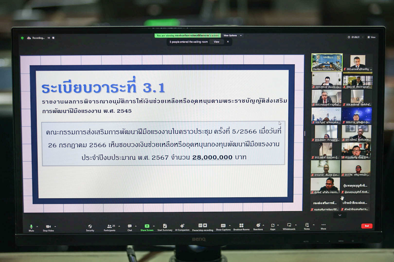วันที่ 30 เมษายน 2567 เวลา 13.30 น. นายไพโรจน์ โชติกเสถียร ปลัดกระทรวงแรงงาน เป็นประธานการประชุม คณะกรรมการส่งเสริมการพัฒนาฝีมือแรงงาน ครั้งที่ 3/2567 โดยประชุมผ่านสื่ออิเล็กทรอนิกส์ ณ ห้องประชุมปกรณ์ อังศุสิงห์ ชั้น 10 อาคารกรมพัฒนาฝีมือแรงงาน