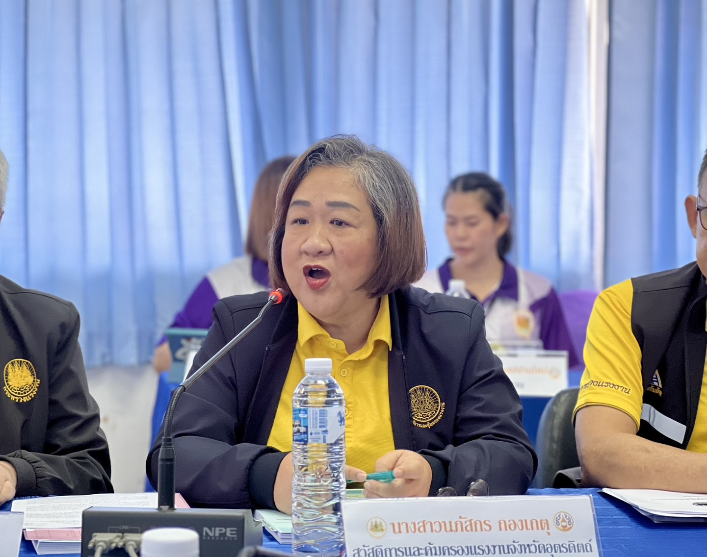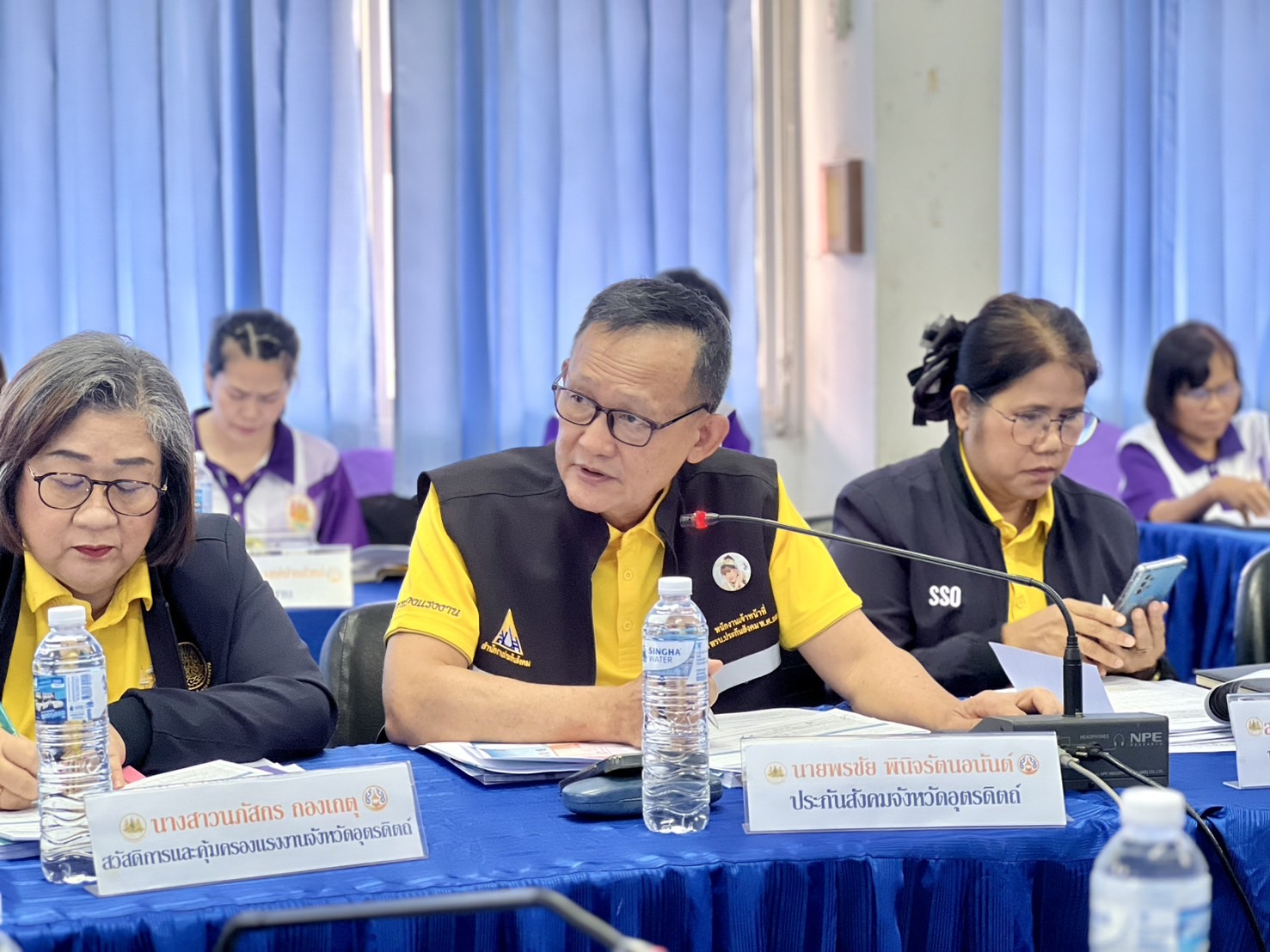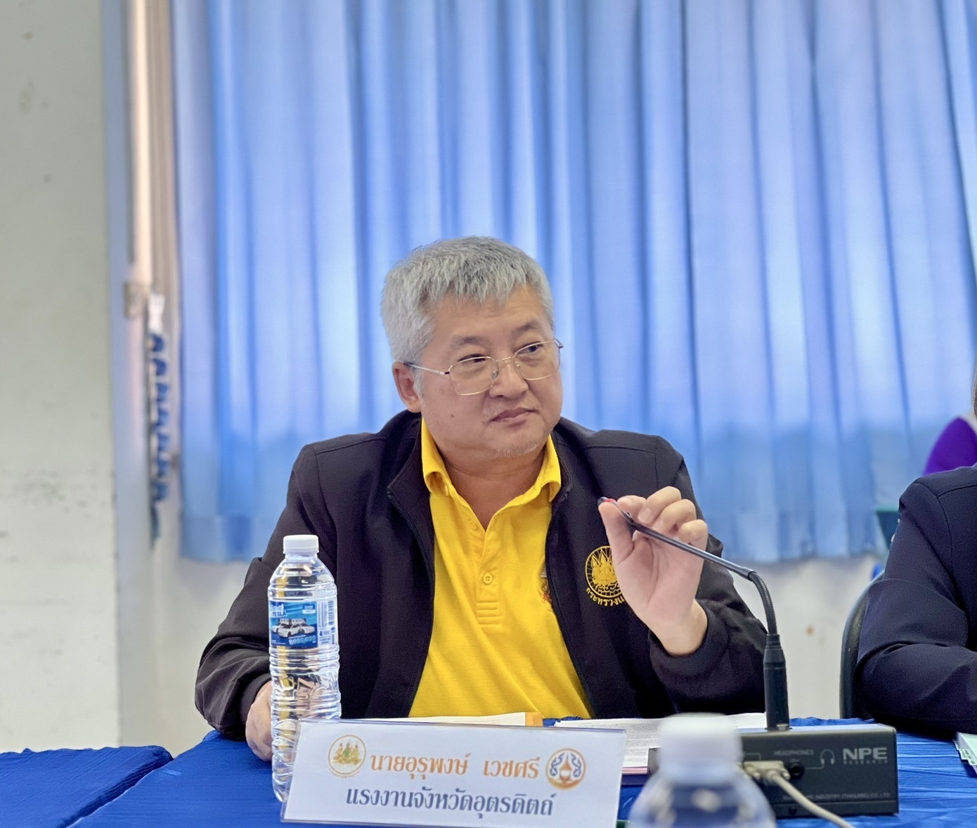 จากนั้น หัวหน้าผู้ตรวจราชการกระทรวงแรงงาน ได้ประชุมหัวหน้าส่วนราชการสังกัดกระทรวงแรงงานจังหวัดอุตรดิตถ์ เพื่อตรวจติดตาม และประเมินผลการปฏิบัติงานตามแผนการตรวจราชการของผู้ตรวจราชการกระทรวงแรงงาน ประจำปีงบประมาณ พ.ศ. 2568 รอบที่ 3 (Monitoring/Evaluation) ณ ห้องประชุมสำนักงานพัฒนาฝีมือแรงงาน พร้อมตรวจติดตามการบูรณาการเครือข่ายระหว่างบัณฑิตแรงงานและอาสาสมัครแรงงาน อำเภอลับแล (8 ตำบล) และตรวจเยี่ยมโครงการเพิ่มประสิทธิภาพการให้บริการด้านแรงงานของบัณฑิตแรงงานในพื้นที่กิจกรรม หนึ่งอำเภอ หนึ่งกลุ่มอาชีพ มั่นคง มั่งคั่ง และยั่งยืน การสานกระติบข้าวเหนียวของแรงงานนอกระบบและกลุ่มผู้สูงอายุ ณ ศูนย์การเรียนรู้ตำบลนานกกก อำเภอลับแล จังหวัดอุตรดิตถ์