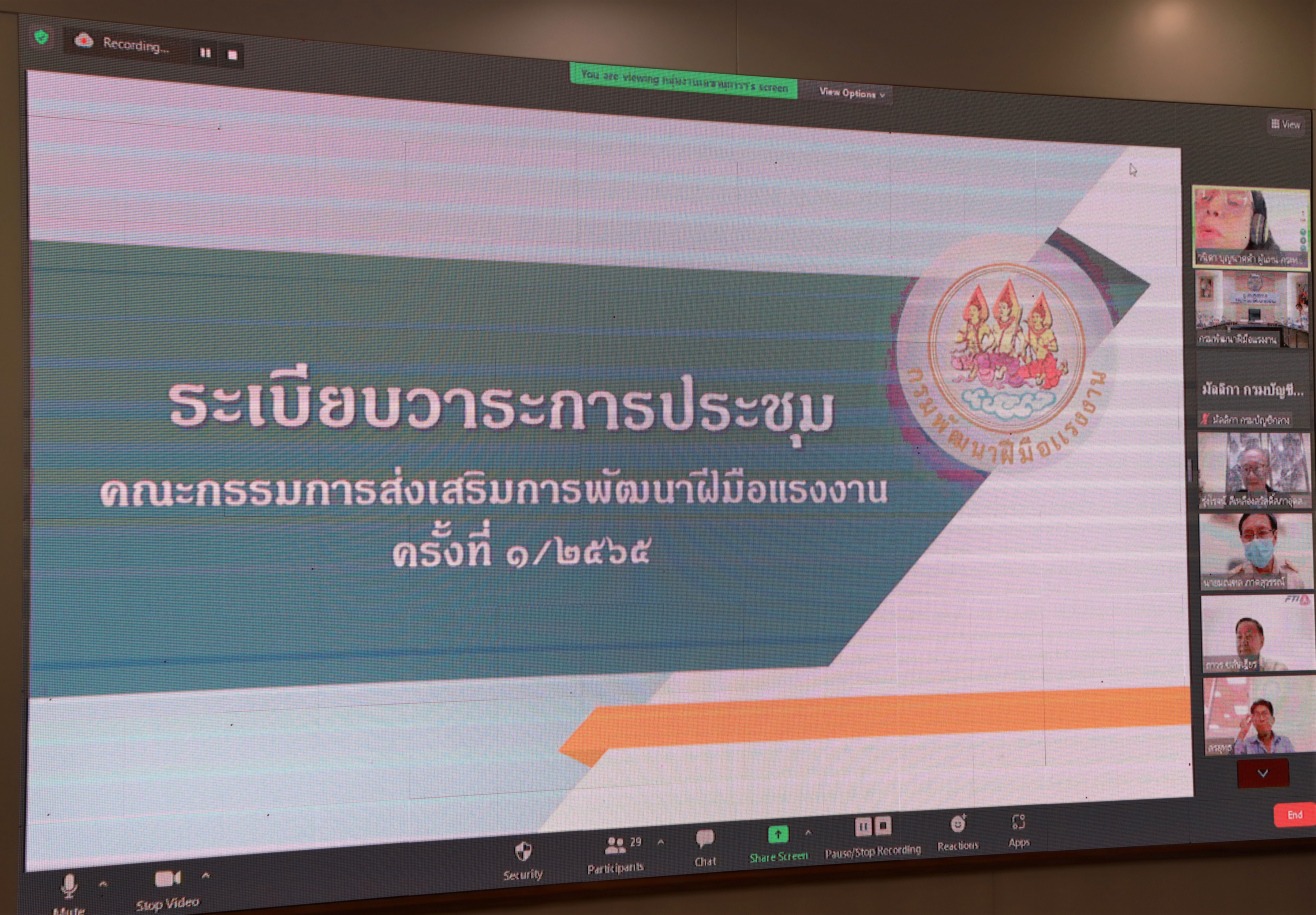 วันที่ 28 กุมภาพันธ์ 2565 เวลา 09:30 น. นายบุญชอบ สุทธมนัสวงษ์ ปลัดกระทรวงแรงงานเป็นประธานการประชุมคณะกรรมการส่งเสริมการพัฒนาฝีมือแรงงาน ครั้งที่ 1/2565 ผ่านสื่ออิเล็กทรอนิกส์โดยที่ประชุมได้พิจารณา ดังนี้ 1. แต่งตั้งคณะอนุกรรมการพิจารณากลั่นกรองร่างกฏหมายและเรื่องอุทธรณ์ (กลุ่มกฏหมาย) 2. กำหนดสาขาอาชีพที่อาจเป็นอันตรายต่อสาธารณะหรือต้องใช้ผู้มีความรู้ความสามารถ 3. แต่งตั้งคณะอนุกรรมการจัดทำรายละเอียดเพื่อจำแนกและกำหนดระดับความรู้ความสามารถกำหนดช่วงอัตราจ้างที่เหมาะสมกับระดับความรู้ความสามารถของผู้ประกอบอาชีพในสาขาอาชีพภาคบริการ สาขาช่างเสริมสวย 4. แต่งตั้งคณะอนุกรรมการการเทคนิคการแข่งขันฝีมือแรงงานนานาชาติ ครั้งที่ 46 จำนวน 12 สาขา 5. ขอรับรองมาตราฐานฝีมือแรงงานตามมาตรา 26 แห่งพระราชบัญญัติส่งเสริมการพัฒนาฝีมือแรงงาน พ.ศ 2545 6. มาตราฐานฝีมือแรงงานแห่งชาติ และ 7. คุณสมบัติของผู้เข้ารับการทดสอบมาตราฐานฝีมือแรงงานแห่งชาติ ระดับ 1-4 ณ ห้องประชุมปกรณ์ อังศุสิงห์ ชั้น 10 อาคารกรมพัฒนาฝีมือแรงงาน