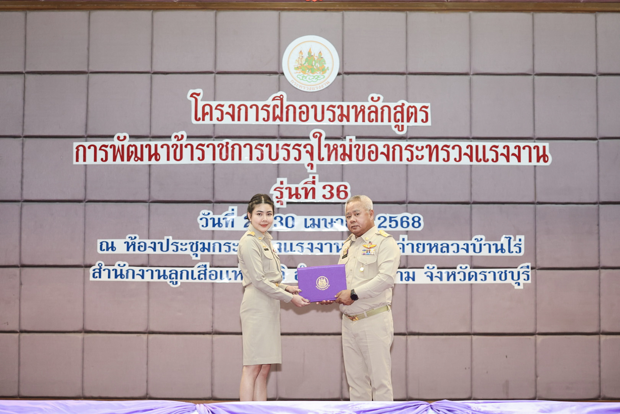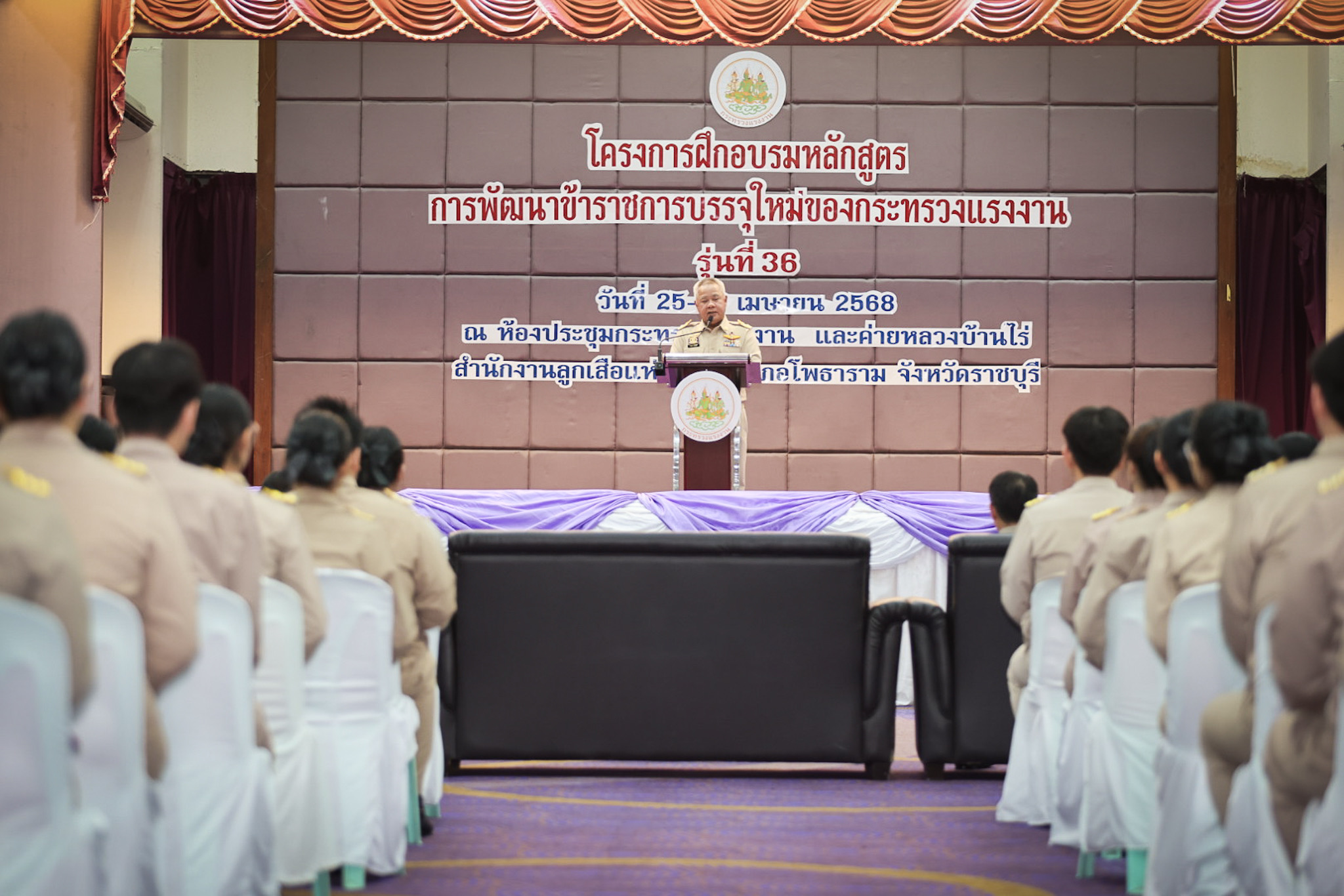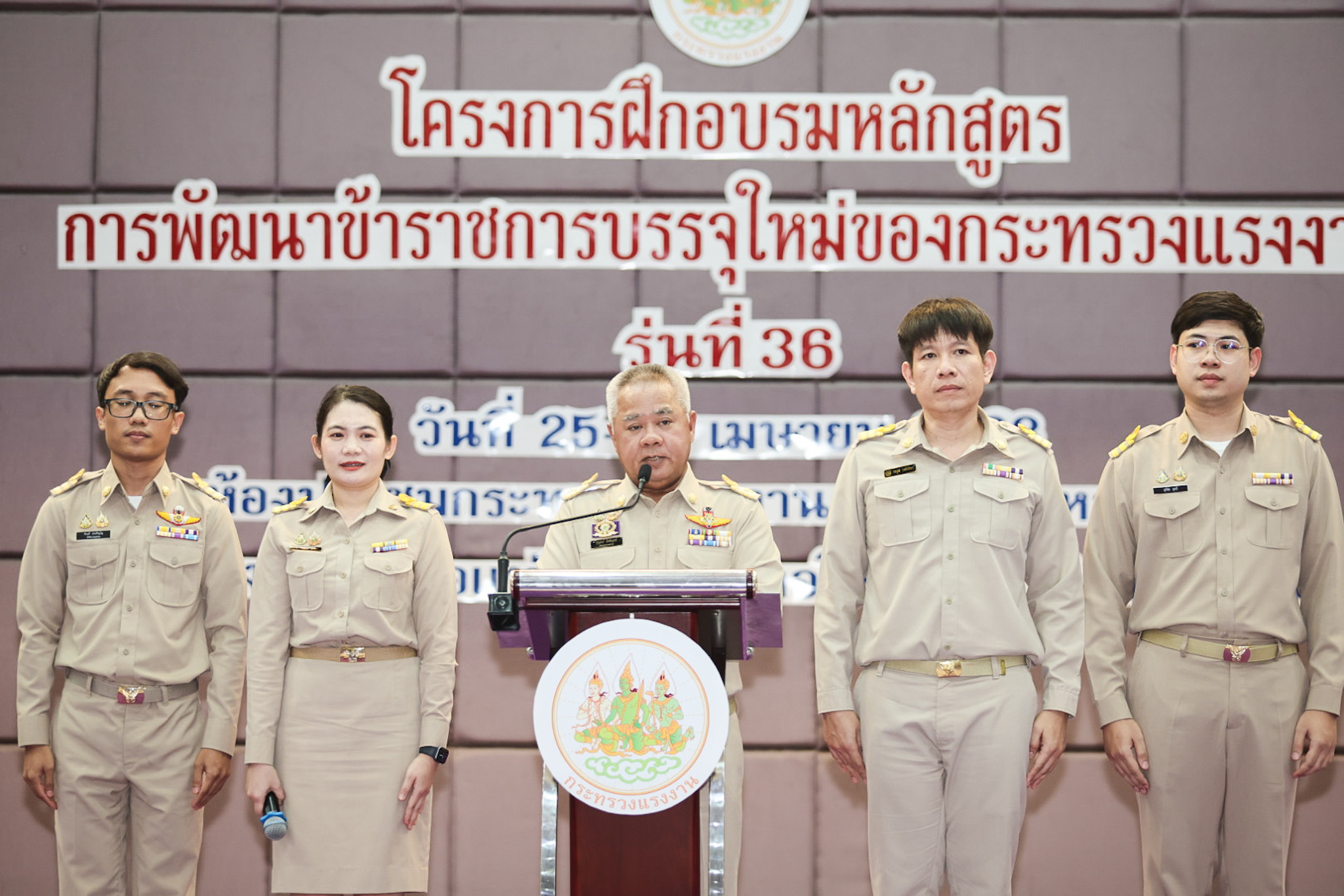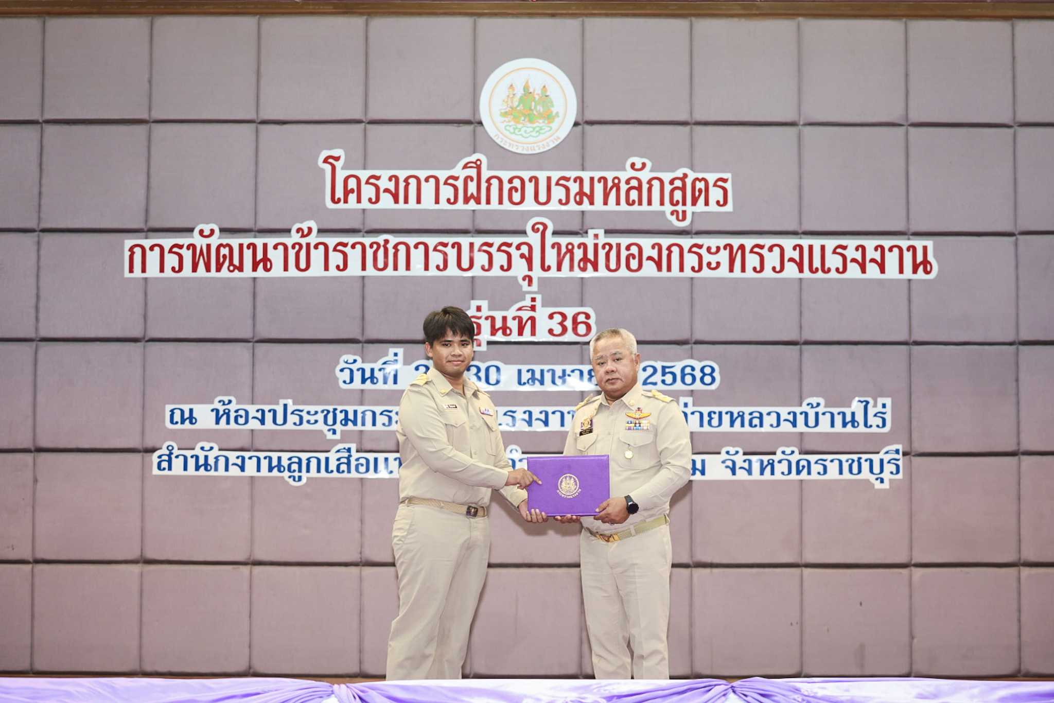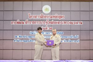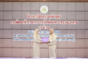 สำหรับโครงการฝึกอบรมหลักสูตรการพัฒนาข้าราชการบรรจุใหม่ของกระทรวงแรงงาน รุ่นที่ 36 ดำเนินการตามแนวทางที่สำนักงาน ก.พ. กำหนด มีผู้เข้ารับการฝึกอบรม 218 คน ดำเนินการตั้งแต่วันที่ 25 – 30 เมษายน 2568 รวมระยะเวลาฝึกอบรม 6 วัน โดยผู้เข้ารับการฝึกอบรมได้เรียนรู้เนื้อหาวิชาในภาควิชาการและกิจกรรมกลุ่มสัมพันธ์จากวิทยากรผู้ทรงคุณวุฒิ รวมทั้งมีการลงมือปฏิบัติจริงในห้องเรียนและนอกห้องเรียน ซึ่งผู้เข้ารับการฝึกอบรมทุกคนได้เข้าร่วมกิจกรรมตามที่กำหนด และมีส่วนร่วมในกิจกรรมต่าง ๆ เป็นอย่างดี ทำให้การฝึกอบรมในครั้งนี้เป็นไปด้วยความเรียบร้อย บรรลุตามวัตถุประสงค์ที่ตั้งไว้ในโครงการ
