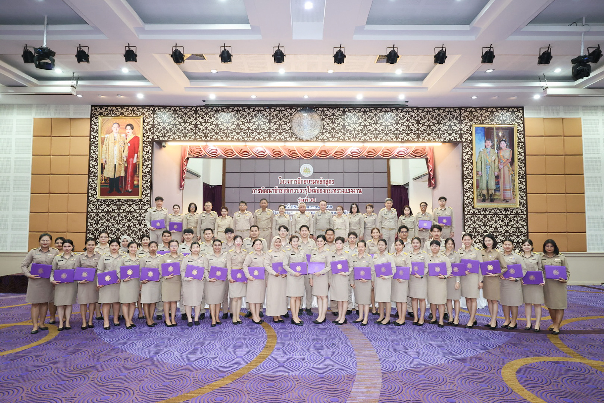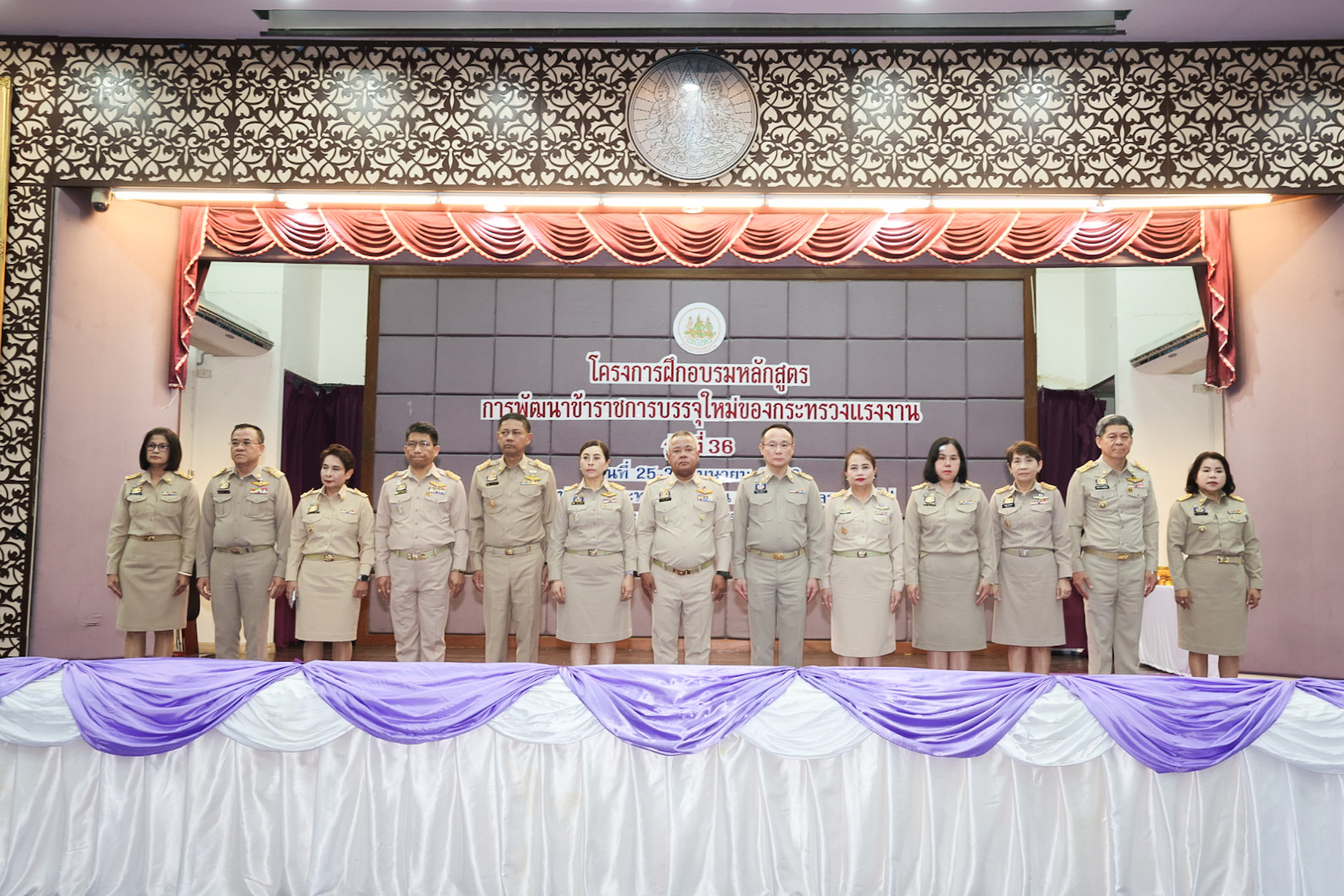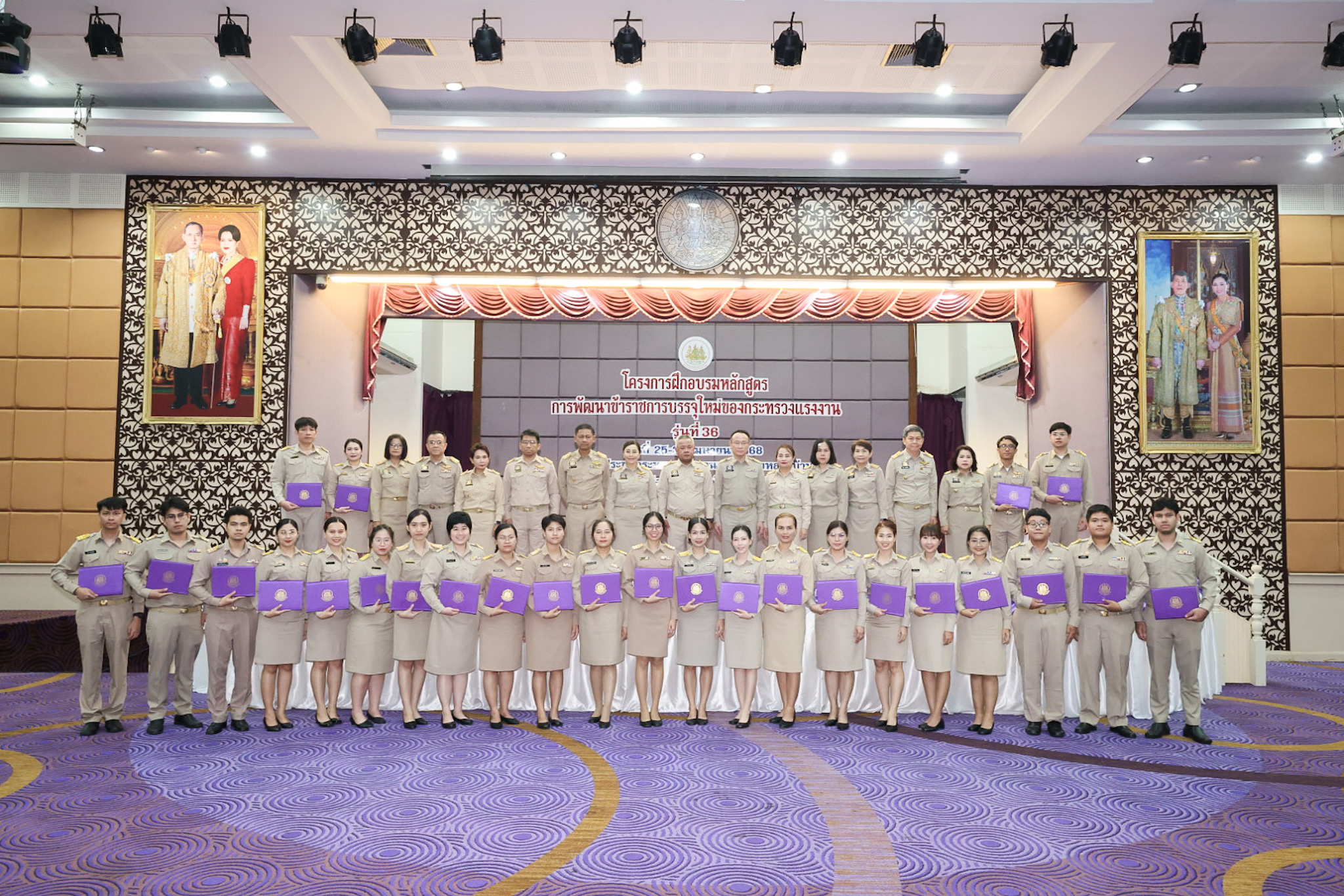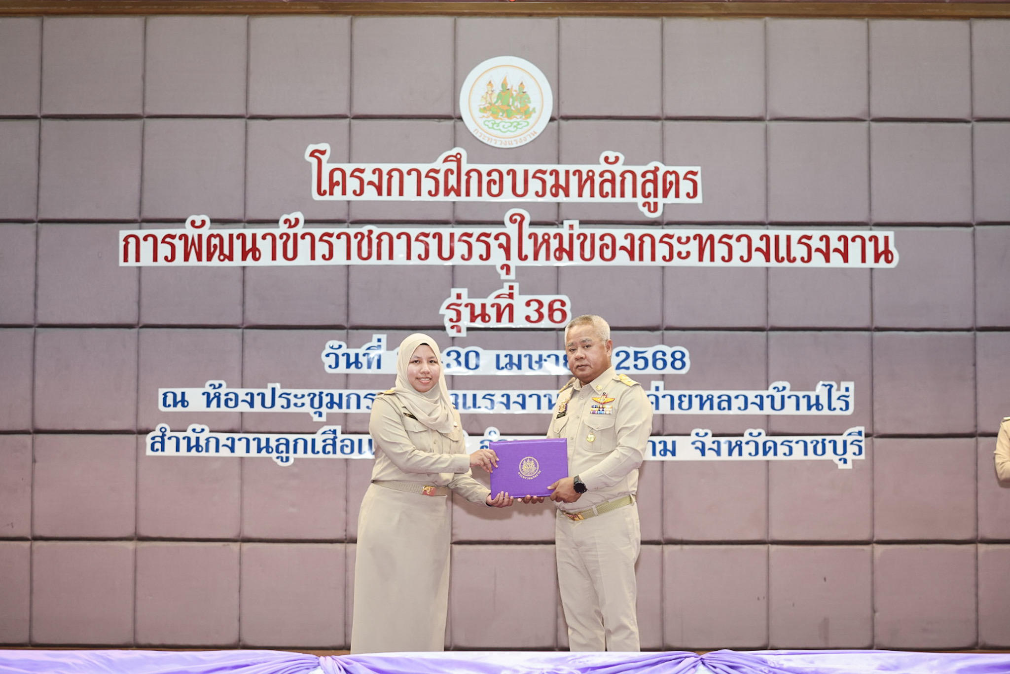 สำหรับโครงการฝึกอบรมหลักสูตรการพัฒนาข้าราชการบรรจุใหม่ของกระทรวงแรงงาน รุ่นที่ 36 ดำเนินการตามแนวทางที่สำนักงาน ก.พ. กำหนด มีผู้เข้ารับการฝึกอบรม 218 คน ดำเนินการตั้งแต่วันที่ 25 – 30 เมษายน 2568 รวมระยะเวลาฝึกอบรม 6 วัน โดยผู้เข้ารับการฝึกอบรมได้เรียนรู้เนื้อหาวิชาในภาควิชาการและกิจกรรมกลุ่มสัมพันธ์จากวิทยากรผู้ทรงคุณวุฒิ รวมทั้งมีการลงมือปฏิบัติจริงในห้องเรียนและนอกห้องเรียน ซึ่งผู้เข้ารับการฝึกอบรมทุกคนได้เข้าร่วมกิจกรรมตามที่กำหนด และมีส่วนร่วมในกิจกรรมต่าง ๆ เป็นอย่างดี ทำให้การฝึกอบรมในครั้งนี้เป็นไปด้วยความเรียบร้อย บรรลุตามวัตถุประสงค์ที่ตั้งไว้ในโครงการ
