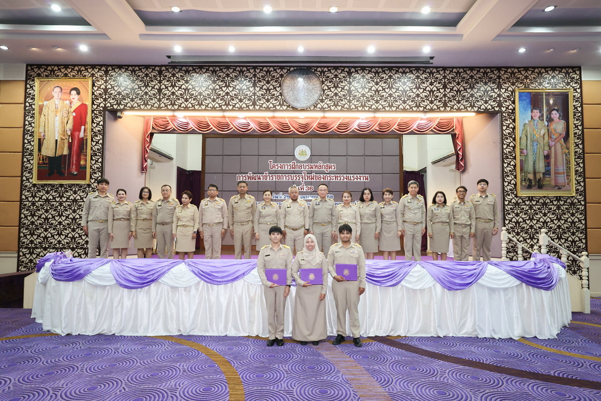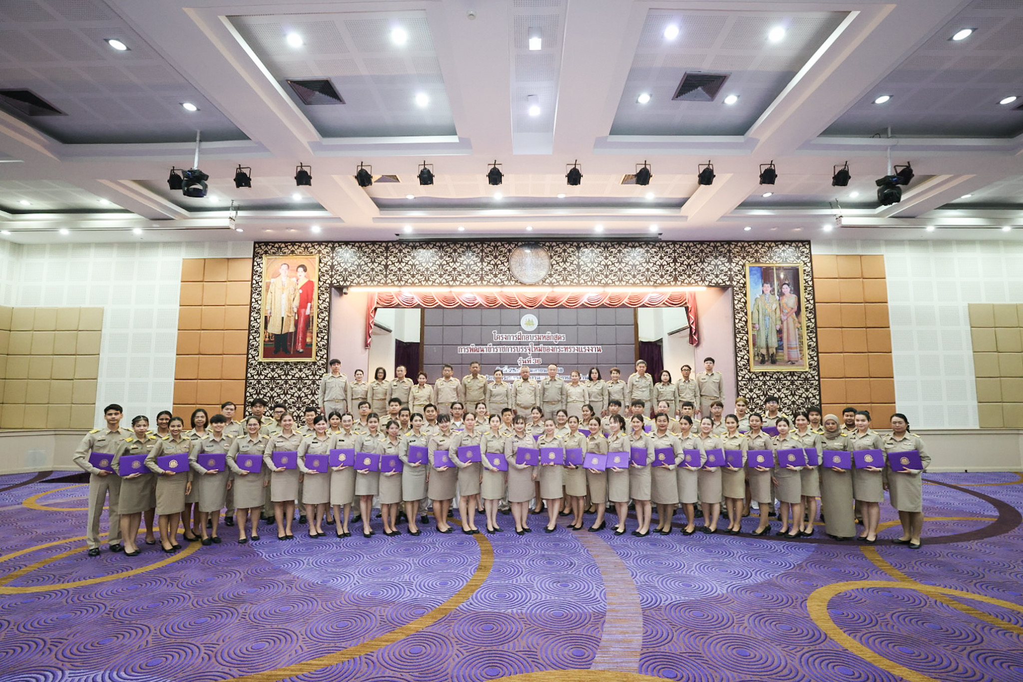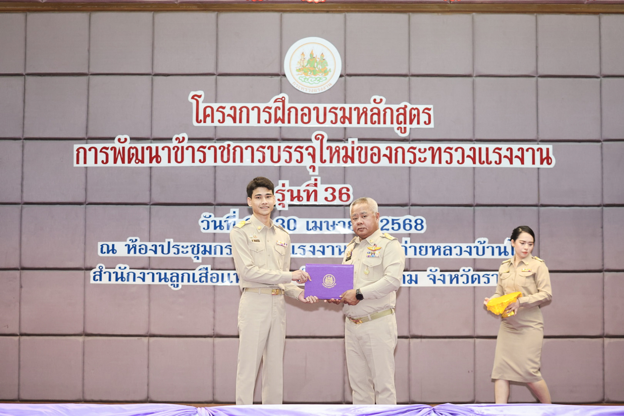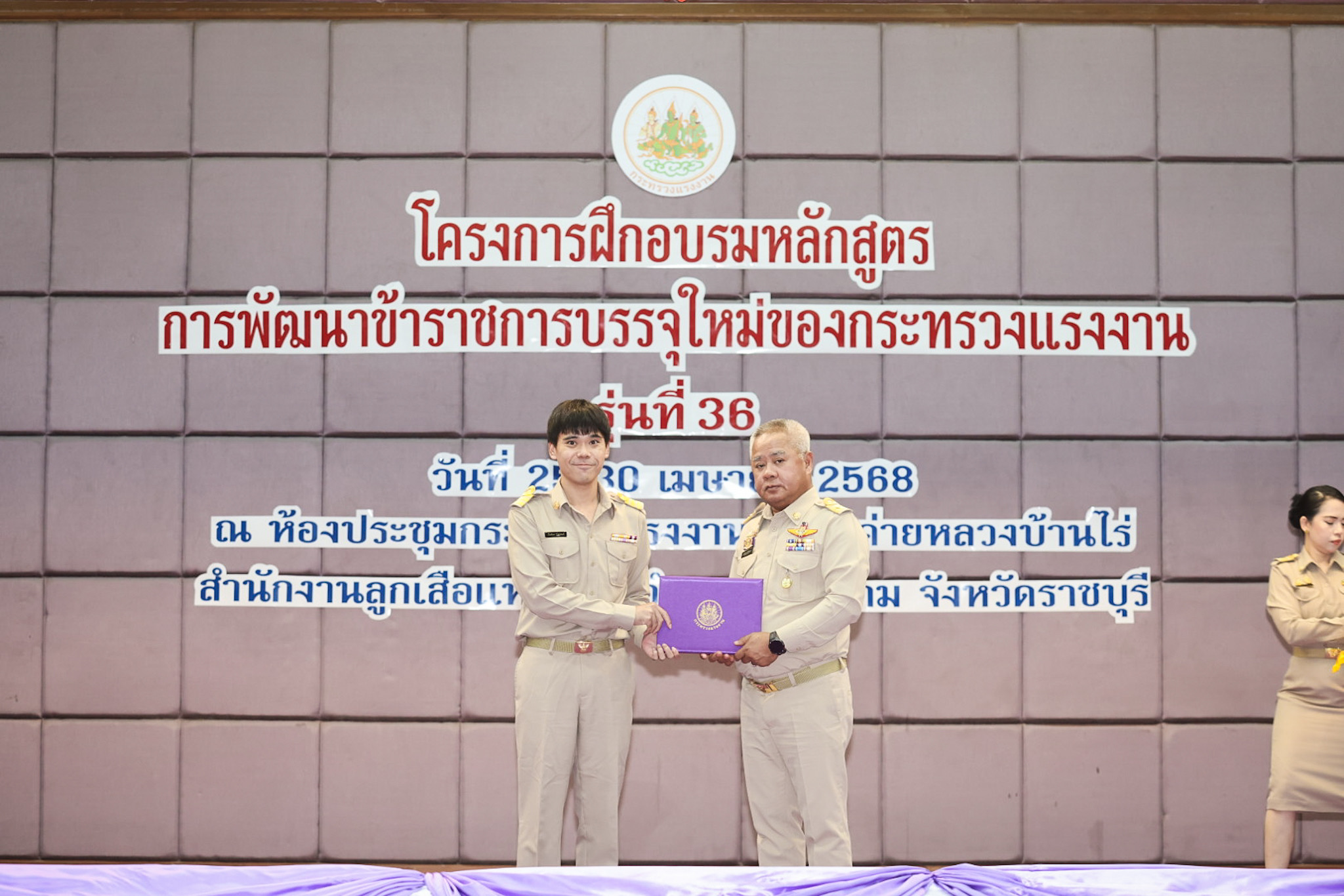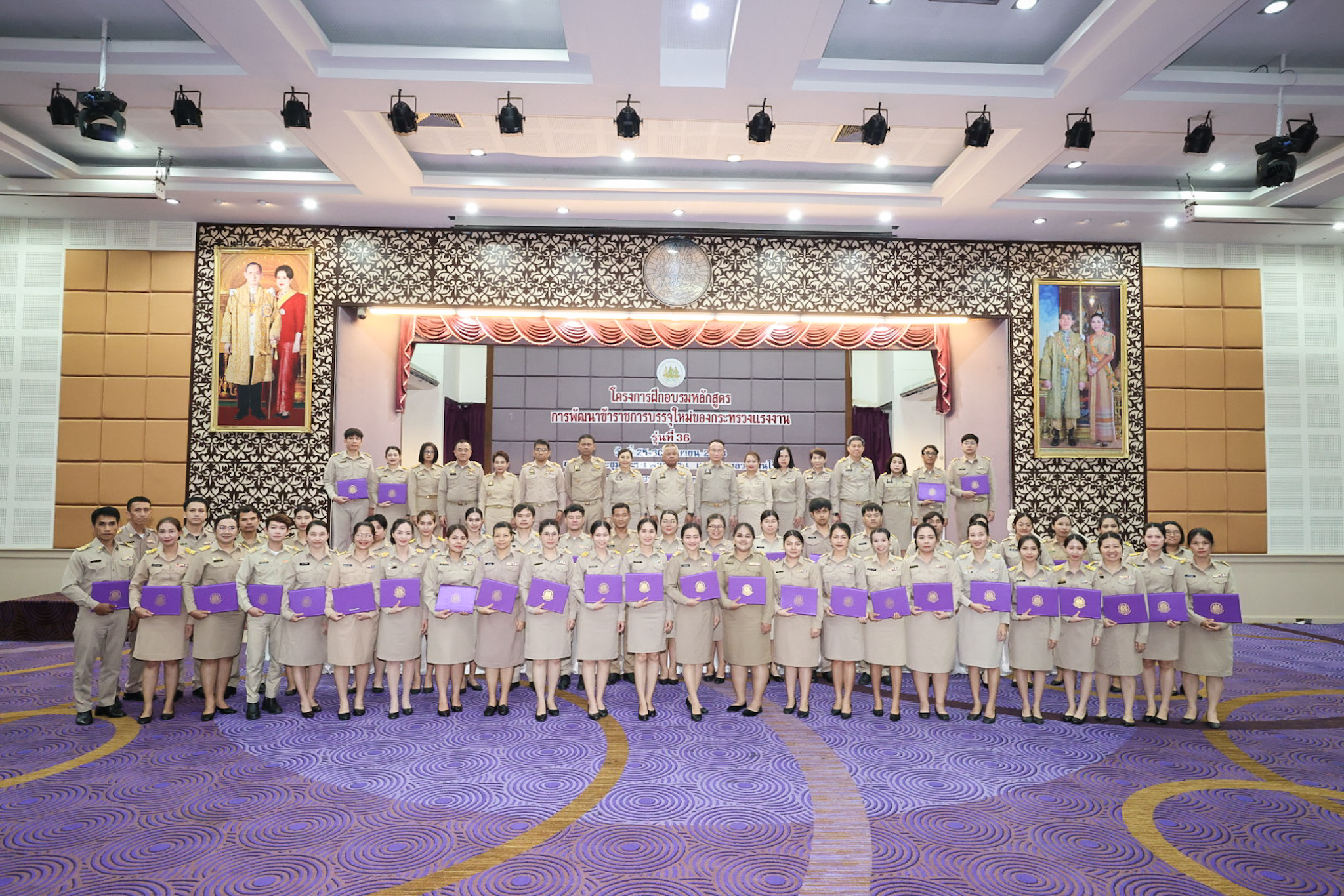สำหรับโครงการฝึกอบรมหลักสูตรการพัฒนาข้าราชการบรรจุใหม่ของกระทรวงแรงงาน รุ่นที่ 36 ดำเนินการตามแนวทางที่สำนักงาน ก.พ. กำหนด มีผู้เข้ารับการฝึกอบรม 218 คน ดำเนินการตั้งแต่วันที่ 25 – 30 เมษายน 2568 รวมระยะเวลาฝึกอบรม 6 วัน โดยผู้เข้ารับการฝึกอบรมได้เรียนรู้เนื้อหาวิชาในภาควิชาการและกิจกรรมกลุ่มสัมพันธ์จากวิทยากรผู้ทรงคุณวุฒิ รวมทั้งมีการลงมือปฏิบัติจริงในห้องเรียนและนอกห้องเรียน ซึ่งผู้เข้ารับการฝึกอบรมทุกคนได้เข้าร่วมกิจกรรมตามที่กำหนด และมีส่วนร่วมในกิจกรรมต่าง ๆ เป็นอย่างดี ทำให้การฝึกอบรมในครั้งนี้เป็นไปด้วยความเรียบร้อย บรรลุตามวัตถุประสงค์ที่ตั้งไว้ในโครงการ
