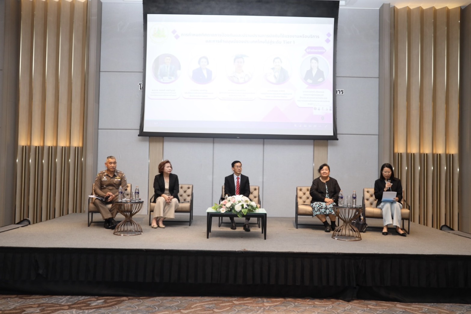 สำหรับโครงการดังกล่าวมีวัตถุประสงค์ เพื่อให้มีการนำเสนอและการแลกเปลี่ยนองค์ความรู้ มีแนวทางการทำงานร่วมกันระหว่างหน่วยงานที่เกี่ยวข้องทั้งภาครัฐ ภาคเอกชน และภาคประชาสังคม และมีข้อเสนอแนะเชิงนโยบายและแนวทางการป้องกันและแก้ไขปัญหาการบังคับใช้แรงงานหรือบริการและการค้ามนุษย์ โดยมีผู้เข้าร่วมโครงการฯ ประกอบด้วย เจ้าหน้าที่หน่วยงานในสังกัดกระทรวงแรงงาน และที่เกี่ยวข้องทั้งภาครัฐ ภาคเอกชน องค์กรพัฒนาเอกชน (NGO) นักวิชาการ วิทยากร ผู้สังเกตการณ์ และเจ้าหน้าที่โครงการฯ รวมทั้งสิ้น 100 คน นอกจากนี้ยังมี ผู้ร่วมเสวนาการกำหนดทิศทางการป้องกันและปราบปรามการบังคับใช้แรงงานหรือบริการและการค้ามนุษย์ของประเทศไทยไปสู่ระดับ Tier 1 จาก พ.ต.อ. ณรงค์ เทศวิบูลย์ รองผู้บังคับการปราบปรามการค้ามนุษย์ กองบังคับการปราบปรามการค้ามนุษย์ นางจตุพร แสงหิรัญ อธิบดีอัยการสำนักงานคดีค้ามนุษย์ สำนักงานอัยการสูงสุด นายอำนาจ พละพลีวัลย์ ผู้อำนวยการกองคุ้มครองและดูแลผลประโยชน์คนไทยในต่างประเทศ กรมการกงสุล กระทรวงการต่างประเทศ นางอภิญญา ทาจิตต์ รองผู้อำนวยการศูนย์อภิบาลผู้เดินทางทางทะเล (Stella Maris) และนางสาวอภิรดี เทียนทอง กรรมการผู้ทรงคุณวุฒิ ด้านประสานงานระหว่างประเทศ คณะกรรมการป้องกันและปราบปรามการค้ามนุษย์ ด้วย