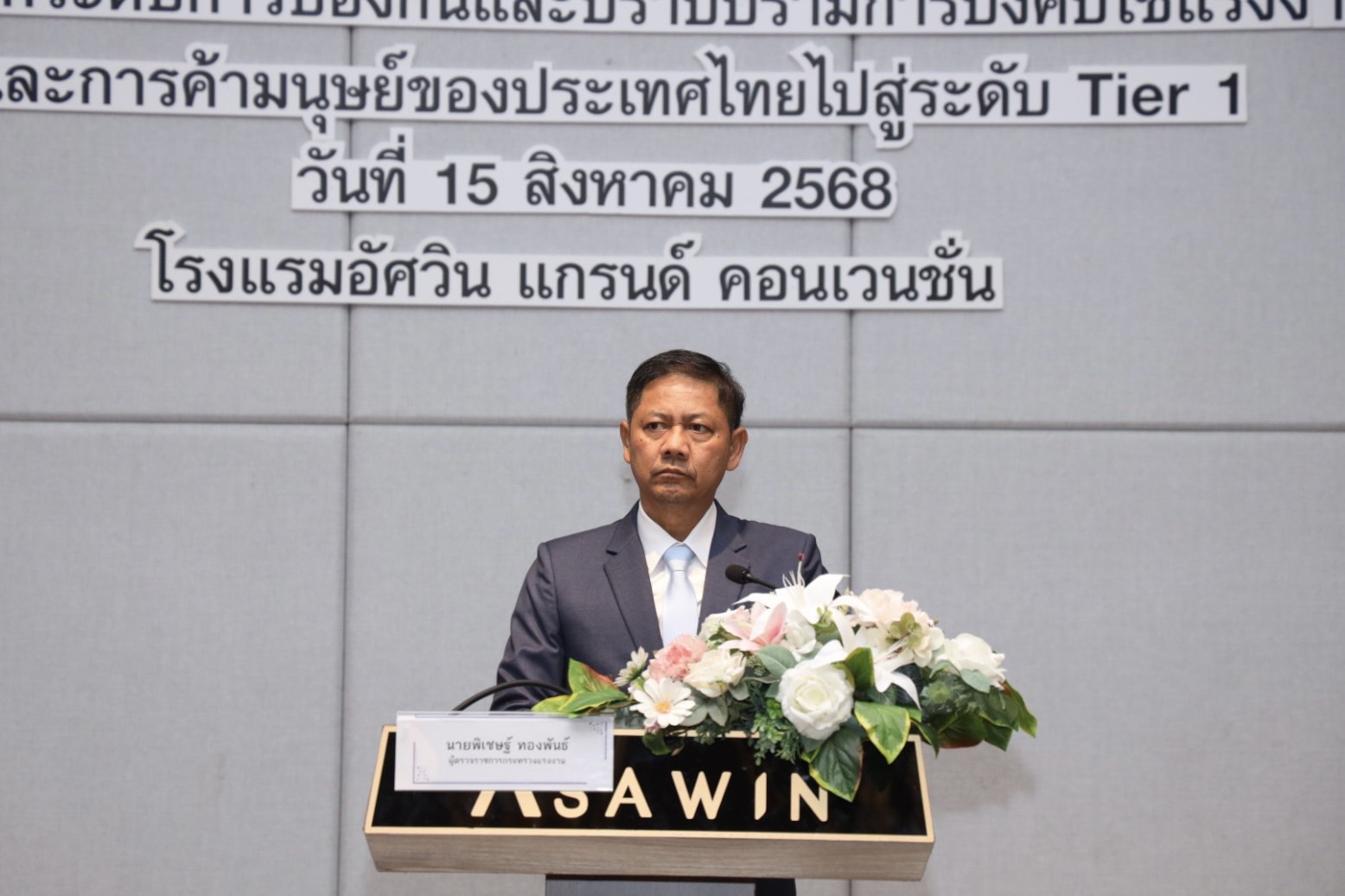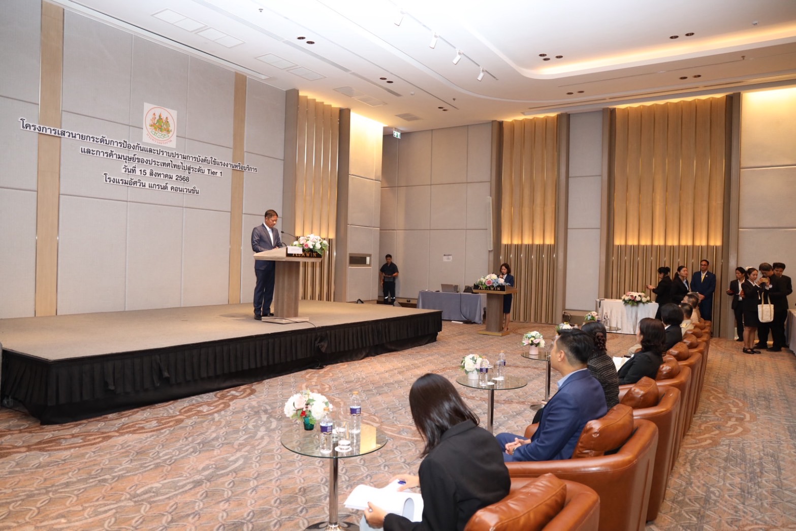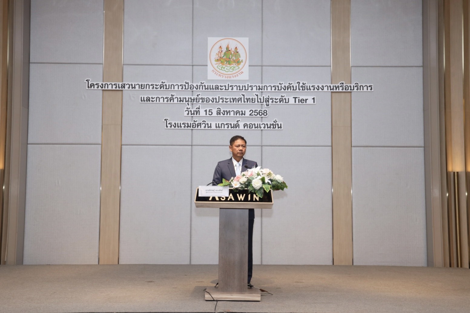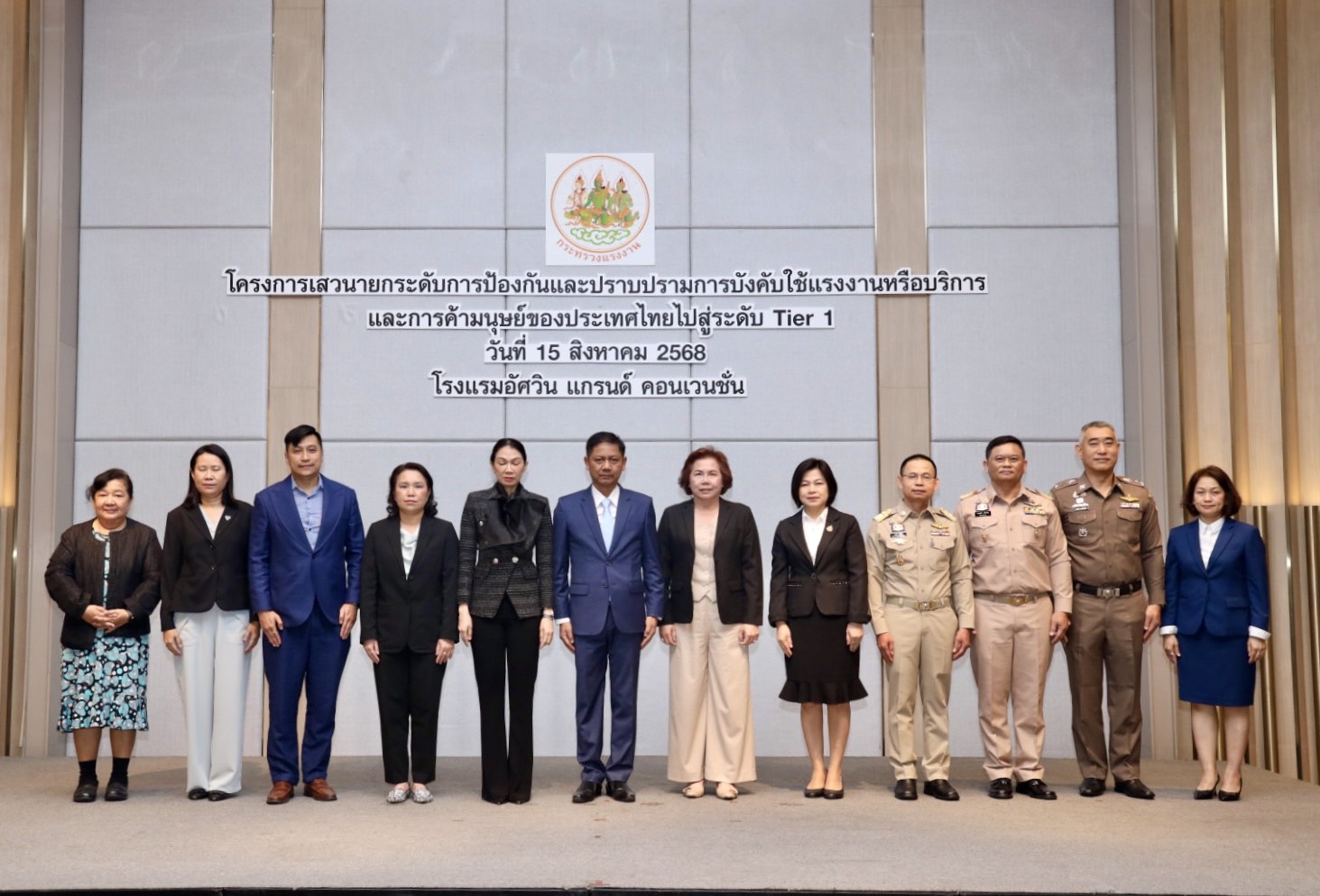 วันที่ 15 สิงหาคม 2568 เวลา 09.00 น. นายบุญสงค์ ทัพชัยยุทธ์ ปลัดกระทรวงแรงงาน มอบหมายให้ นายพิเชษฐ์ ทองพันธ์ ผู้ตรวจราชการกระทรวงแรงงาน เป็นประธานในพิธีเปิดโครงการเสวนายกระดับการป้องกันและปราบปรามการบังคับใช้แรงงานหรือบริการและการค้ามนุษย์ของประเทศไทยไปสู่ระดับ Tier 1 โดยมี นางสาวโสภณา บุญ-หลง ผู้อำนวยการสำนักงานเลขานุการศูนย์บัญชาการป้องกันการค้ามนุษย์ด้านแรงงาน (สล.ศปคร.) กล่าวรายงาน นายสมบัติ โพธิวัฒน์ ผู้ตรวจราชการกรม กรมพัฒนาฝีมือแรงงาน นางวันทนา ณัฐพูลวัฒน์ ผู้ตรวจราชการกรม สำนักงานประกันสังคม ผู้บริหารกระทรวงแรงงาน และหน่วยงานที่เกี่ยวข้อง ร่วมเป็นเกียรติในงาน ณ โรงแรมอัศวิน แกรนด์ คอนเวนชั่น เขตหลักสี่ กรุงเทพมหานคร
