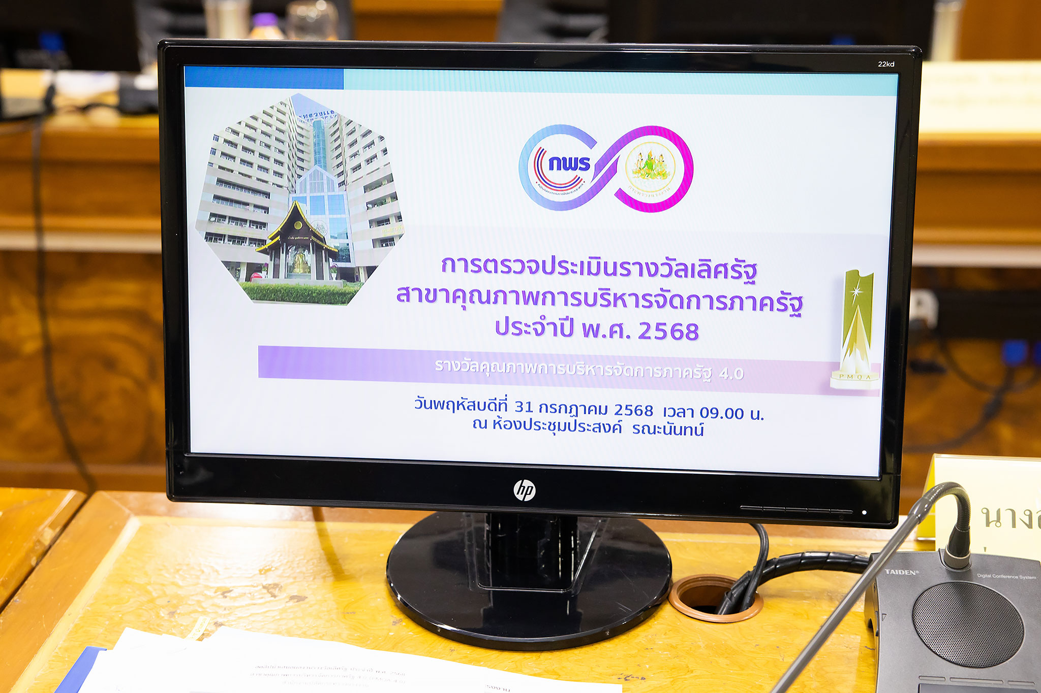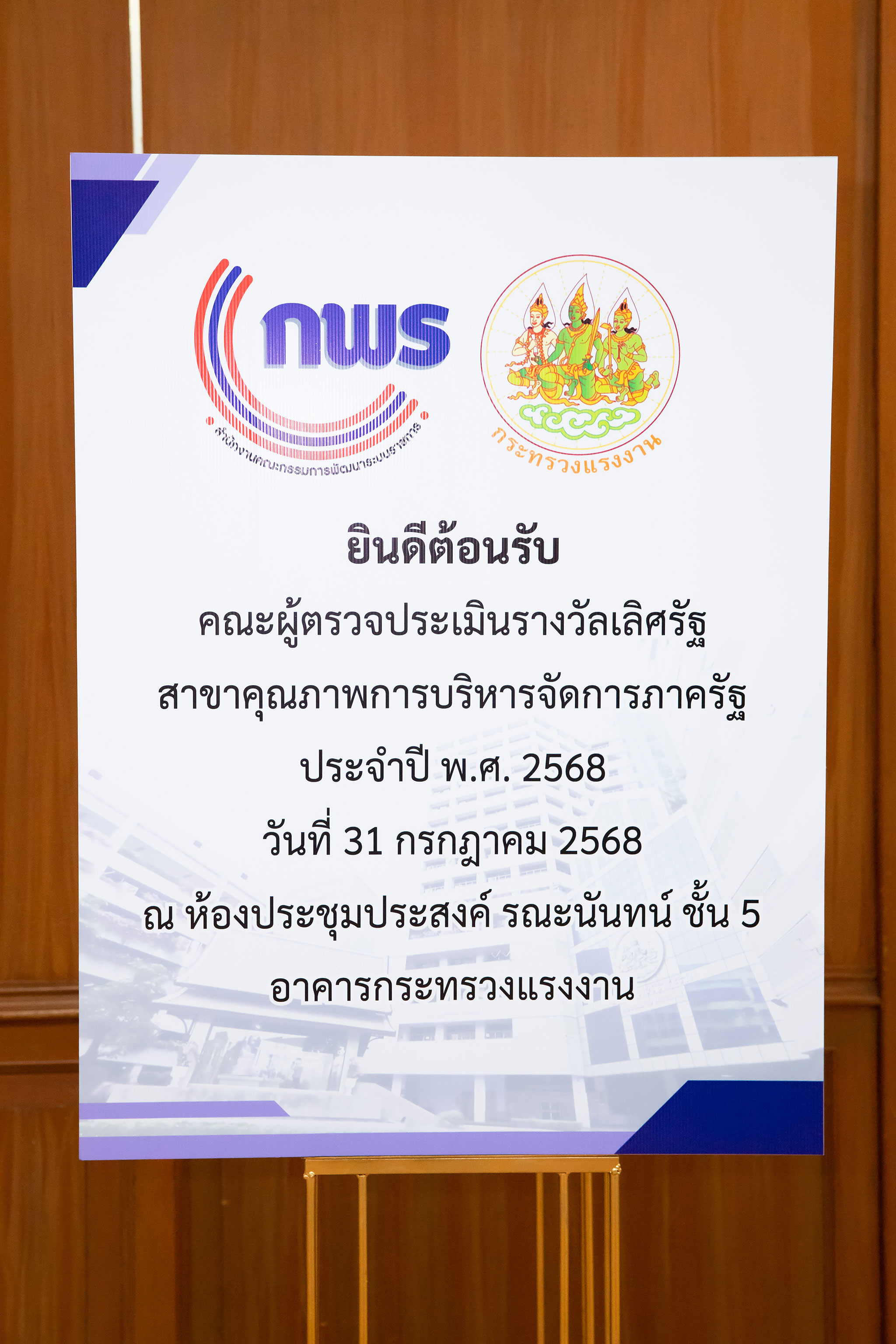 วันที่ 31 กรกฎาคม 2568 เวลา 09.00 น. นายบุญสงค์ ทัพชัยยุทธ์ ปลัดกระทรวงแรงงาน มอบหมายให้ นางสาวบุปผา เรืองสุด รองปลัดกระทรวงแรงงาน นำคณะผู้บริหารสำนักงานปลัดกระทรวงแรงงาน เข้ารับการตรวจประเมินรางวัลเลิศรัฐ สาขาคุณภาพการบริหารจัดการภาครัฐ ประจำปี พ.ศ. 2568 รางวัลคุณภาพการบริหารจัดการภาครัฐ 4.0 จาก นางสุพรรณี ไพรัชเวทย์ ประธานคณะผู้ตรวจประเมินฯ และคณะจากสำนักงาน ก.พ.ร. โดยมี นายสมาสภ์ ปัทมะสุคนธ์ รองปลัดกระทรวงแรงงาน นางสาวกาญจนา พูลแก้ว ผู้ตรวจราชการกระทรวงแรงงาน นางสาวจีระภา บุญรัตน์ ผู้ตรวจราชการกระทรวงแรงงาน นายเกริกไกร นาสมยนต์ ที่ปรึกษากฎหมาย นายณัฐวุฒิ ภัทรประยูร ที่ปรึกษาวิชาการแรงงาน นางสาวกรจิรัฏฐ์ พงจันทร์ศธร ผู้ช่วยปลัดกระทรวงแรงงาน และข้าราชการ เจ้าหน้าที่ สำนักงานปลัดกระทรวงแรงงาน ร่วมด้วย ณ ห้องประชุมประสงค์ รณะนันทน์ ชั้น 5 อาคารกระทรวงแรงงาน
