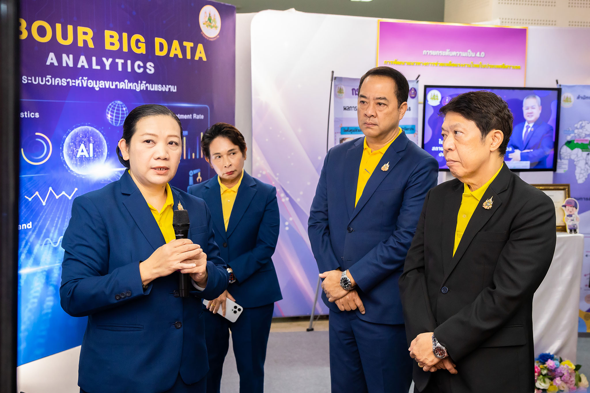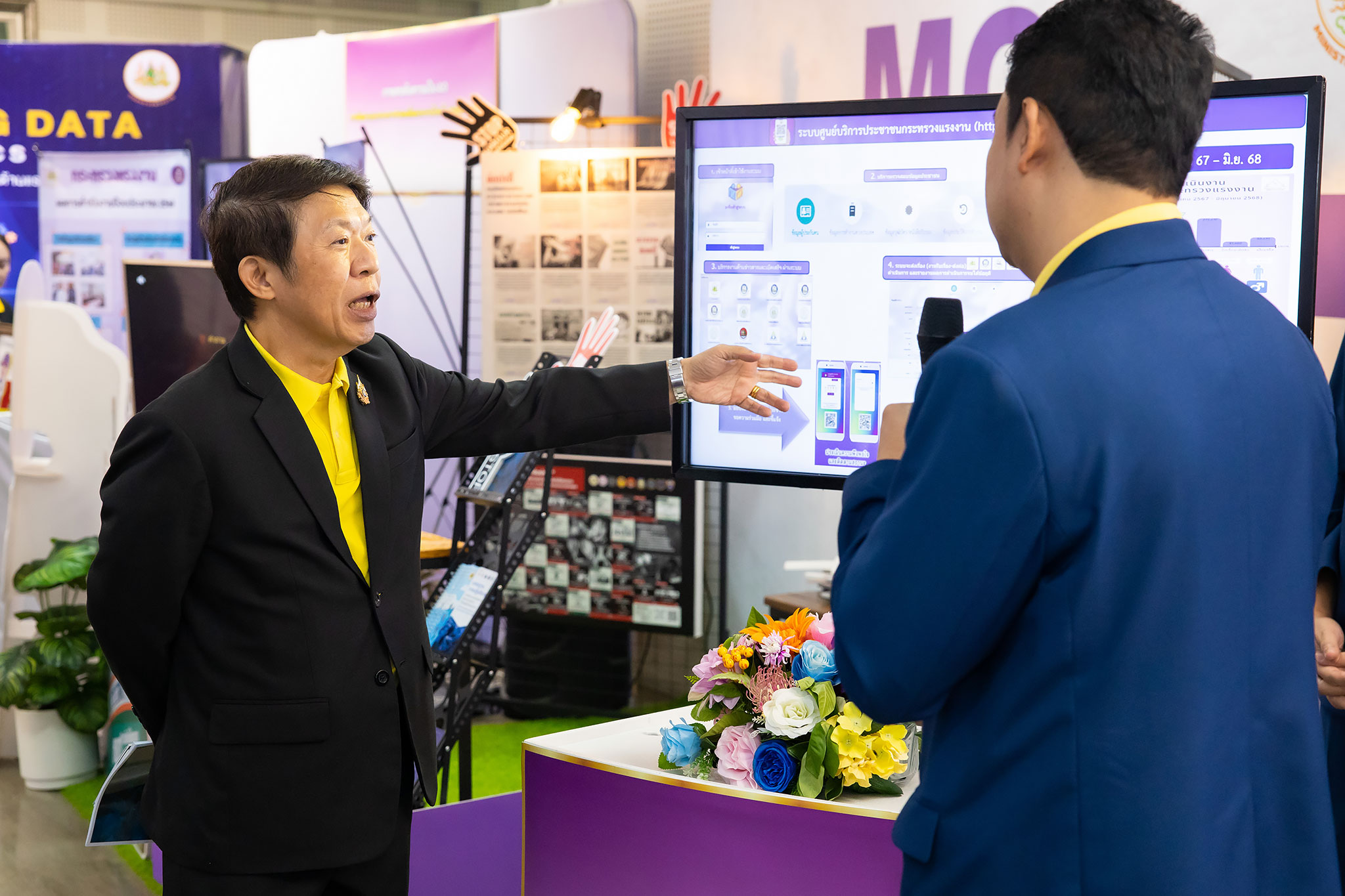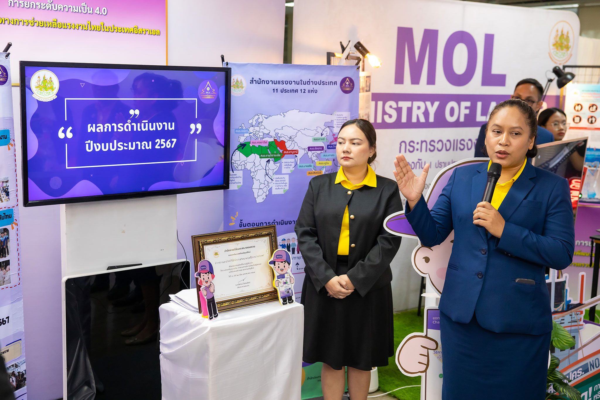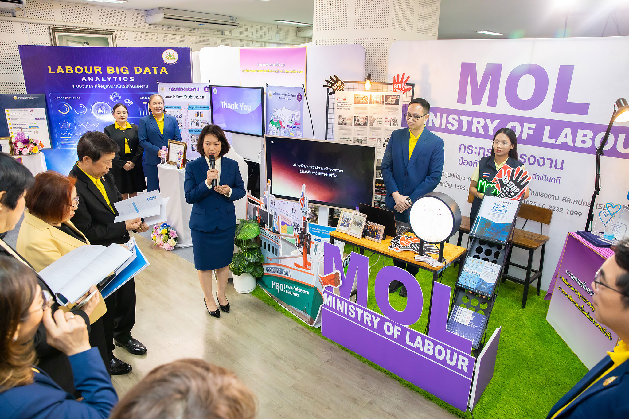 ในการนี้ รองปลัดกระทรวงแรงงาน ได้พาคณะผู้ตรวจประเมินฯ เยี่ยมชมบูทนิทรรศการ โดย สำนักงานปลัดกระทรวงแรงงานได้นำเสนอผลงานรางวัลเลิศรัฐ ประจำปี พ.ศ. 2568 สาขาคุณภาพการบริหารจัดการภาครัฐ 4.0 (PMQA 4.0) ได้แก่ ผลงานเด่นเรื่องที่ 1 การพัฒนาระบบเพิ่มศักยภาพการวิเคราะห์ข้อมูลขนาดใหญ่ด้านแรงงาน (Labour Big Data Analytics) ผลงานเด่นเรื่องที่ 2 การพัฒนาแนวทางการช่วยเหลือแรงงานไทยในประเทศอิสราเอล ผลงานเด่นเรื่องที่ 3 การพัฒนามาตรฐานการปฏิบัติงาน (SOP) การตรวจคัดกรองเบื้องต้นแรงงานบังคับ ผลงานเด่นเรื่องที่ 4 การพัฒนาระบบศูนย์บริการประชาชนกระทรวงแรงงาน (MOL Service Center System) และผลงานเด่นเรื่องที่ 5 (การยกระดับสู่การเป็นระบบราชการ 4.0 ในอนาคต) การพัฒนาคุณภาพชีวิตแรงงานอิสระ