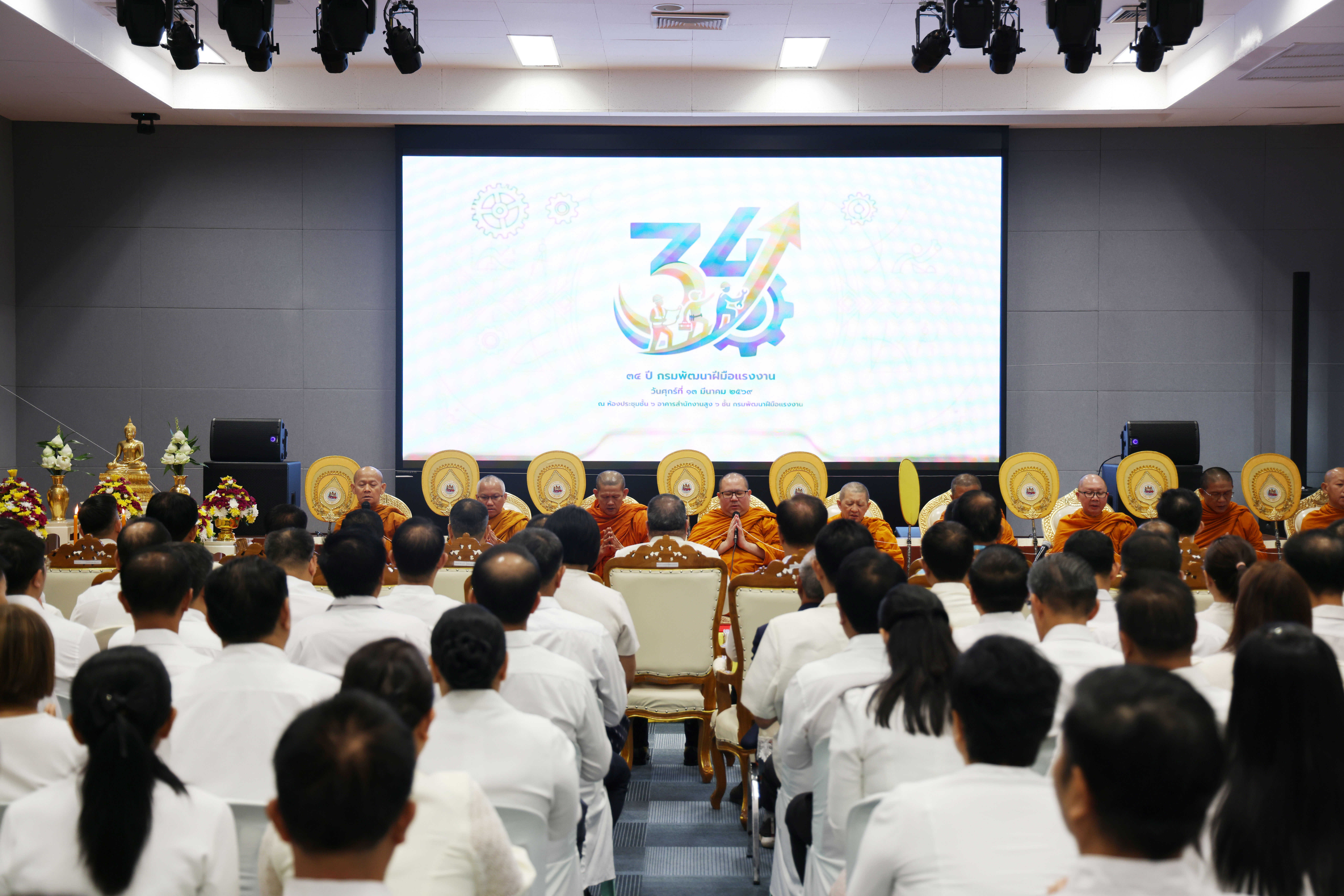 วันที่ 13 มีนาคม 2569 เวลา 07.30 น. พันตำรวจโท วรรณพงษ์ คชรักษ์ ปลัดกระทรวงแรงงาน เป็นประธานในพิธีทำบุญแด่พระสงฆ์ เนื่องในวันคล้ายวันสถาปนาครบรอบ 34 ปี ประจำปีพุทธศักราช 2569 เพื่อระลึกถึงวันก่อตั้งกรมพัฒนาฝีมือแรงงาน โดยมี นายสมาสภ์ ปัทมะสุคนธ์ อธิบดีกรมพัฒนาฝีมือแรงงาน นายเกริกไกร นาสมยนต์ ที่ปรึกษากฎหมาย พร้อมผู้บริหารและเจ้าหน้าที่กระทรวงแรงงาน ร่วมพิธี ณ ห้องประชุม ชั้น 6 อาคาร DSD กรมพัฒนาฝีมือแรงงาน