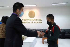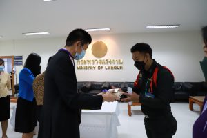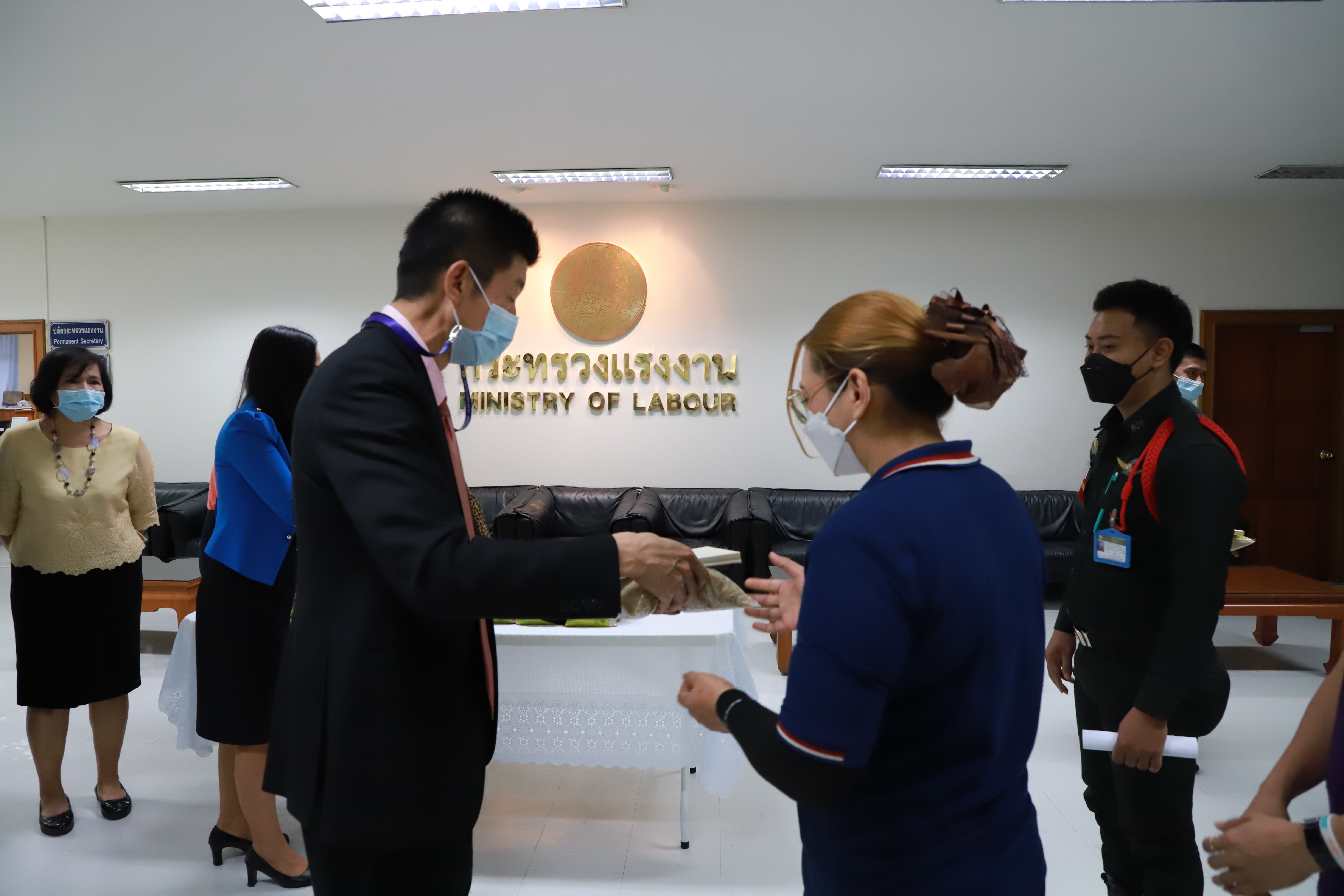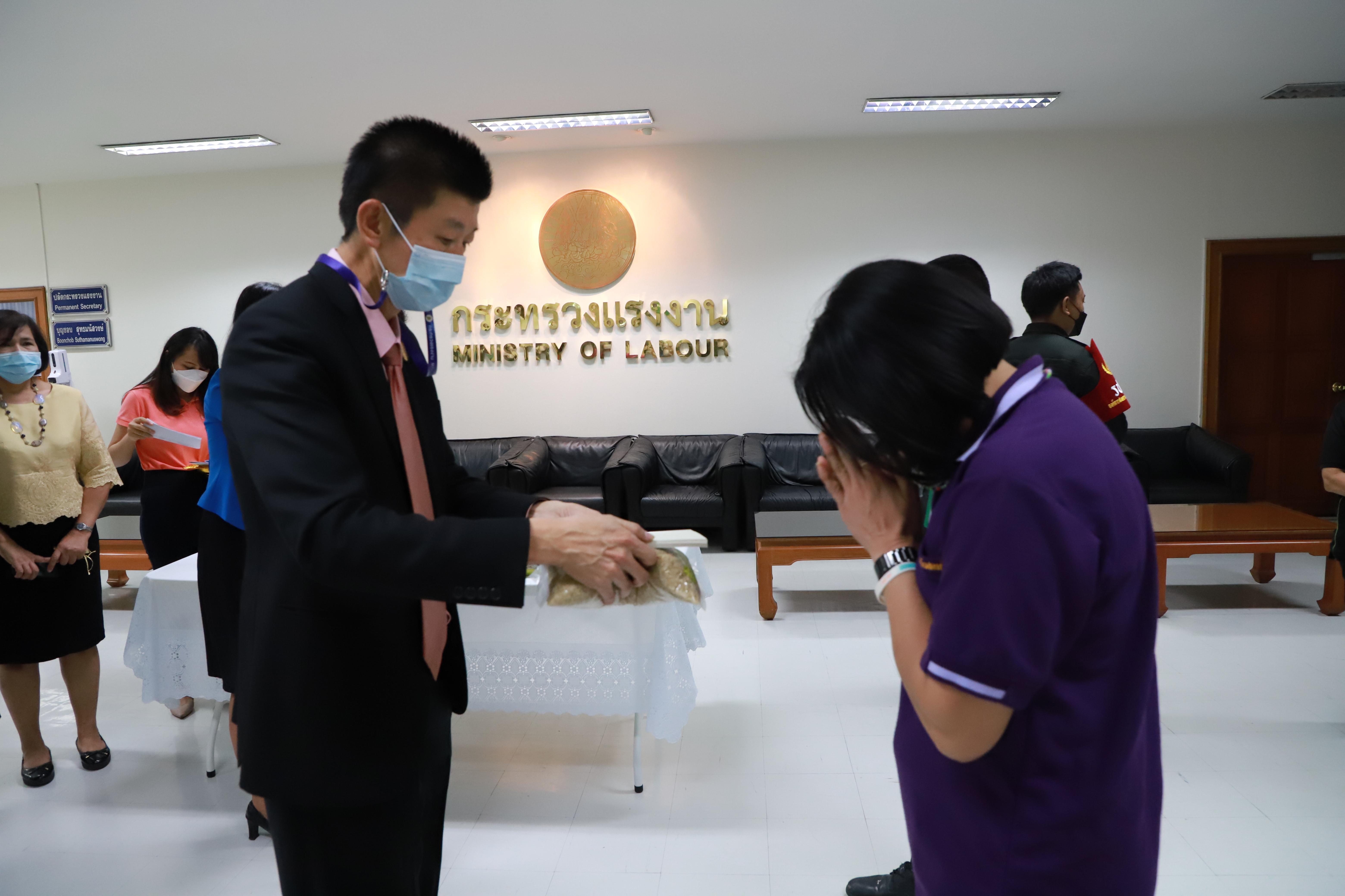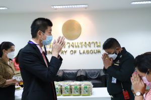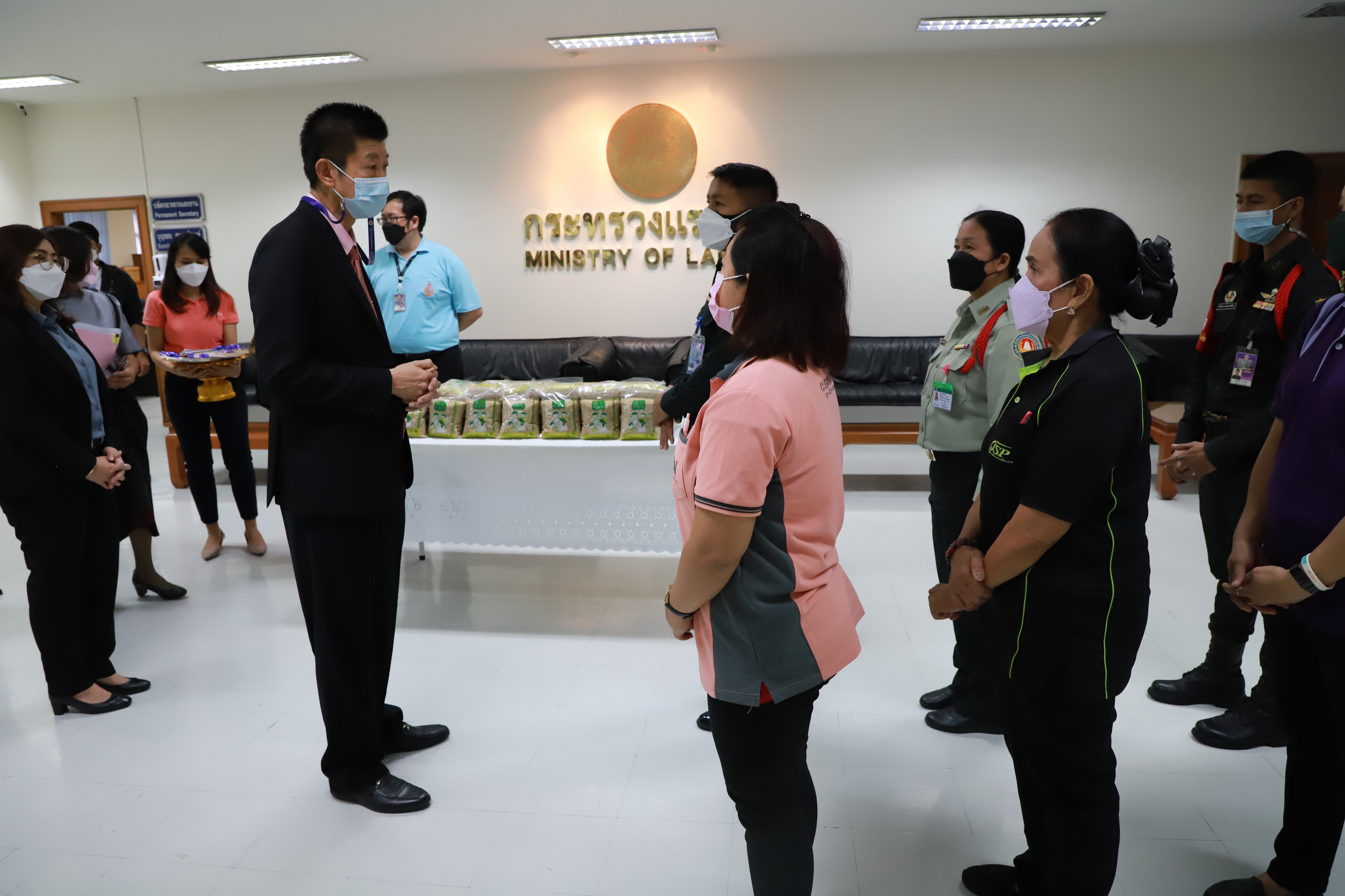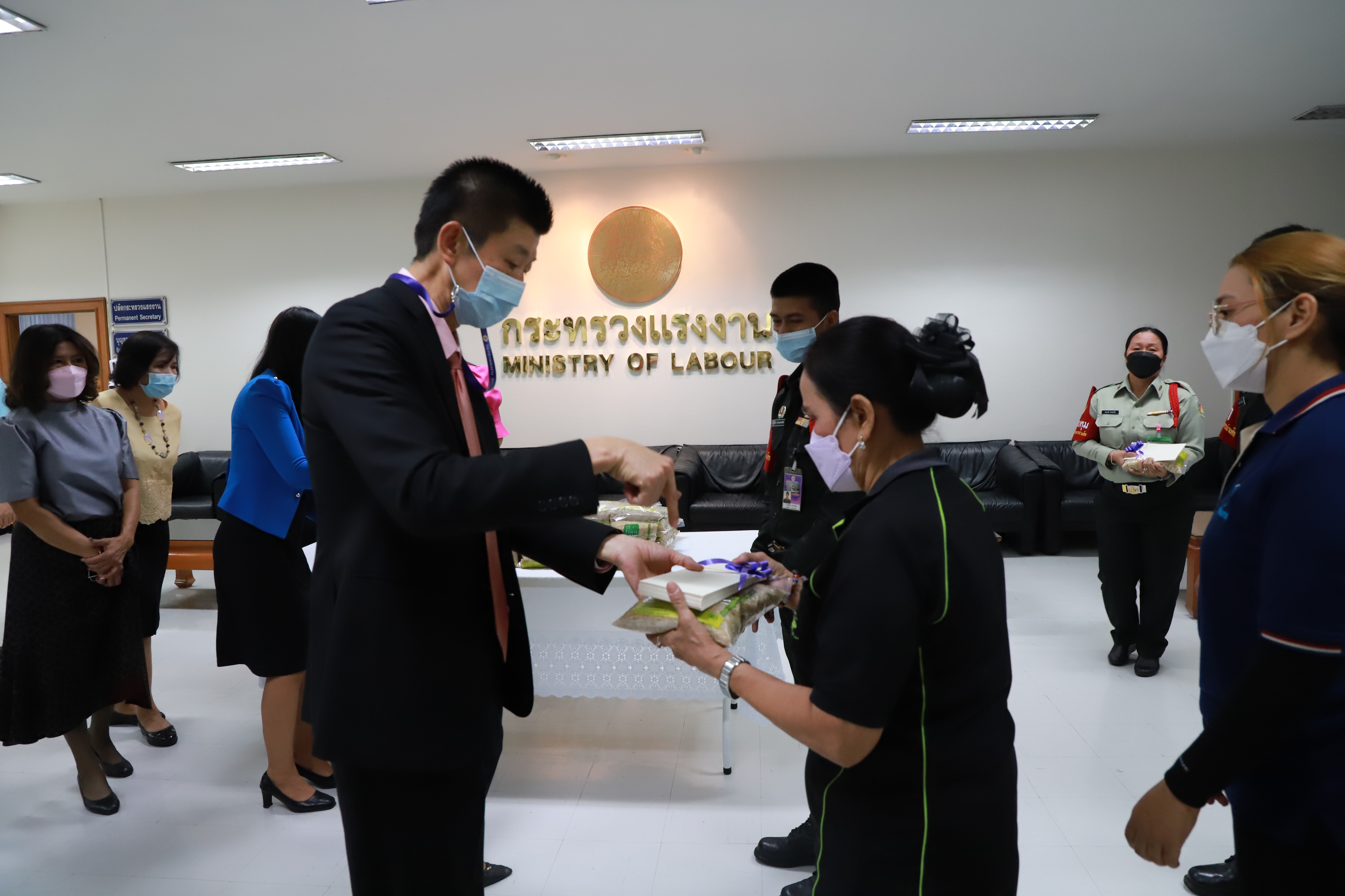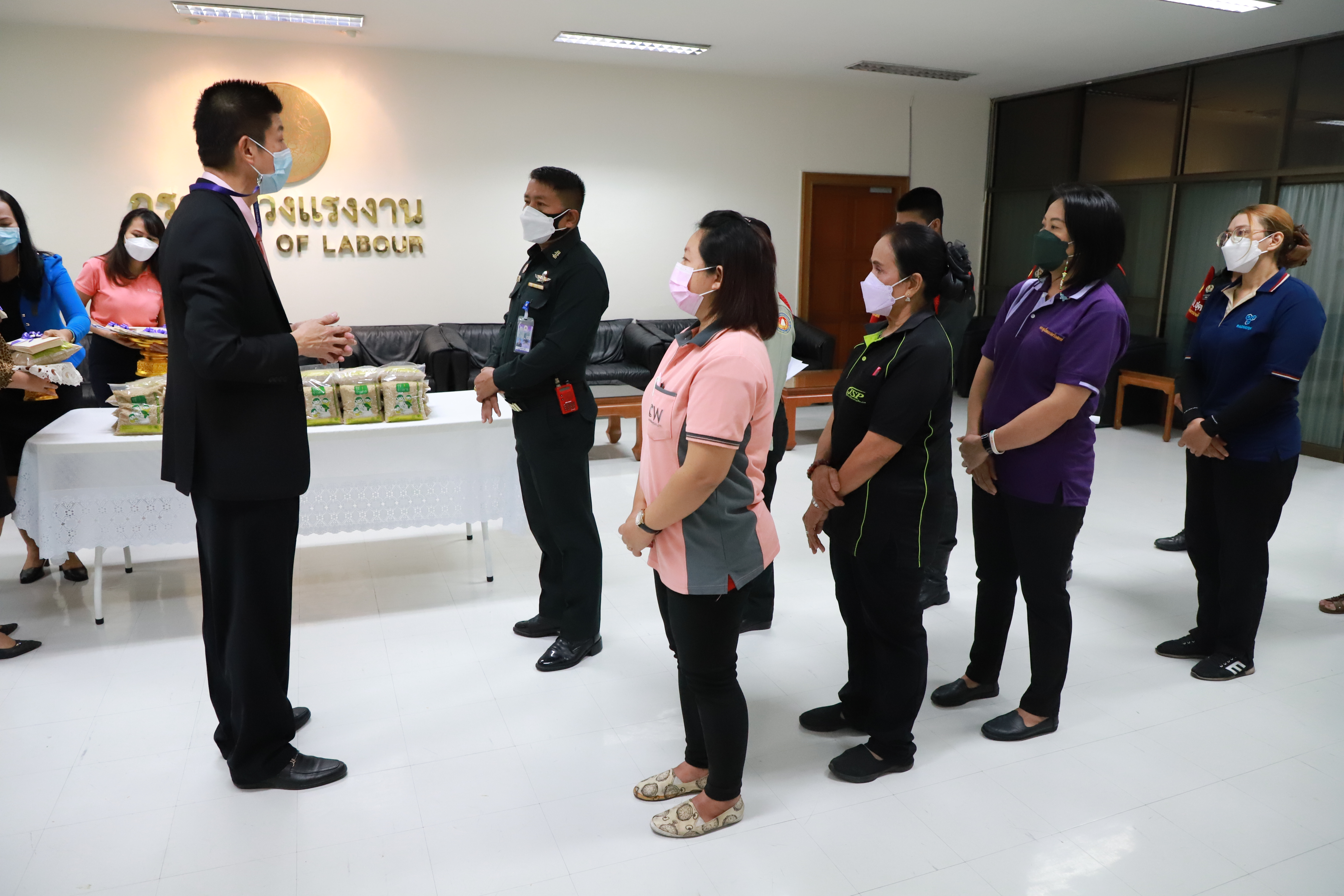 วันที่ 30 ธันวาคม 2564 เวลา 09.00 น. นายบุญชอบ สุทธมนัสวงษ์ ปลัดกระทรวงแรงงาน มอบข้าวสารให้กับตัวแทนพนักงานรักษาความปลอดภัย และแม่บ้านหน่วยงานในสังกัดกระทรวงแรงงาน เนื่องในโอกาสวันขึ้นปีใหม่ ณ ห้องทำงานปลัดกระทรวงแรงงาน ชั้น 5 อาคารกระทรวงแรงงาน