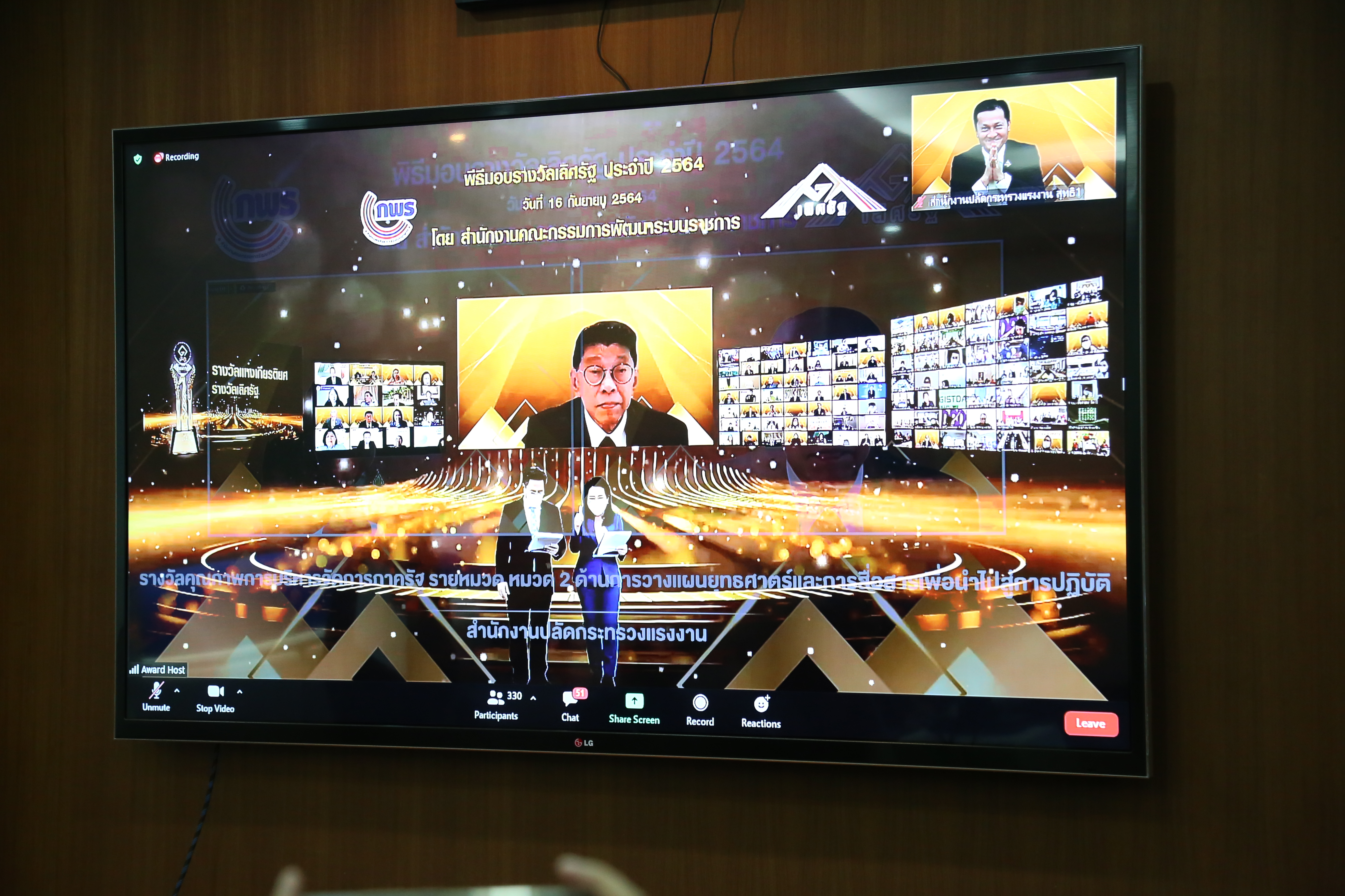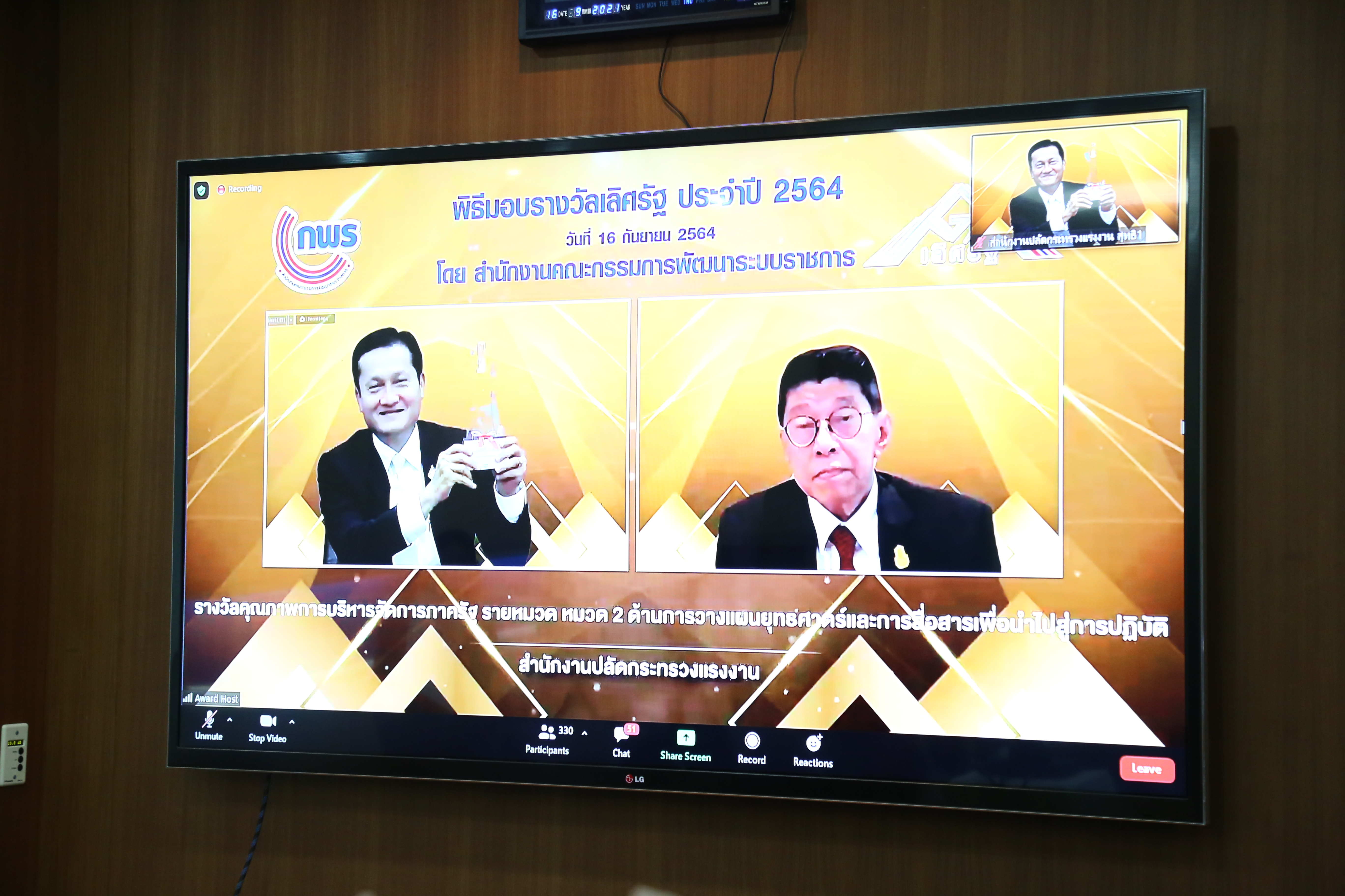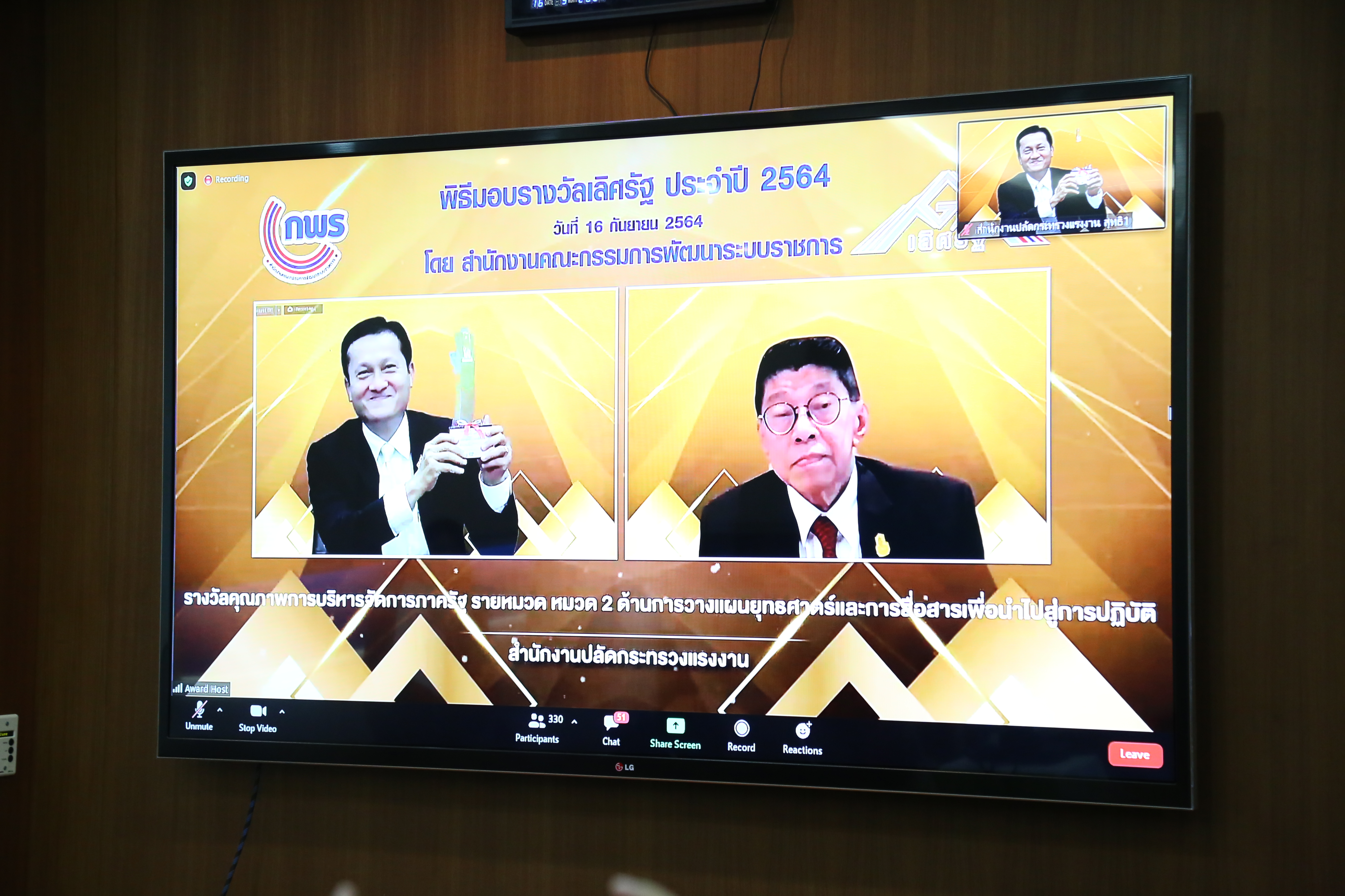 วันที่ 16 กันยายน 2564 เวลา 13.00 น. นายสุทธิ สุโกศล ปลัดกระทรวงแรงงานร่วมพิธีมอบรางวัลเลิศรัฐ ประจำปี พ.ศ. 2564 โดยในปีนี้คณะกรรมการพัฒนาระบบราชการ (ก.พ.ร.) ได้มีมติมอบรางวัลการบริหารจัดการภาครัฐ หมวด 2 การวางแผนเชิงยุทธศาสตร์และการสื่อสารเพื่อนำไปสู่การปฏิบัติ ให้แก่สำนักงานปลัดกระทรวงแรงงาน โดยมีรองนายกรัฐมนตรี (นายวิษณุ เครืองาม) เป็นประธานในพิธี และปลัดกระทรวงแรงงานเป็นผู้ขึ้นรับรางวัลดังกล่าวข้างต้น ผ่านระบบอิเล็กทรอนิกส์