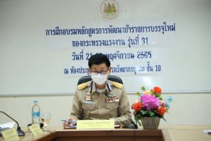 เมื่อวันที่ 21 พฤศจิกายน 2565 เวลา 9.00 น. นายบุญชอบ สุทธมนัสวงษ์ ปลัดกระทรวงแรงงานเป็นประธานพิธีเปิดการฝึกอบรมหลักสูตรการพัฒนาข้าราชการบรรจุใหม่ของกระทรวงแรงงาน รุ่นที่ 31 ผ่านระบบออนไลน์ Zoom Meeting ณ ห้องประชุมกองบริหารทรัพยากรบุคคล ชั้น 10 กระทรวงแรงงาน ซึ่งการฝึกอบรมหลักสูตรดังกล่าว ดำเนินการระหว่างวันที่ 21 พฤศจิกายน – 1 ธันวาคม 2565 โดยเป็นการพัฒนาความรู้ความสามารถให้ข้าราชการใหม่ รวม 188 คน (สำนักงานปลัดกระทรวงแรงงาน จำนวน 19 คน) ให้มีความเข้าใจในระเบียบแบบแผนของการปฏิบัติราชการ และมีการฝึกปฏิบัติหัวข้อวิชาต่าง ๆ รวมทั้งกิจกรรมกลุ่ม ในหัวข้อ “การสร้างภาวะผู้นำที่มีคุณธรรมและจริยธรรม” เพื่อเสริมสร้างจริยธรรม และปลูกฝังการมีจิตสำนึกของการเป็นข้าราชการที่ดี ปลัดกระทรวงแรงงานขอให้ข้าราชการใหม่ทุกคนเป็นกำลังสำคัญของหน่วยงาน ปฏิบัติงานด้วยความซื่อสัตย์สุจริต และเป็นข้าราชการที่ดีของประเทศชาติต่อไป