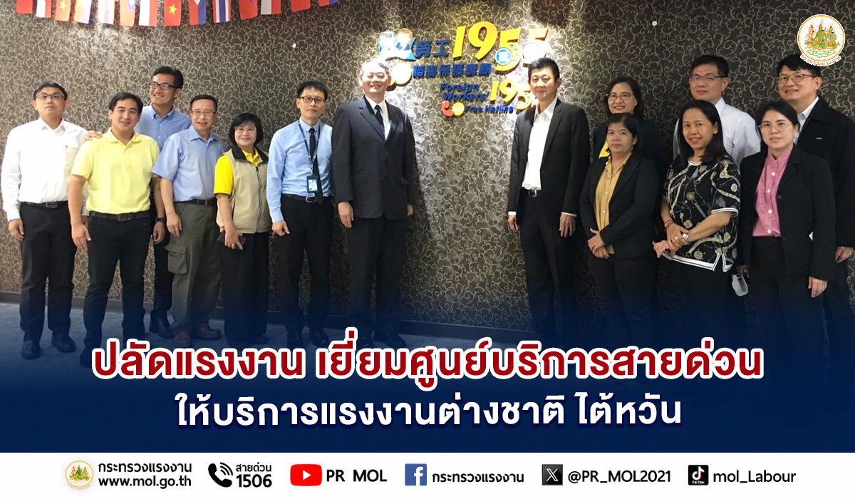 วันที่ 11 กันยายน 2566 เวลา 15.00 น. นายบุญชอบ สุทธมนัสวงษ์ ปลัดกระทรวงแรงงาน ได้เดินทางเข้าเยี่ยมชมศูนย์บริการสายด่วนให้บริการแรงงานต่างชาติ 1995 โดย นาย Chia Jen Lai รองอธิบดีกรมพัฒนากำลังแรงงาน กระทรวงแรงงานไต้หวัน ให้การต้อนรับ ซึ่งศูนย์บริการสายด่วน 1955 เป็นสายบริการให้คำปรึกษาแรงงานต่างชาติเพียงสายเดียวในไต้หวัน เริ่มก่อตั้งในปี 2009 โดยมีล่ามแปล 4 ภาษา ได้แก่ ภาษาอังกฤษ ไทย เวียดนาม และอินโดนีเซีย ให้บริการทางโทรศัพท์ตลอด 24 ชั่วโมง เพื่อปกป้องช่วยเหลือสิทธิและผลประโยชน์ของแรงงานอย่างเข้มงวดทุกกรณี