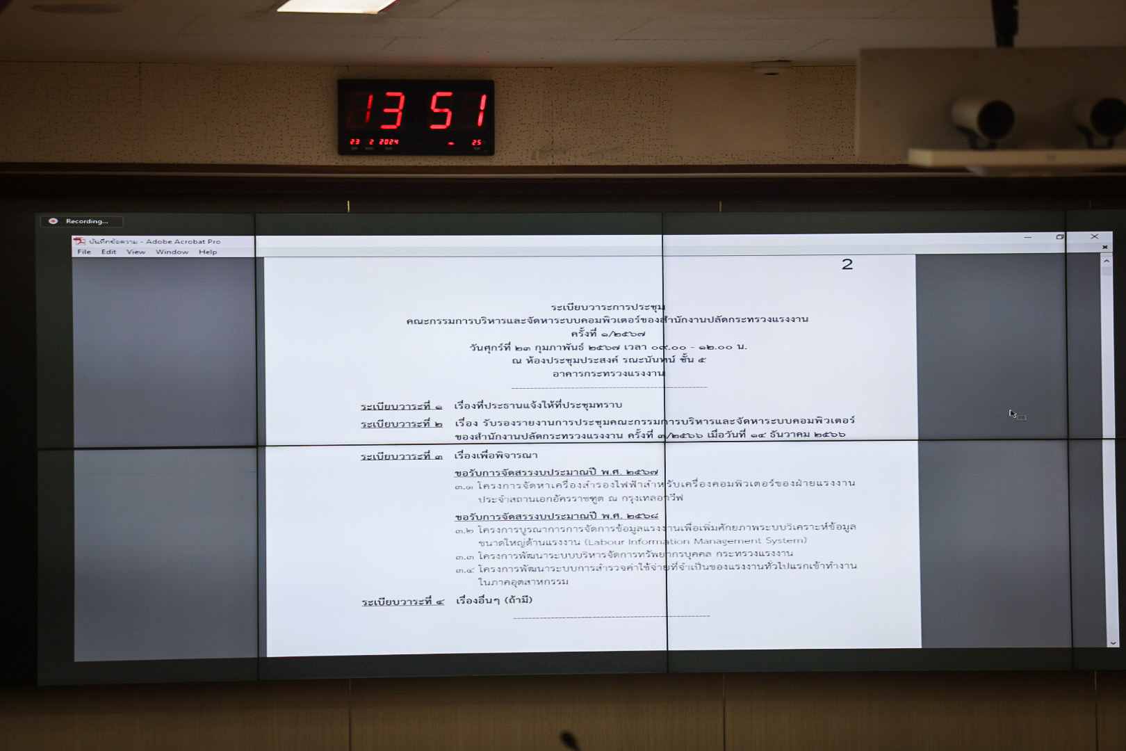 วันที่ 23 กุมภาพันธ์ 2567 เวลา 13.30 น. นายไพโรจน์ โชติกเสถียร ปลัดกระทรวงแรงงาน เป็นประธานการประชุมคณะกรรมการบริหารและจัดหาระบบคอมพิวเตอร์ของสำนักงานปลัดกระทรวงแรงงาน ครั้งที่ 1/2567 ณ ห้องประชุมประสงค์ รณนันทน์ ชั้น 5 อาคารกระทรวงแรงงาน โดยที่ประชุมได้พิจารณาการขอรับการจัดสรรงบประมาณปี พ.ศ. 2567 โครงการจัดหาเครื่องสำรองไฟฟ้าสำหรับเครื่องคอมพิวเตอร์ของฝ่ายแรงงานประจำสถานเอกอัครราชทูต ณ กรุงเทลอาวีฟ การขอรับการจัดสรรงบประมาณปี พ.ศ. 2568 โครงการบูรณาการการจัดการข้อมูลแรงงานเพื่อเพิ่มศักยภาพระบบวิเคราะห์ข้อมูลขนาดใหญ่ด้านแรงงาน (Labour Information Management System) โครงการพัฒนาระบบบริหารจัดการทรัพยากรบุคคล กระทรวงแรงงาน และ โครงการพัฒนาระบบการสำรวจค่าใช้จ่ายที่จำเป็นของแรงงานทั่วไปแรกเข้าทำงานในภาคอุตสาหกรรม