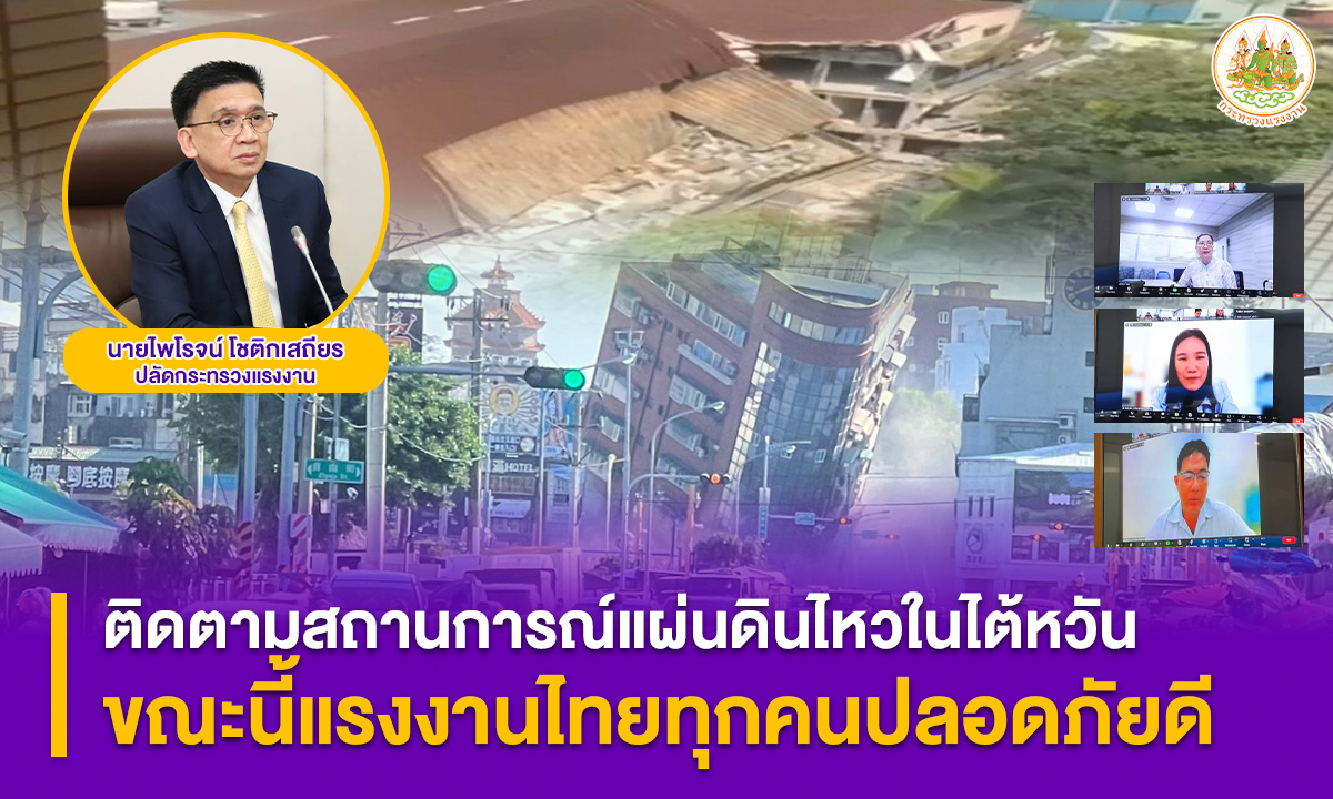 นายไพโรจน์ โชติกเสถียร ปลัดกระทรวงแรงงาน กล่าวว่า จากเหตุการณ์แผ่นดินไหวที่เกิดขึ้นในไต้หวันนั้น กระทรวงแรงงานไม่ได้นิ่งนอนใจ และได้เฝ้าติดตามสถานการณ์อย่างใกล้ชิด โดยในวันนี้ ผมได้ประชุมติดตามสถานการณ์เร่งด่วนกับอัครราชทูตที่ปรึกษา (ฝ่ายแรงงาน) ที่ประจำการอยู่ที่ไต้หวัน และประเทศญี่ปุ่น ซึ่งความคืบหน้าล่าสุด ได้รับรายงานว่า เหตุการณ์ดังกล่าวซึ่งอยู่ทางภาคเหนือ มีผู้เสียชีวิตแล้ว 9 ราย มีผู้ได้รับบาดเจ็บ 1,011 ราย นอกจากนี้ ยังมีผู้ที่รอการช่วยเหลือจากทางการไต้หวันอีก 143 ราย ในจำนวนนี้ยังไม่มีแรงงานไทยได้รับบาดเจ็บหรือเสียชีวิตจากเหตุการณ์ดังกล่าว โดยสถานการณ์ขณะนี้ สำนักงานแรงงาน ณ กรุงไทเปและเกาสง ได้ประชาสัมพันธ์ข้อมูลข่าวสาร ทางสื่อออนไลน์ โดยเฉพาะ Facebook และในกลุ่ม Line เครือข่ายล่ามทั้งภาษาไทยและภาษาจีน รวมถึงสถานประกอบการต่างๆ ถึงวิธีการปฏิบัติตนให้แรงงานไทยรับทราบ พร้อมช่องทางการติดต่อกับหน่วยงานต่างๆ เพื่อไม่ให้แรงงานไทยตื่นตระหนกกับเหตุการณ์ดังกล่าว เนื่องจากทางการไต้หวันได้ประกาศว่า ในอีก 3 วัน จะมีโอกาสเกิดแผ่นดินไหวขึ้นอีกครั้ง ในระดับความรุนแรงที่ใกล้เคียงกันกับครั้งนี้