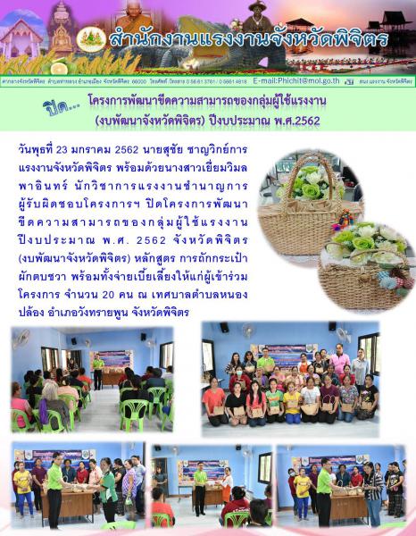วันพุธที่ 23 มกราคม 2562 นายสุชัย ชาญวิกย์การ แรงงานจังหวัดพิจิตร พร้อมด้วยนางสาวเยี่ยมวิมล พาอินทร์ นักวิชาการแรงงานชำนาญการ ผู้รับผิดชอบโครงการฯ ปิดโครงการพัฒนาขีดความสามารถของกลุ่มผู้ใช้แรงงาน ปีงบประมาณ พ.ศ. 2562 จังหวัดพิจิตร(งบพัฒนาจังหวัดพิจิตร) หลักสูตร การถักกระเป๋าผักตบชวา พร้อมทั้งจ่ายเบี้ยเลี้ยงให้แก่ผู้เข้าร่วมโครงการ จำนวน 20 คน ณ เทศบาลตำบลหนองปล้อง อำเภอวังทรายพูน จังหวัดพิจิตร