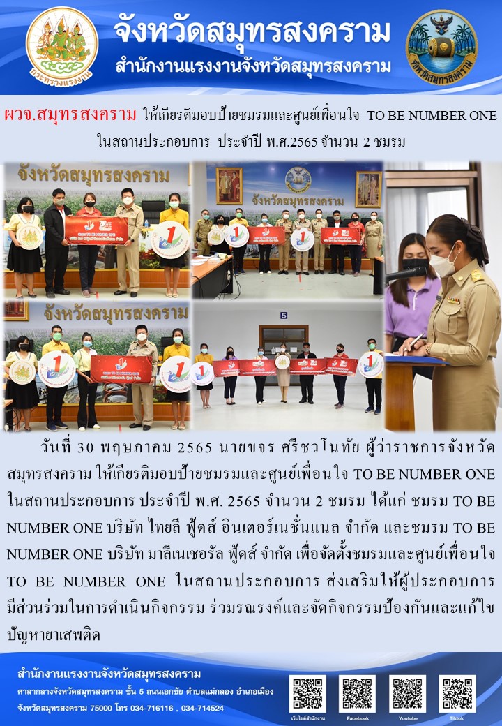 วันที่ 30 พฤษภาคม 2565 นายขจร ศรีชวโนทัย ผู้ว่าราชการจังหวัดสมุทรสงคราม ให้เกียรติมอบป้ายชมรมและศูนย์เพื่อนใจ TO BE NUMBER ONE ในสถานประกอบการ ประจำปี พ.ศ. 2565 จำนวน 2 ชมรม ได้แก่ ชมรม TO BE NUMBER ONE บริษัท ไทยลี ฟู้ดส์ อินเตอร์เนชั่นแนล จำกัด และชมรม TO BE NUMBER ONE บริษัท มาลีเนเชอรัล ฟู้ดส์ จำกัด เพื่อจัดตั้งชมรมและศูนย์เพื่อนใจ TO BE NUMBER ONE ในสถานประกอบการ ส่งเสริมให้ผู้ประกอบการมีส่วนร่วมในการดำเนินกิจกรรม ร่วมรณรงค์และจัดกิจกรรมป้องกันและแก้ไขปัญหายาเสพติด