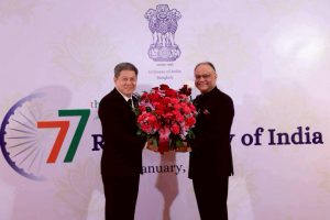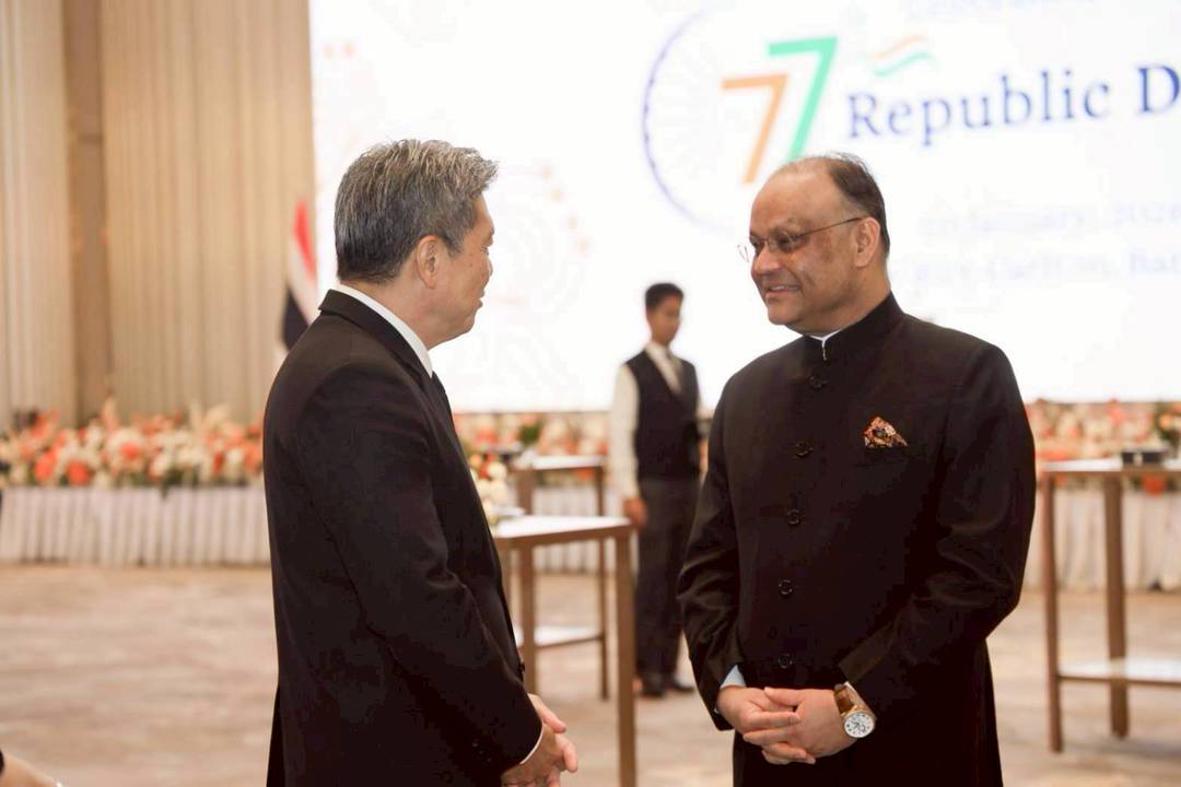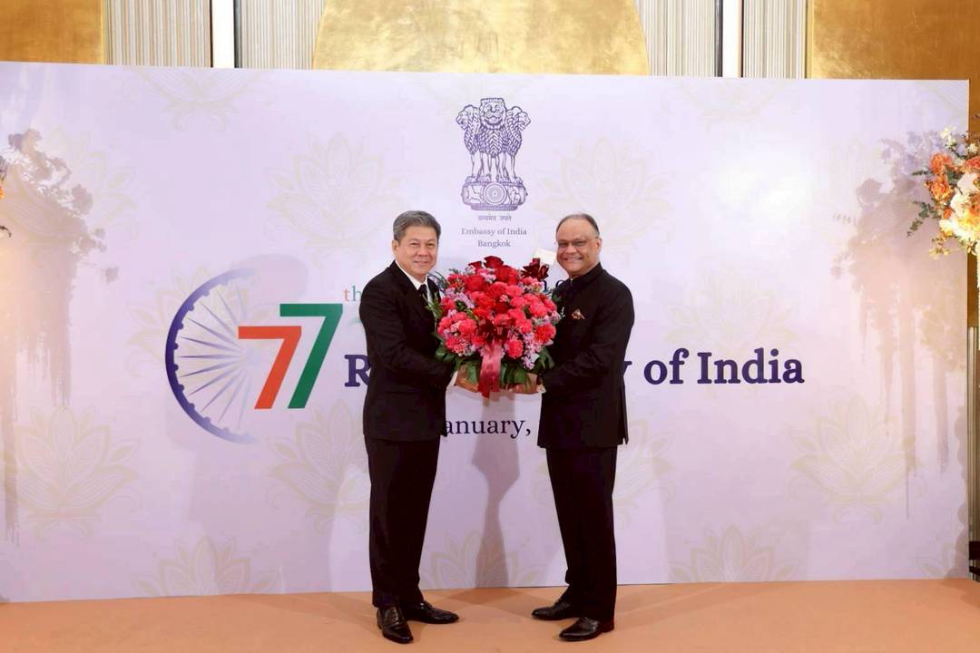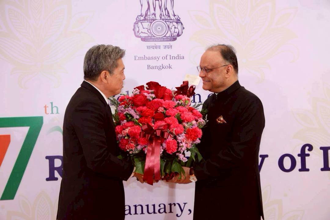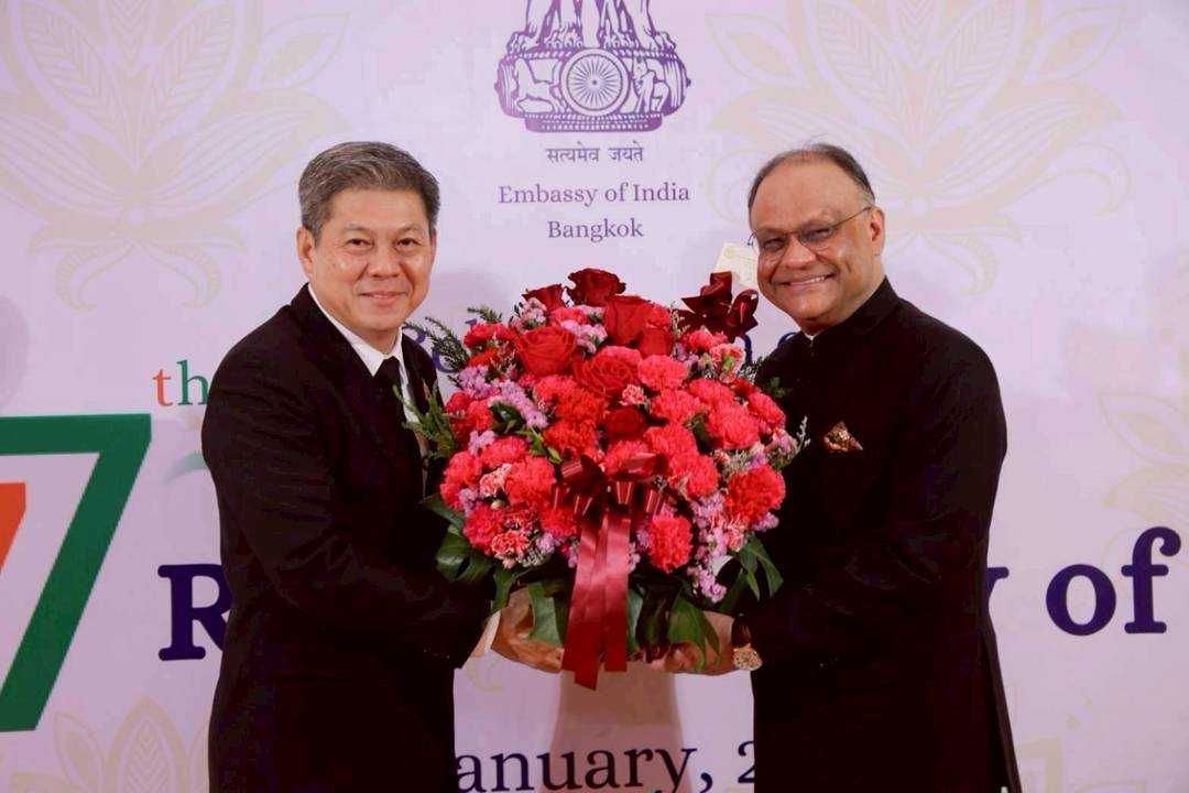 วันที่ 20 มกราคม 2569 เวลา 18.30 น. พันตำรวจโท วรรณพงษ์ คชรักษ์ ปลัดกระทรวงแรงงาน มอบหมายให้ นายศักดินาถ สนธิศักดิ์โยธิน ผู้ช่วยปลัดกระทรวงแรงงาน เป็นผู้แทนมอบแจกันดอกไม้ ร่วมแสดงความยินดีเนื่องในงานวันชาติสาธารณรัฐอินเดีย โดยมี นายนาเกช ซิงห์ (MR. NAGESH SINGH) เอกอัครราชทูตสาธารณรัฐอินเดียประจำประเทศไทย เป็นผู้รับมอบและให้การต้อนรับในครั้งนี้ ณ ห้องแกรนด์ บอลรูม โรงแรมเดอะริทซ์-คาร์ลตัน ถนนวิทยุ แขวงลุมพินี เขตปทุมวัน กรุงเทพมหานคร
