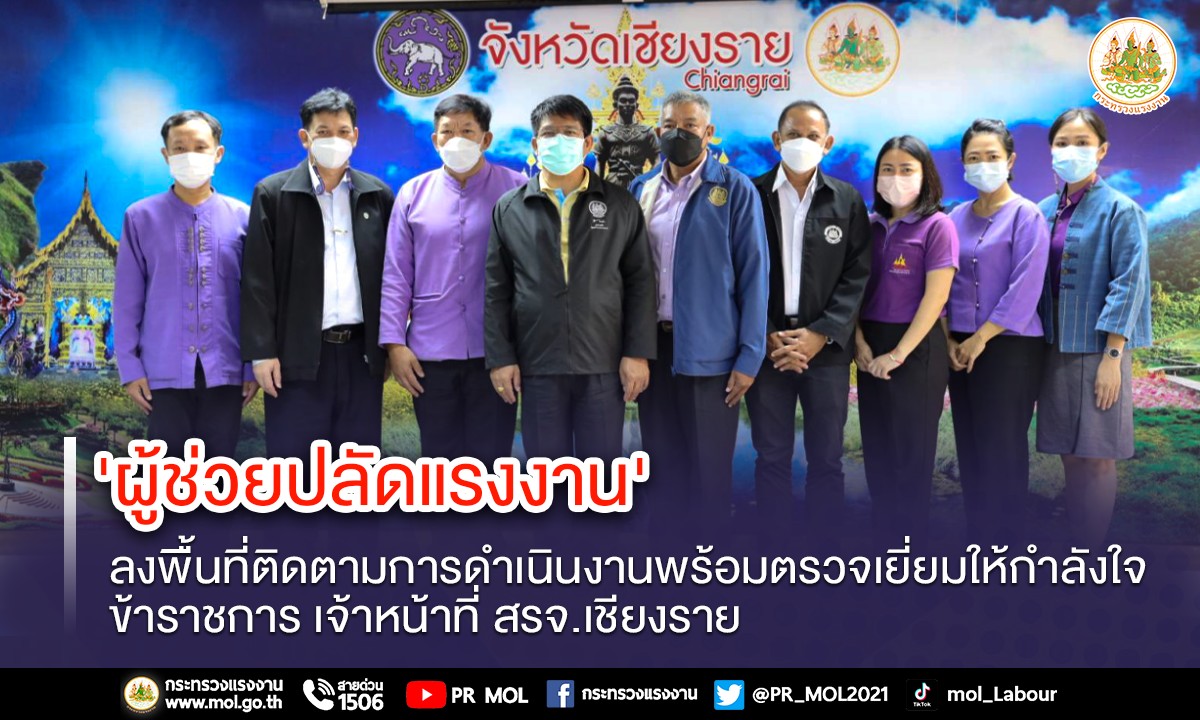 วันที่ 18 สิงหาคม 2565 ว่าที่ร้อยตรีสมศักดิ์ พรหมดำ ผู้ช่วยปลัดกระทรวงแรงงาน ลงพื้นที่จังหวัดเชียงราย ตรวจเยี่ยมติดตามการดำเนินงานตามภารกิจกระทรวงแรงงาน พร้อมรับฟังปัญหา อุปสรรค ข้อเสนอแนะ ของสำนักงานแรงงานจังหวัดเชียงราย โดยมี นายขจร วงศ์สวย แรงงานจังหวัดเชียงราย ข้าราชการ และเจ้าหน้าที่ให้การต้อนรับ ณ ห้องประชุมศูนย์ราชการกระทรวงแรงงานจังหวัดเชียงราย อำเภอเมืองเชียงราย จังหวัดเชียงราย