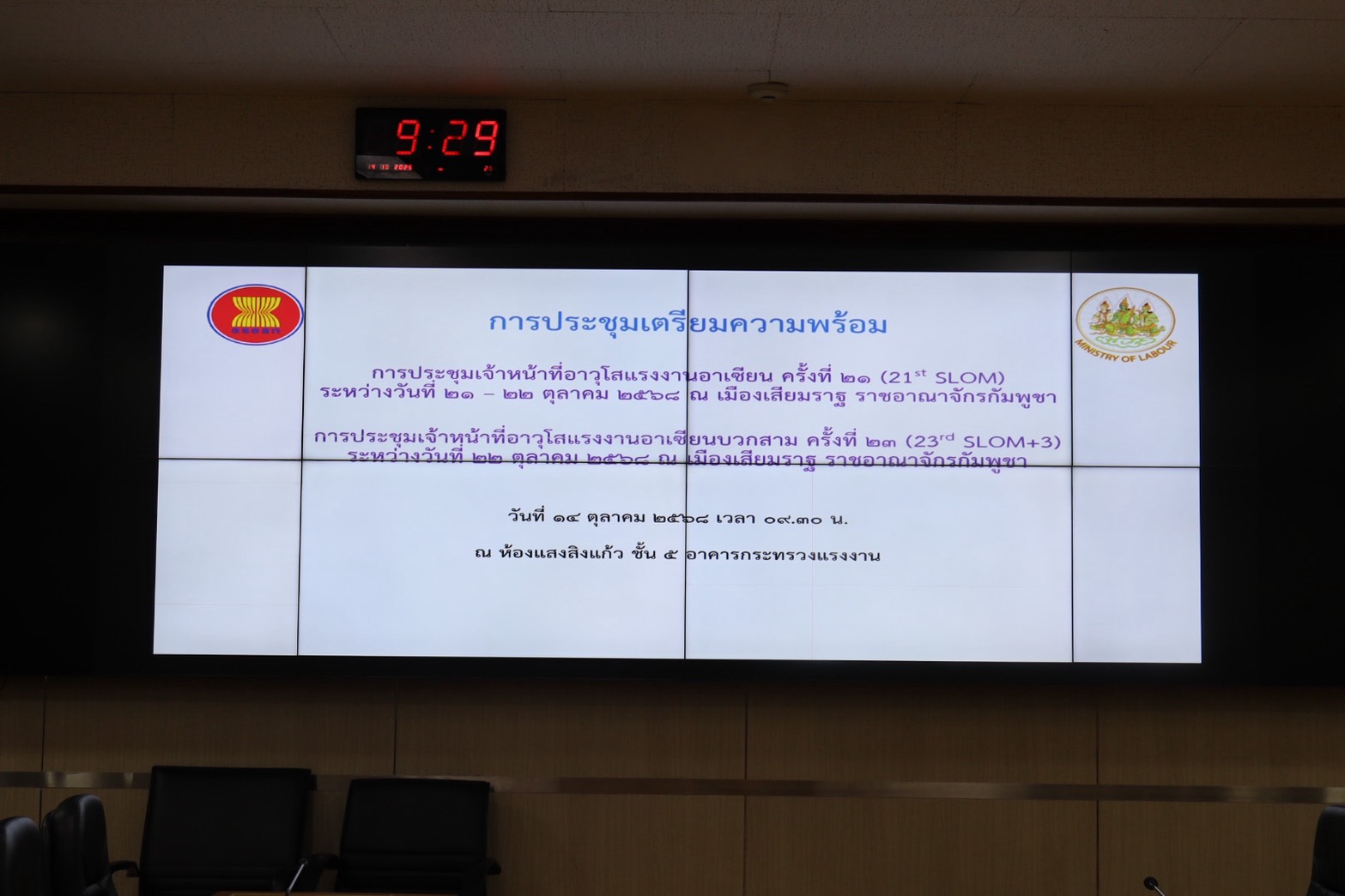 วันที่ 14 ตุลาคม 2568 เวลา 09.30 น. นายศักดินาถ สนธิศักดิ์โยธิน ผู้ช่วยปลัดกระทรวงแรงงาน เป็นประธานการประชุมเตรียมการสำหรับการประชุมเจ้าหน้าที่อาวุโสแรงงานอาเซียน ครั้งที่ 21 (21st SLOM) ระหว่างวันที่ 21-22 ตุลาคม 2568 ณ เมืองเสียมราฐ ราชอาณาจักรกัมพูชา และการประชุมเจ้าหน้าที่อาวุโสแรงงานอาเซียนบวกสาม ครั้งที่ 23 (23rd SLOM+3) ในวันที่ 22 ตุลาคม 2568 ณ เมืองเสียมราฐ ราชอาณาจักรกัมพูชา ( ผ่านระบบการประชุมทางไกล) โดยมีหน่วยงานที่เกี่ยวข้องเข้าร่วมประชุม ณ ห้องประชุมประสงค์ รณะนันทน์ ชั้น 5 อาคารกระทรวงแรงงาน