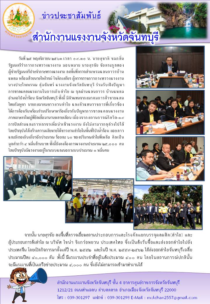 ผู้ช่วยรัฐมนตรีประจำกระทรวงแรงงาน ลงพื้นที่ชายแดนจังหวัดจันทบุรี เพื่อสรุปสถานการณ์และขับเคลื่อนนโยบายที่สำคัญและแก้ไขปัญหาด้านแรงงานในพื้นที่จังหวัดจันทบุรี