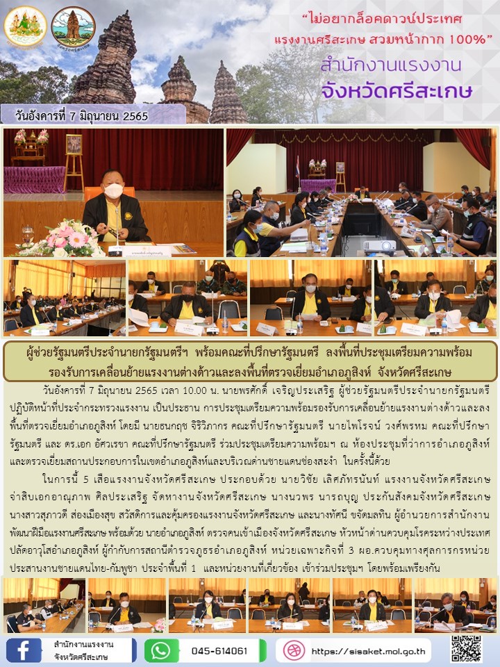 ผู้ช่วยรัฐมนตรีประจำนายกรัฐมนตรีฯ พร้อมคณะที่ปรึกษารัฐมนตรี ลงพื้นที่ประชุมเตรียมความพร้อมรองรับการเคลื่อนย้ายแรงงานต่างด้าวและลงพื้นที่ตรวจเยี่ยมอำเภอภูสิงห์ จังหวัดศรีสะเกษ