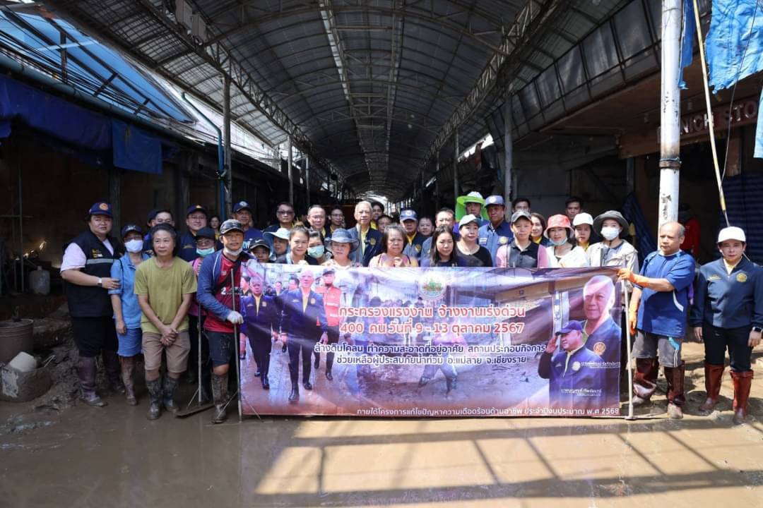 วันที่ 12 ตุลาคม 2567 นายสันติ นันตสุวรรณ ผู้ตรวจราชการกระทรวงแรงงาน ร่วมคณะ นายพิพัฒน์ รัชกิจประการ รัฐมนตรีว่าการกระทรวงแรงงาน นายบุญสงค์ ทัพชัยยุทธ์ ปลัดกระทรวงแรงงาน และผู้บริหารกระทรวงแรงงาน ลงพื้นที่ตรวจเยี่ยมการดำเนินโครงการแก้ไขปัญหาความเดือดร้อนด้านอาชีพของกระทรวงแรงงาน ดำเนินการการจ้างงานตั้งแต่วันที่ 9 – 13 ตุลาคม 2567 บูรณาการร่วมกับเทศบาลตำบลแม่สาย เทศบาลตำบลแม่สายมิตรภาพ และอบต.ป่าตึง ผู้ใหญ่บ้าน และชาวบ้านในชุมชน เพื่อชำระล้างทำความสะอาดถนน อาคารบ้านเรือน คู คลองระบายน้ำ จำนวน 4 จุด ได้แก่ ชุมชนเกาะทราย ตลาดนัดสายลมจอย ชุมชนไม้ลุงขน และ ชุมชนเหมืองแดง ตำบลแม่สาย อำเภอแม่สาย จังหวัดเชียงราย เพื่อให้การสัญจรได้รับความสะดวก ฟื้นฟูสภาพความเป็นอยู่ทำให้ประชาชนกลับมาประกอบอาชีพเป็นปกติโดยเร็วต่อไป
