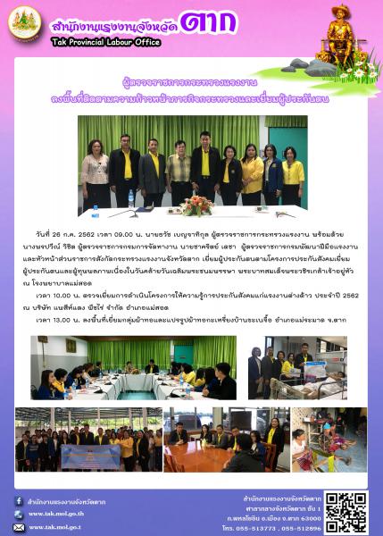 ผู้ตรวจราชการกระทรวงแรงงาน ลงพื้นที่จังหวัดตาก เข้าตรวจติดตามความก้าวหน้าภารกิจกระทรวงและเยี่ยมผู้ประกันตน