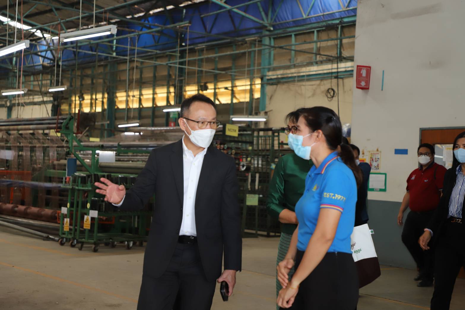 At 10.45 hours, the Ministry of Labour’s Inspector-General, Mr. Somchai Morakotsriwan, and a delegation visited companies in the area that import foreign workers to inspect and protect the rights of foreign workers to be treated equally as Thai workers according to the law. The Human Resources Manager of Khon Kaen Fishing Net Co., Ltd., Maha Sarakham Branch, Mrs. Preeya Chaiyasan, and heads of government agencies under the Ministry of Labour in Maha Sarakham Province gave a welcome at Khon Kaen Fishing Net Co., Ltd., Maha Sarakham Branch, located at No. 85, Moo 5, Maha Sarakham-Wapi Pathum Road, Waeng Nang Subdistrict, Mueang Maha Sarakham District, Maha Sarakham Province. The company manufactures and assembles nets and fishing nets. The Maha Sarakham branch has a specific production process in the weaving processes. There are 454 employees, divided into 414 Thais and 40 Burmese workers. Khon Kaen Fishing Net Co., Ltd. has a policy to legally import foreign workers, currently all imported under an MOU.