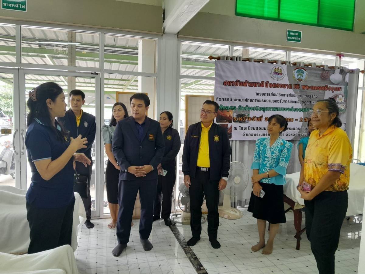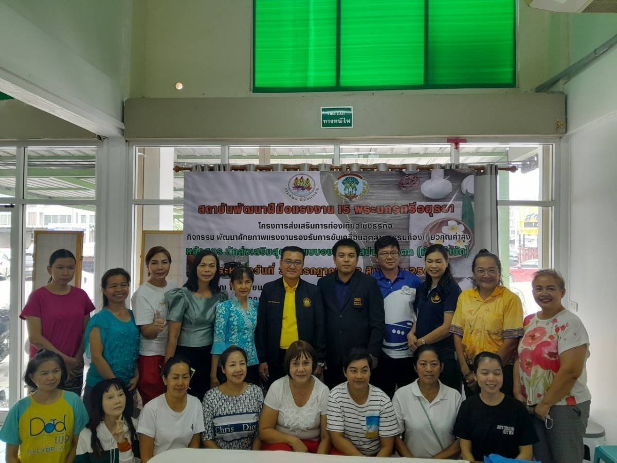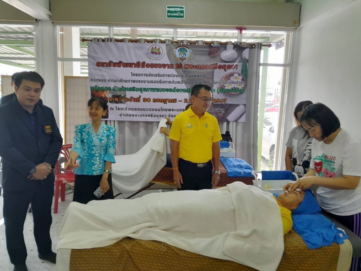วันที่ 1 สิงหาคม 2567 นายสันติ นันตสุวรรณ ผู้ตรวจราชการกระทรวงแรงงาน ตรวจเยี่ยมโครงการส่งเสริมการท่องเที่ยวเชิงธุรกิจกิจกรรมพัฒนาศักยภาพแรงงานรองรับการขับเคลื่อนอุตสาหกรรมท่องเที่ยวคุณภาพสูงหลักสูตรนักส่งเสริมสุขภาพแบบองค์รวมสปาตะวันตก (หัตถบำบัด) ผู้เข้าร่วม 20 คน ระหว่างวันที่ 30 กรกฎาคม – 2 สิงหาคม 2567 ณ โรงเรียนสอนนวดแผนไทยพระนคร ตำบลคลองสวนพลู อำเภอพระนครศรีอยุธยา จังหวัดพระนครศรีอยุธยา