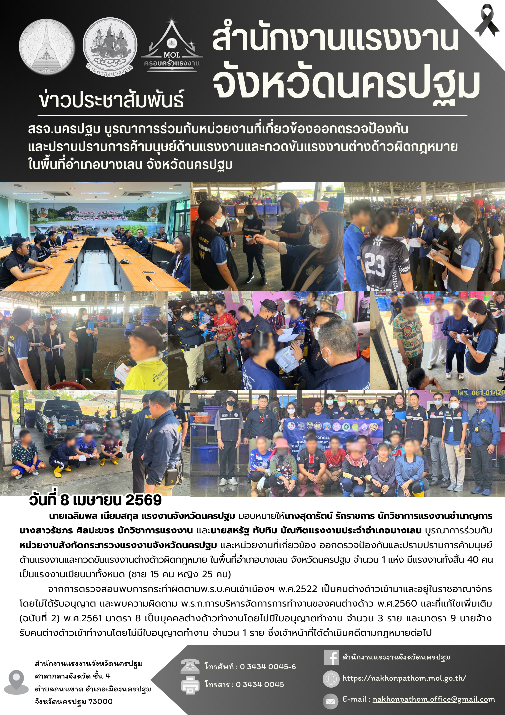 สรจ.นครปฐม บูรณาการร่วมกับหน่วยงานที่เกี่ยวข้องออกตรวจป้องกันและปราบปรามการค้ามนุษย์ด้านแรงงานและกวดขันแรงงานต่างด้าวผิดกฎหมาย ในพื้นที่อำเภอบางเลน จังหวัดนครปฐม
