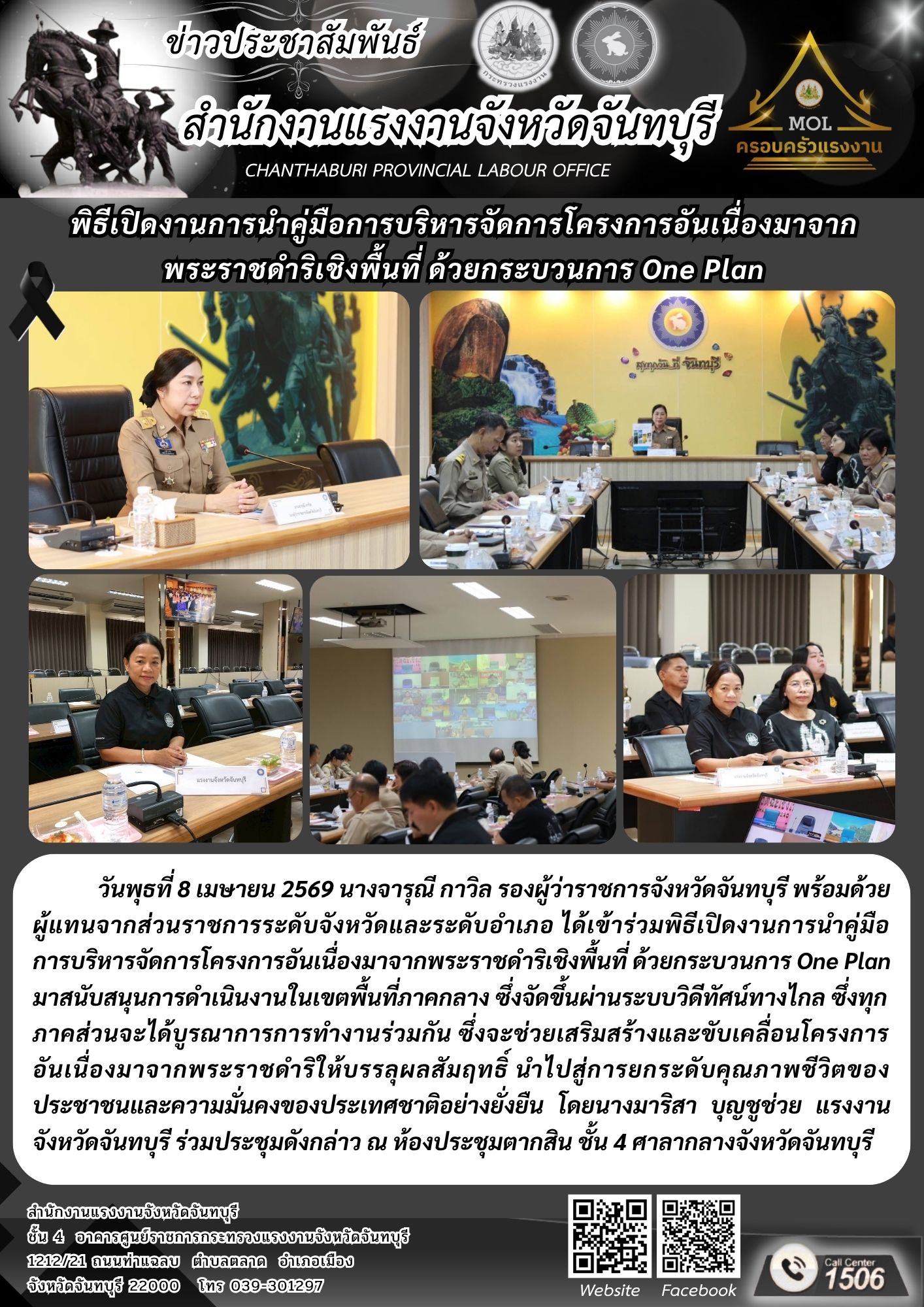 แรงงานจังหวัดจันทบุรี ร่วมพิธีเปิดงานการนำคู่มือการบริหารจัดการโครงการอันเนื่องมาจากพระราชดำริเชิงพื้นที่ ด้วยกระบวนการ One Plan