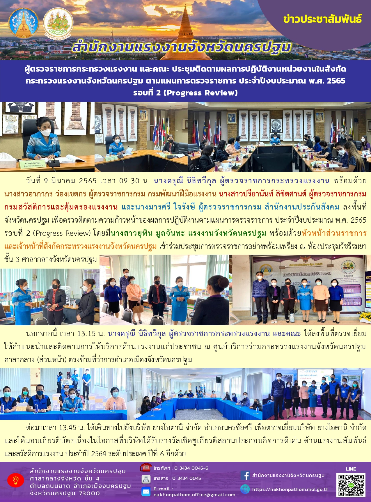 ผู้ตรวจราชการกระทรวงแรงงานและคณะ ร่วมประชุมติดตามผลการปฏิบัติงานหน่วยงานในสังกัดกระทรวงแรงงานจังหวัดนครปฐม ตามแผนการตรวจราชการ ประจำปีงบประมาณ พ.ศ. 2565 รอบที่ 2 (Progress Review)