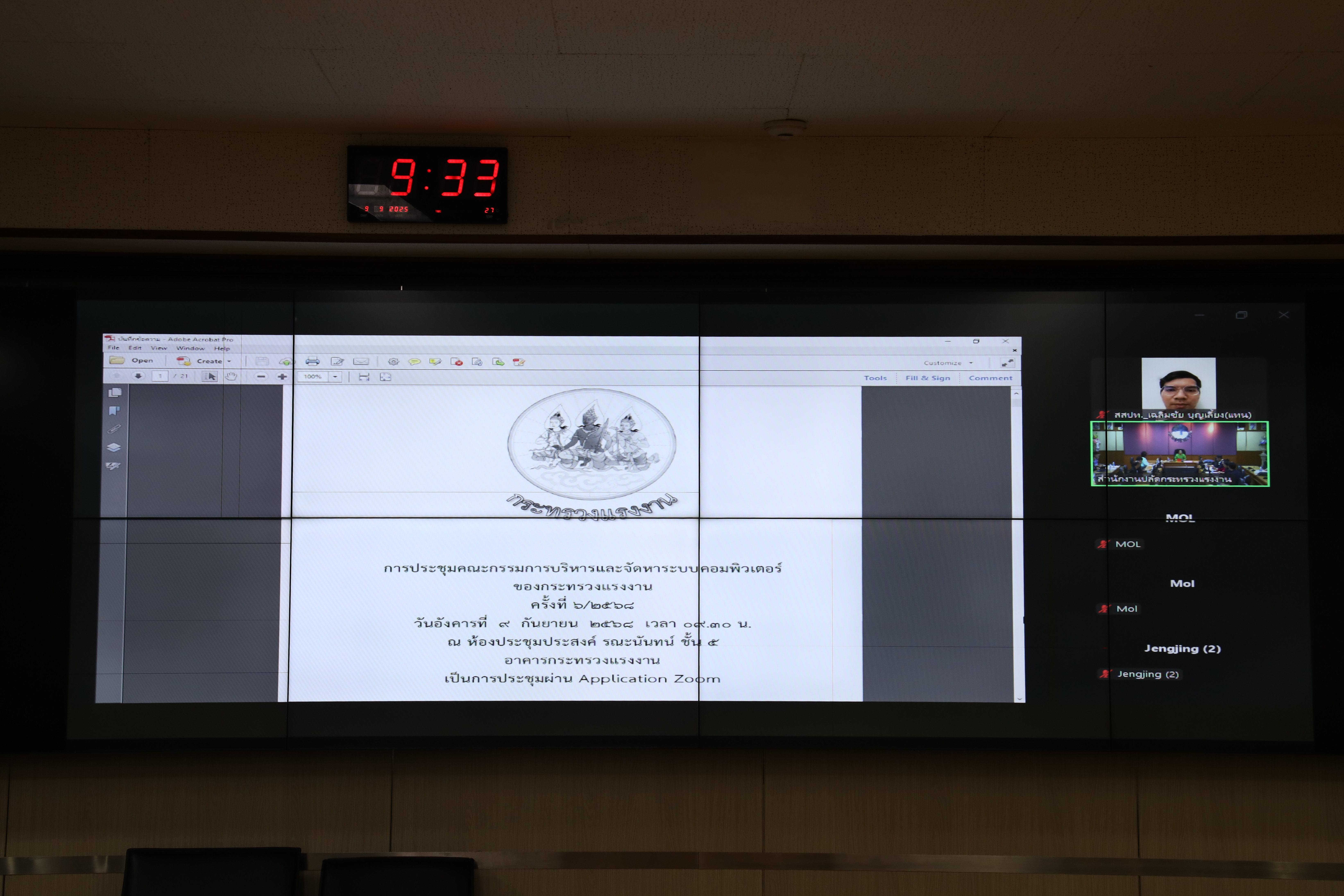 วันที่ 9 กันยายน 2568 เวลา 09.30 น. นางสาวจีระภา บุญรัตน์ ผู้ตรวจราชการกระทรวงแรงงาน เป็นประธานการประชุมคณะกรรมการบริหารและจัดหาระบบคอมพิวเตอร์ของกระทรวงแรงงาน ครั้งที่ 6/2568 และการประชุมผ่าน Application Zoom โดยมี ผู้บริหารกระทรวงแรงงาน และหน่วยงานที่เกี่ยวข้องเข้าร่วมการประชุม ณ ห้องประชุมประสงค์ รณะนันทน์ ชั้น 5 อาคารกระทรวงแรงงาน