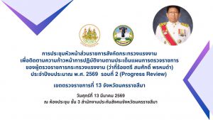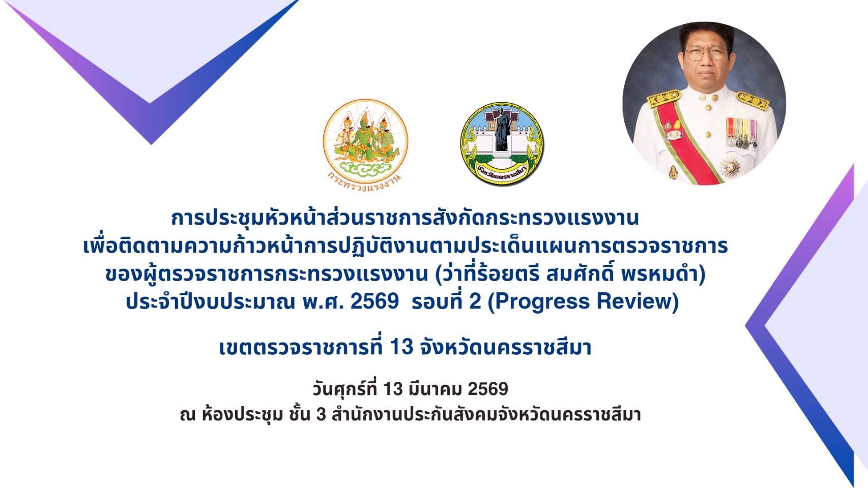 วันที่ 13 มีนาคม 2569 เวลา 09.00 น. ว่าที่ร้อยตรี สมศักดิ์ พรหมดำ ผู้ตรวจราชการกระทรวงแรงงาน เป็นประธานการประชุมสำนักงานแรงงานจังหวัดนครราชสีมา เพื่อตรวจติดตามความก้าวหน้าผลการปฏิบัติงานตามแผนการตรวจราชการของสำนักงานปลัดกระทรวงแรงงาน ประจำปี 2569 รอบที่ 2 (Progress Review) โดยมี นางสาวปภิญญา ทองสมจิตร แรงงานจังหวัดนครราชสีมา เจ้าหน้าที่ และอาสาสมัครแรงงาน เข้าร่วมการประชุมด้วย ณ ห้องประชุม ชั้น 3 สำนักงานประกันสังคมจังหวัดนครราชสีมา