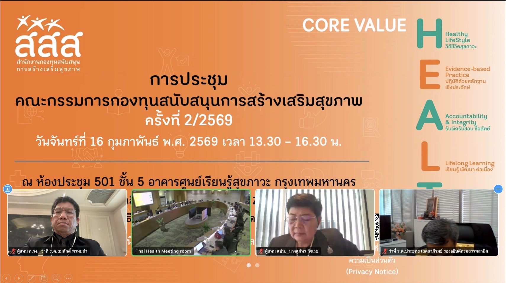 วันที่ 16 กุมภาพันธ์ 2569 เวลา 13.30 น. ว่าที่ร้อยตรี สมศักดิ์ พรหมดำ ผู้ตรวจราชการกระทรวงแรงงาน เข้าร่วมการประชุมคณะกรรมการกองทุนสนับสนุนการสร้างเสริมสุขภาพ ครั้งที่ 1/2569 ผ่านระบบสื่ออิเล็กทรอนิกส์ (Zoom Cloud Meeting) โดยมี นายโสภณ ซารัมย์ รองนายกรัฐมนตรี เป็นประธานการประชุม ผู้แทนหน่วยงานที่เกี่ยวข้องเข้าร่วมการประชุม ณ ห้องประชุม 501 ชั้น 5 อาคารศูนย์เรียนรู้สุขภาวะ กรุงเทพมหานคร