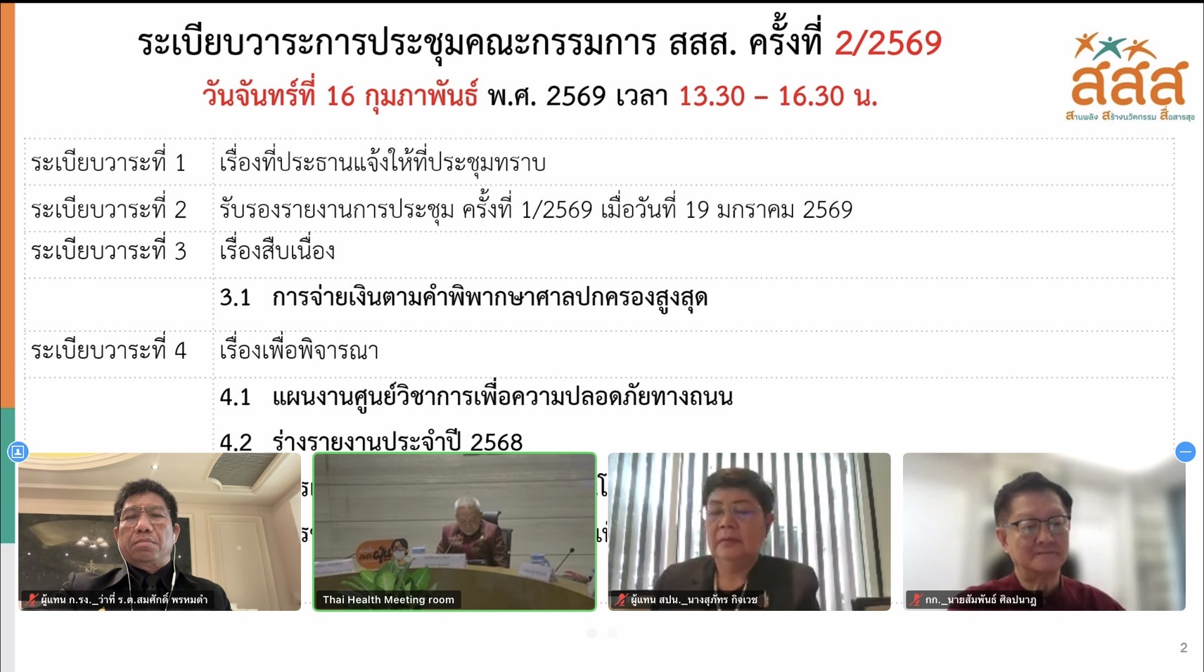 สำหรับการประชุมดังกล่าว ที่ประชุมได้รับทราบความก้าวหน้าผลการดำเนินงานของแผนการจัดการความปลอดภัยและปัจจัยเสี่ยงทางสังคม สรุปสถานการณ์อุบัติเหตุทางถนน เทศกาลปีใหม่ 2569 รายงานคณะอนุกรรมการนโยบายทางการเงิน การกำกับดูแลการตรวจสอบภายใน และผลงานการดำเนินงานของคณะกรรมการบริหารแผน 8 คณะ ในรอบเดือนที่ผ่านมา นอกจากนี้ ที่ประชุมยังได้พิจารณาแผนงานศูนย์วิชาการเพื่อความปลอดภัยทางถนน ร่างรายงานประจำปี 2568 ตลอดจนการแต่งตั้งคณะอนุกรรมการเทคโนโลยีสารสนเทศ เพื่อให้การดำเนินงานเป็นไปอย่างมีประสิทธิภาพ โปร่งใส และสอดคล้องกับยุทธศาสตร์การสร้างเสริมสุขภาพของประเทศ