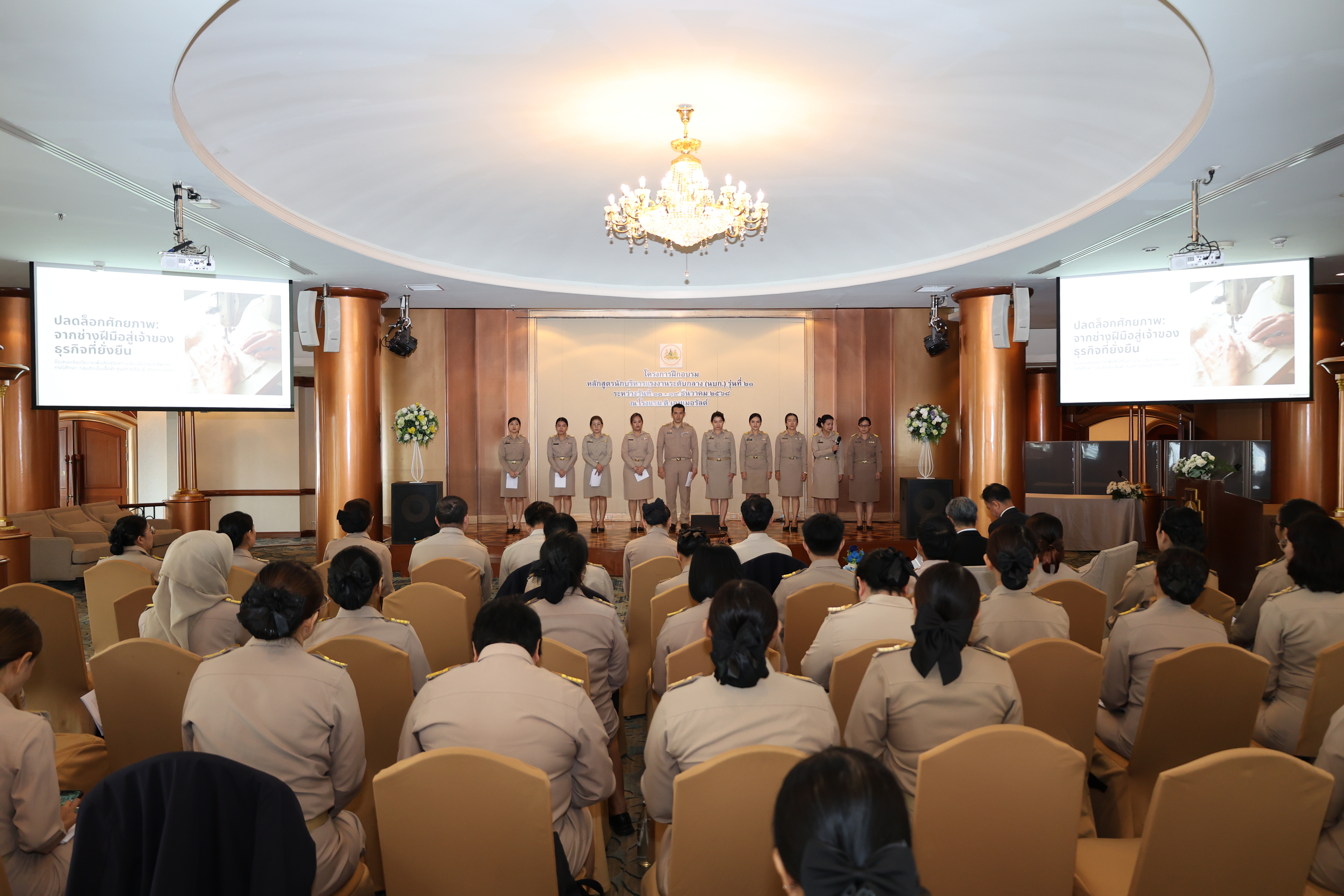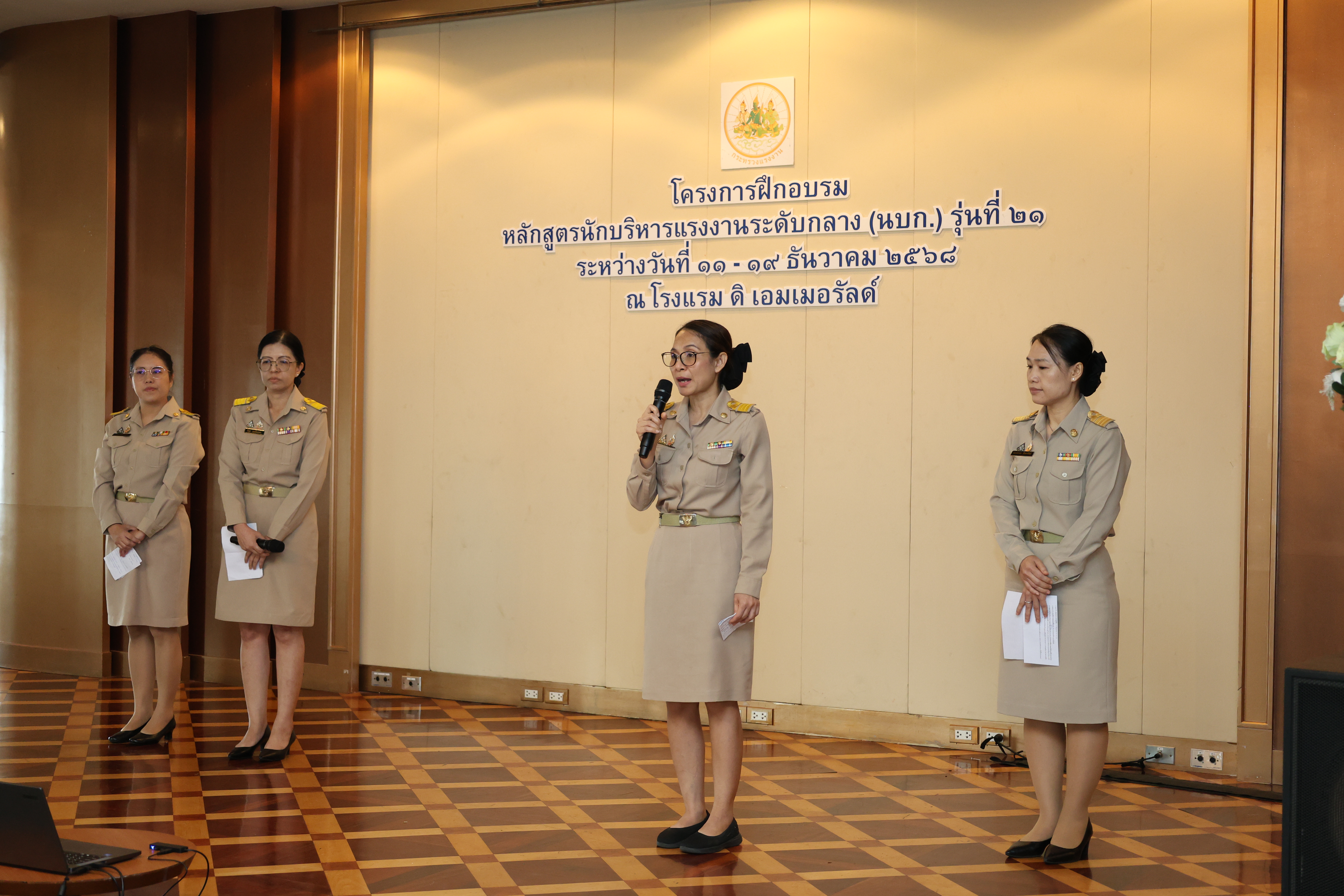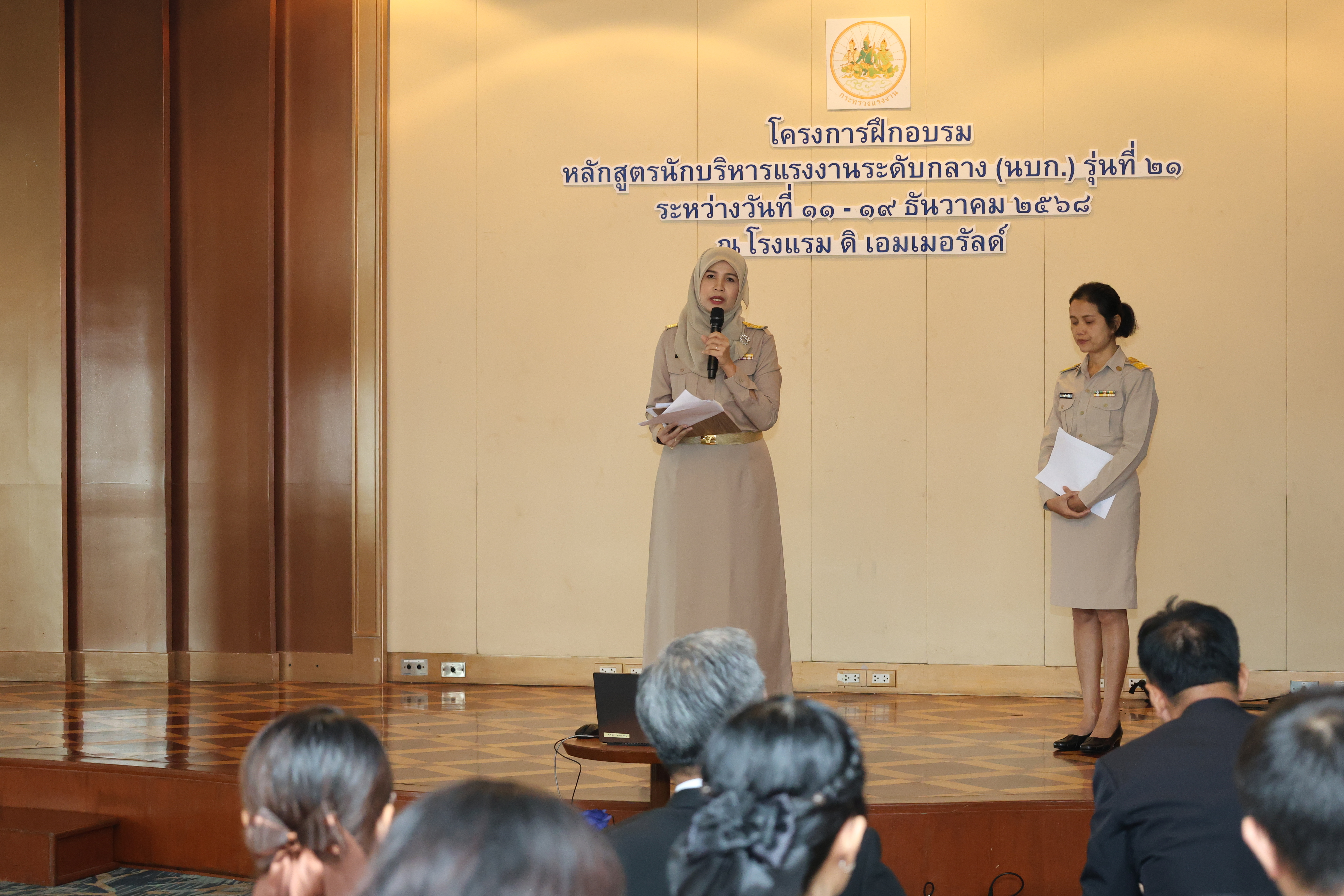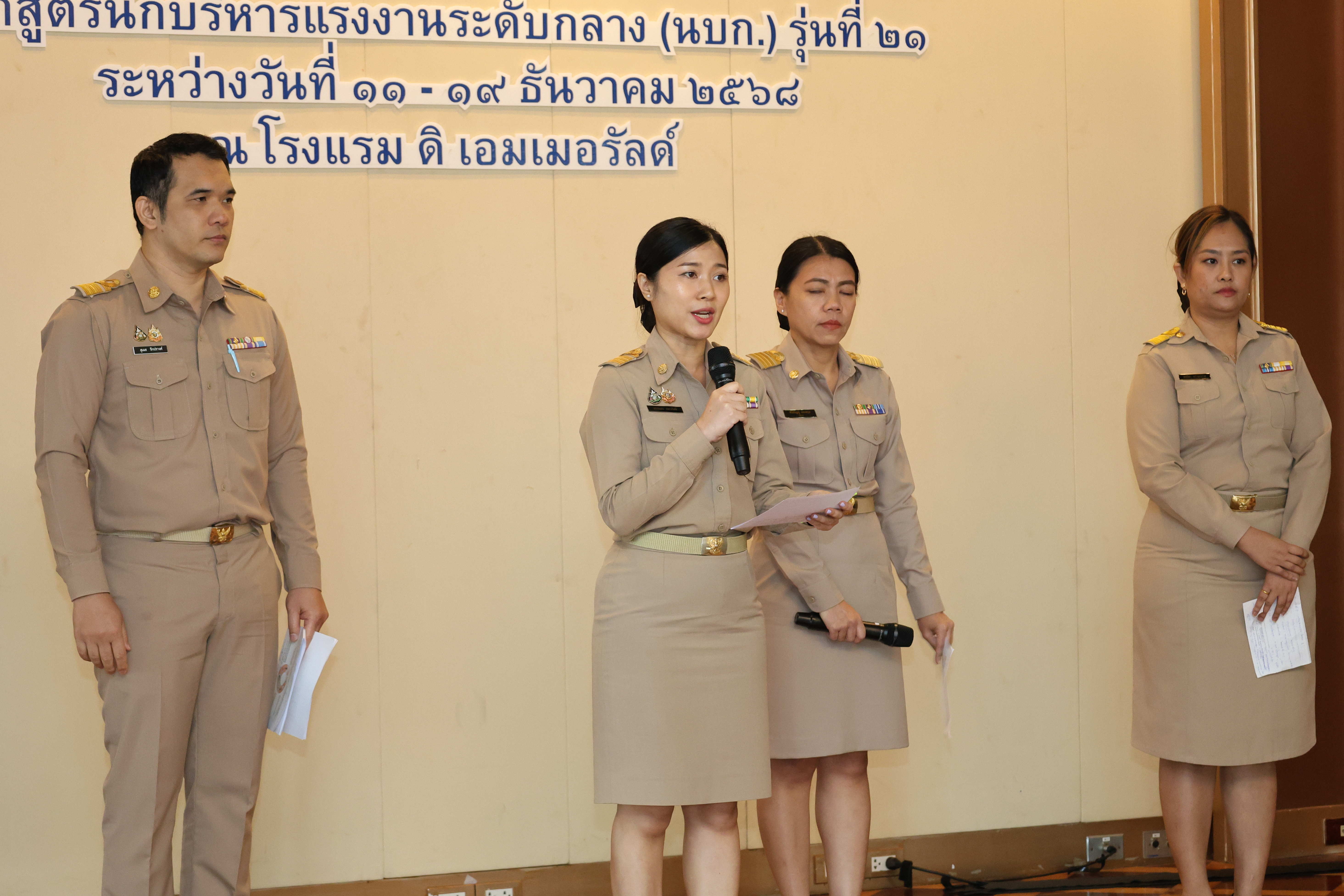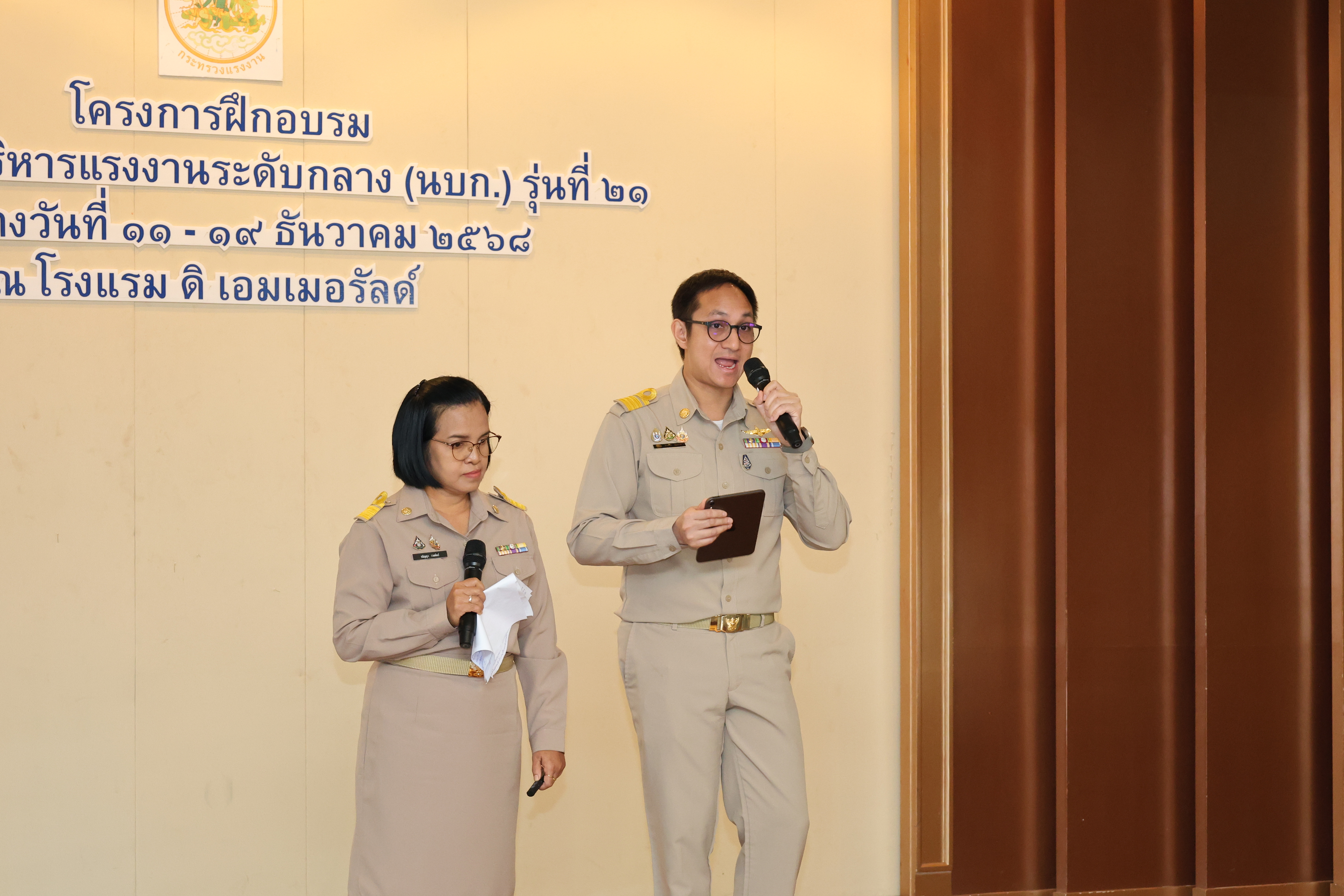 วันที่ 19 ธันวาคม 2568 เวลา 09.30 น. นายสิบหมื่นชัย โพธิสินธุ์ ผู้ตรวจราชการกระทรวงแรงงาน พร้อมด้วย นายศักดินาถ สนธิศักดิ์โยธิน ผู้ช่วยปลัดกระทรวงแรงงาน ร่วมรับฟังการนำเสนอและให้ข้อเสนอแนะในกิจกรรมการนำเสนอข้อเสนอเพื่อการพัฒนางานของผู้เข้ารับการฝึกอบรมหลักสูตรนักบริหารแรงงานระดับกลาง (นบก.) รุ่นที่ 21 ณ ห้องแกรนด์พาโนรามา ชั้น 14 โรงแรมดิ เอมเมอรัลด์ ถนนรัชดาภิเษก เขตดินแดง กรุงเทพมหานคร