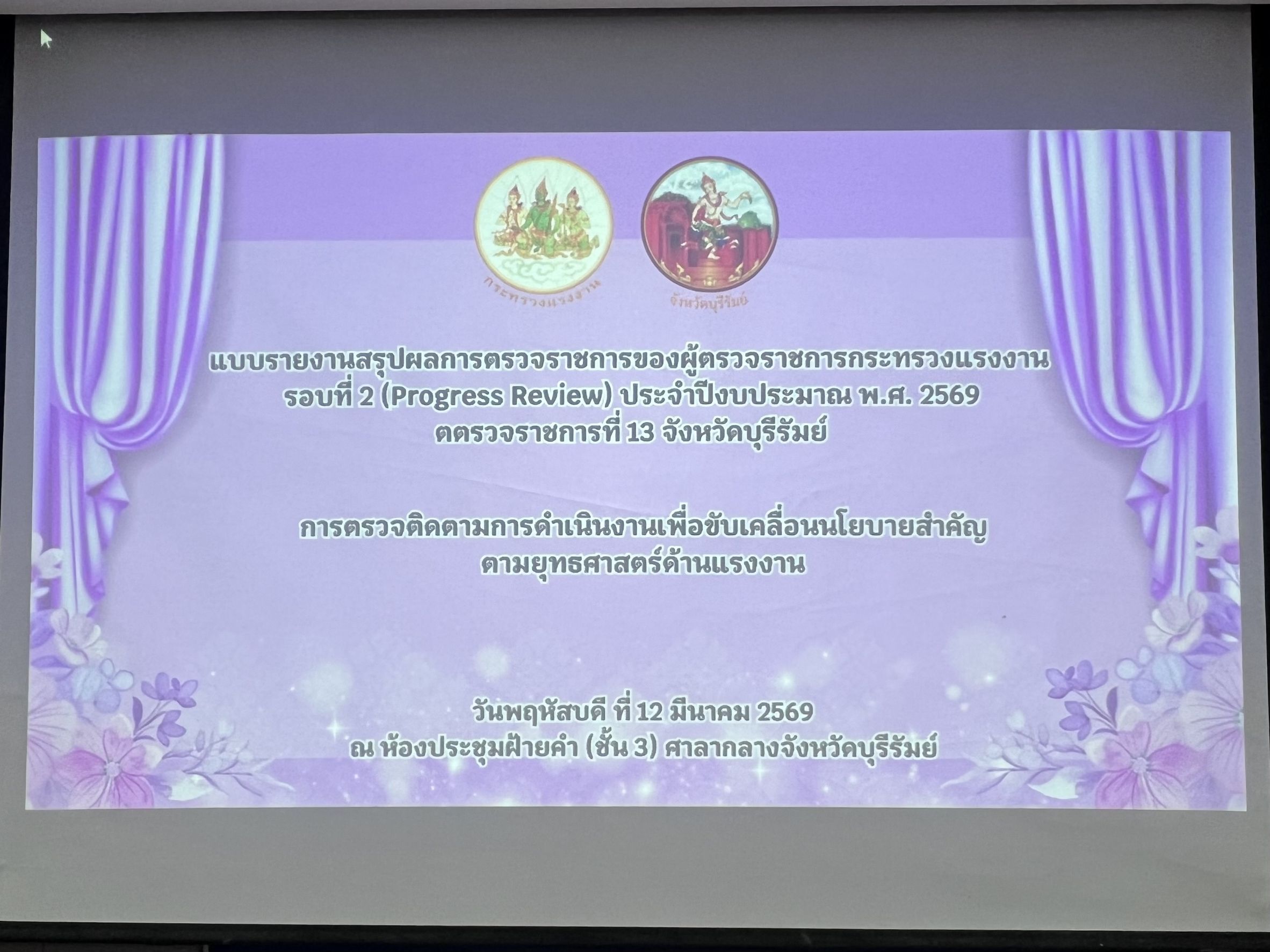 วันที่ 12 มีนาคม 2569 เวลา 10.00 น. ว่าที่ร้อยตรี สมศักดิ์ พรหมดำ ผู้ตรวจราชการกระทรวงแรงงาน เป็นประธานการประชุมหัวหน้าส่วนราชการสังกัดกระทรวงแรงงานจังหวัดบุรีรัมย์ เพื่อตรวจติดตามความก้าวหน้าของผลการปฏิบัติงานตามประเด็นแผนการตรวจราชการของผู้ตรวจราชการกระทรวงแรงงาน ประจำปีงบประมาณ พ.ศ. 2569 รอบที่ 2 (Progress Review) เพื่อรับฟังความก้าวหน้าและปัญหาอุปสรรคในการขับเคลื่อนภารกิจด้านแรงงานในระดับพื้นที่ โดยมี นางสาวนมิตา วายนต์ ผู้ตรวจราชการกรม สำนักงานประกันสังคม เข้าร่วมด้วย ณ ห้องประชุมสำนักงานแรงงานจังหวัดบุรีรัมย์ ศูนย์ราชการจังหวัดบุรีรัมย์ (ชั้น 2) ตำบลเสม็ด อำเภอเมืองบุรีรัมย์ จังหวัดบุรีรัมย์