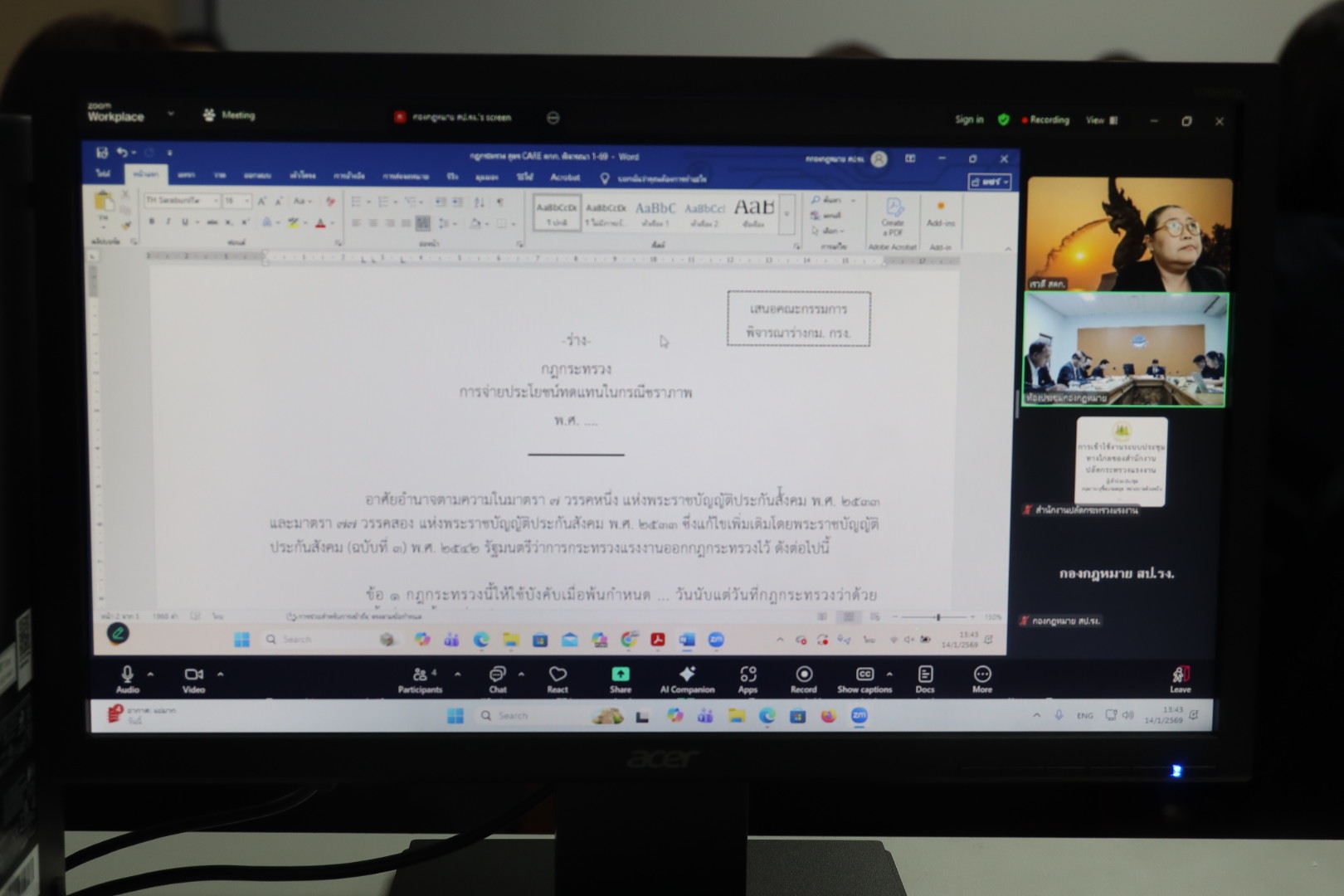 วันที่ 14 มกราคม 2569 เวลา 13.30 น. นายสิบหมื่นชัย โพธิสินธุ์ ผู้ตรวจราชการกระทรวงแรงงาน เป็นประธานการประชุมคณะกรรมการพิจารณาร่างกฎหมายของกระทรวงแรงงาน ครั้งที่ 1/2569 โดยมีเจ้าหน้าที่หน่วยงานที่เกี่ยวข้องเข้าร่วมด้วย ณ ห้องประชุมกองกฎหมาย ชั้น 11 อาคารกระทรวงแรงงาน และการประชุมผ่านทางระบบอิเล็กทรอนิกส์ Zoom Meeting