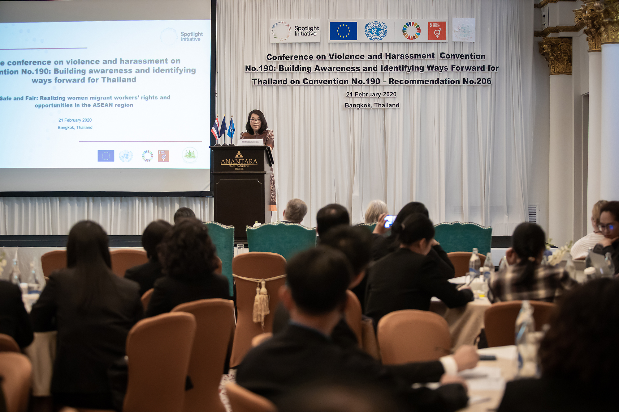วันนี้ (21 ก.พ. 63) เวลา 09.00 น. นายสุทธิ สุโกศล ปลัดกระทรวงแรงงาน มอบหมายให้ นางพัฒนา พันธุฟัก ผู้ตรวจราชการกระทรวงแรงงาน เป็นประธานร่วมเปิดการประชุมเพื่อสร้างการรับรู้และหารือทิศทางสําหรับประเทศไทยต่ออนุสัญญาฉบับที่ 190 และข้อแนะฉบับที่ 206 ว่าด้วยความรุนแรงและการล่วงละเมิดในโลกแห่งการทํางาน ณ ห้องพิมานแมน โรงแรมอนันตรา สยาม กรุงเทพฯ โดย ผู้ตรวจราชการกระทรวงแรงงาน กล่าวว่า “รัฐบาลไทยตระหนักถึงความสําคัญของแรงงาน และมีเป้าหมายพัฒนาคุณภาพชีวิตที่ดี ให้ผู้ใช้แรงงานทุกกลุ่มอาชีพ ทั้งในประเทศและต่างประเทศอย่างเท่าเทียม โดยรัฐบาลไทย ให้ความสําคัญกับการส่งเสริมและมุ่งมั่นในการขับเคลื่อนวาระการพัฒนาที่ยั่งยืน ค.ศ. 2030 ของสหประชาชาติ โดยการลดความเหลื่อมล้ำ และส่งเสริมงานที่มีคุณค่าสําหรับทุกคน โดยไม่ทิ้งใครไว้ข้างหลัง
