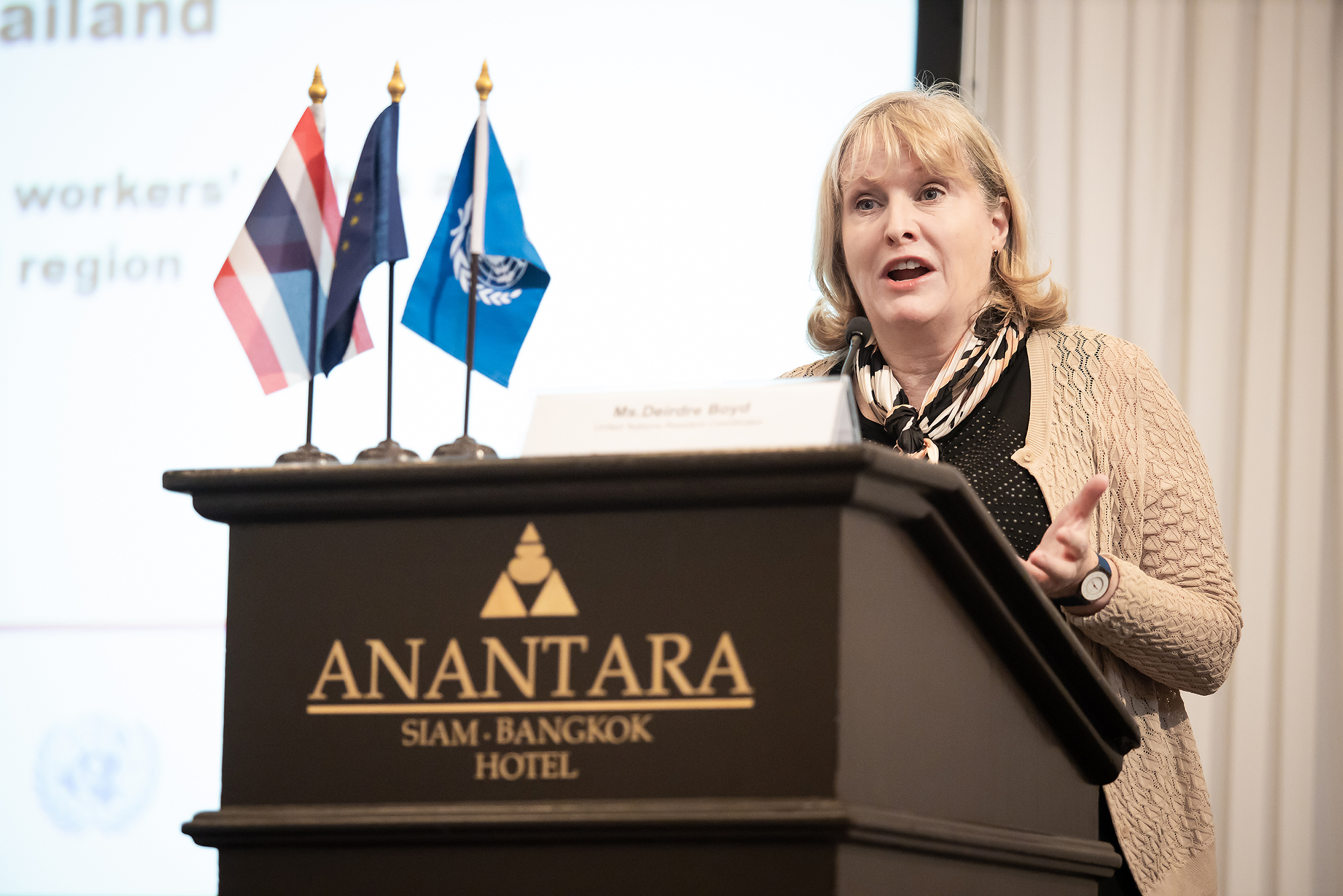 “การประชุมในวันนี้ถือเป็นโอกาสอันดีที่ผู้มีส่วนเกี่ยวข้องทุกฝ่ายในประเทศไทย จะได้เรียนรู้ไปพร้อมกัน เกี่ยวกับบทบัญญัติและการดําเนินการตามอนุสัญญาและข้อแนะ ดังกล่าวจากผู้เชี่ยวชาญขององค์การแรงงานระหว่างประเทศ และแลกเปลี่ยนความคิดเห็น เกี่ยวกับทิศทางการดําเนินการเกี่ยวกับตราสารทั้ง 2 ฉบับ ที่เหมาะสมกับบริบทและ สถานการณ์ของประเทศไทย ดิฉันหวังเป็นอย่างยิ่งว่าทุกท่านจะได้รับความรู้และ ประสบการณ์ เพื่อนํากลับไปขยายผลและใช้ประโยชน์ในการกําหนดนโยบาย แผนงาน และ มาตรการ หรือพัฒนากฎหมาย ระเบียบและแนวปฏิบัติที่เกี่ยวข้อง รวมทั้งเผยแพร่ให้ เครือข่ายของท่านได้รับทราบ เพื่อร่วมมือกันต่อสู้กับการใช้ความรุนแรงและการกระทําล่วง ละเมิดในโลกแห่งการทํางานในประเทศไทยตามเจตนารมณ์ต่อไป” ผู้ตรวจราชการกระทรวงแรงงาน กล่าวในท้ายที่สุด