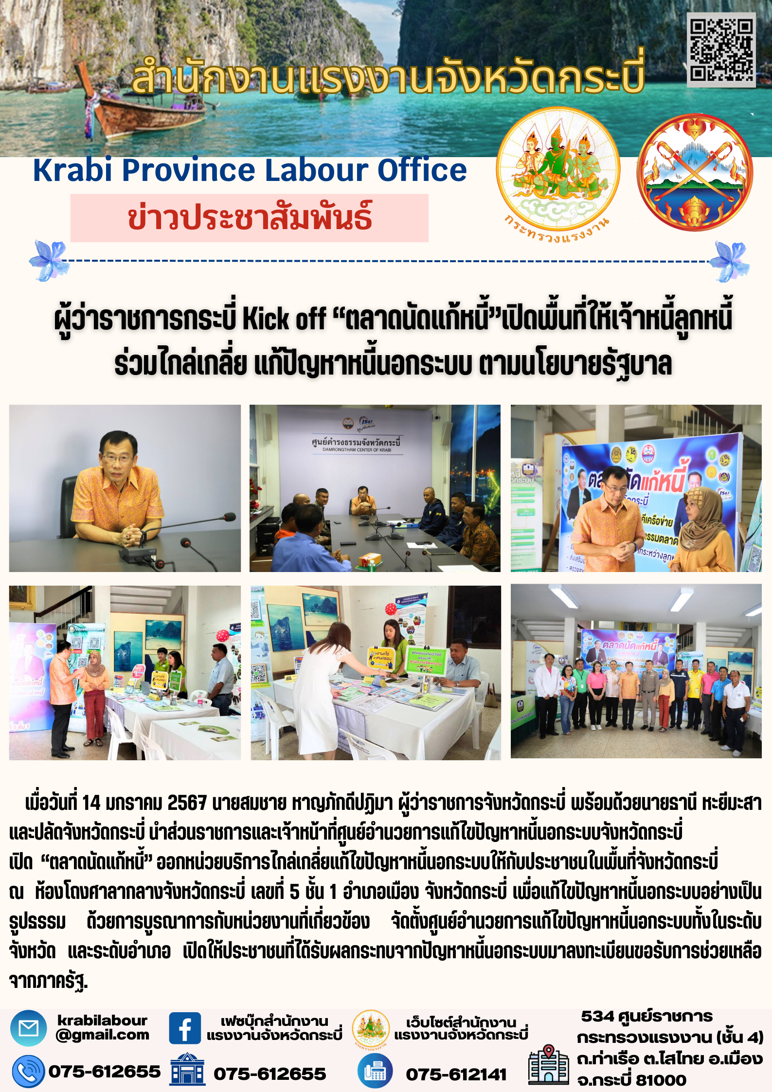 สรจ.กระบี่ Kick off “ตลาดนัดแก้หนี้”เปิดพื้นที่ให้เจ้าหนี้ลูกหนี้ ร่วมไกล่เกลี่ย แก้ปัญหาหนี้นอกระบบ ตามนโยบายรัฐบาล