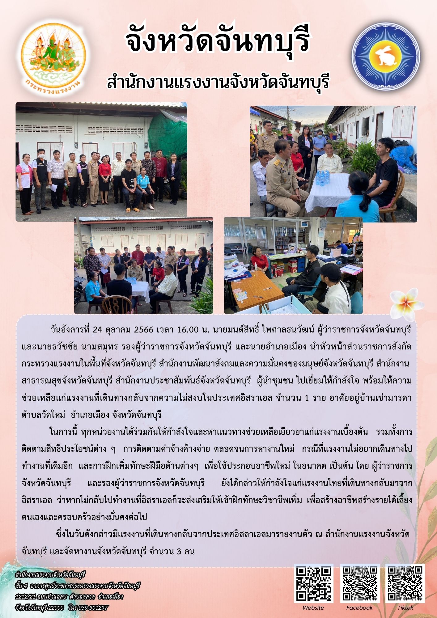 ผู้ว่าราชการจังหวัดจันทบุรี นำหัวหน้าส่วนราชการเยี่ยมให้กำลังใจ พร้อมให้ความช่วยเหลือแก่แรงงานที่เดินทางกลับจากความไม่สงบในประเทศอิสราเอล
